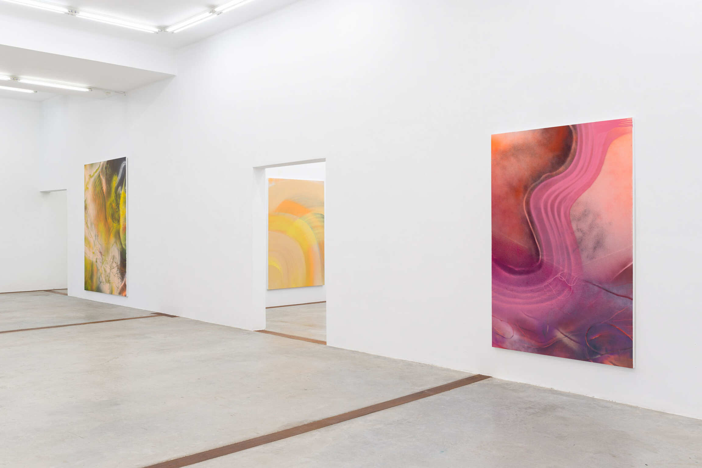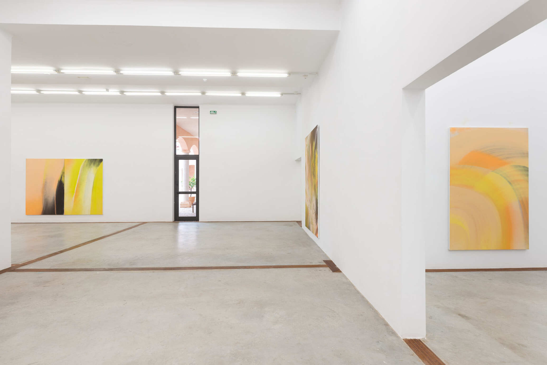 Andrea, in this exhibition, gently takes us by the hand and leads us through her vision of the island, a warm and welcoming land where the strokes of spray paint reflect in our eyes like flashes of sunlight. As we enter the room, we are greeted by an explosion of vitamin D, with warm shades of yellow and orange flooding the white cube and enveloping us in an atmosphere of light and warmth. The cream tones adhere to our skin like grains of sand, inviting us to immerse ourselves in the work “Labored Breath (the stone sets with you), 2024”. The black rays that cross the canvas resemble the momentary blindness caused by the intense sunlight, an intensity that blinds us and makes us squint to glimpse the daylight through our fingers.