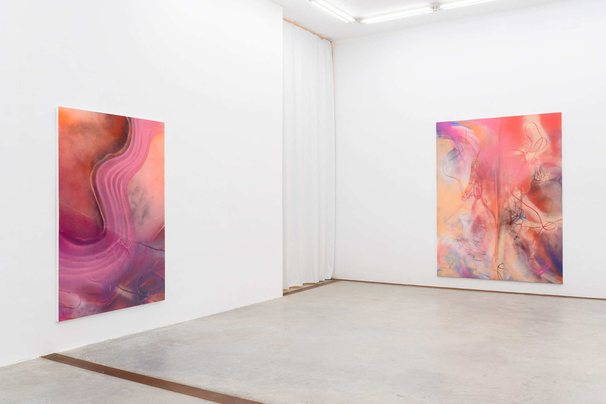 With each step we take, we delve deeper into the Mediterranean Sea, feeling the water slowly rise until we are submerged in a marine forest full of life. The colors darken, and we can feel the Posidonia brushing against our skin, greeting us alongside the marine creatures that inhabit Mallorca’s crystal-clear waters. We let ourselves be carried by the current and ascend to the surface to take a deep breath of air, flooded by sensations of nostalgia for those endless summers under the sun, with hair and skin sprinkled with salt. Days when the sun sets while we dine, and the sky turns a shade of pink we never imagined, like the tones we can appreciate in the works “Sunset Sandstone (The Sun Takes Everything), 2024” and “The Only Shrine I’ve Seen (Purple moon, magenta skies) 2024.”