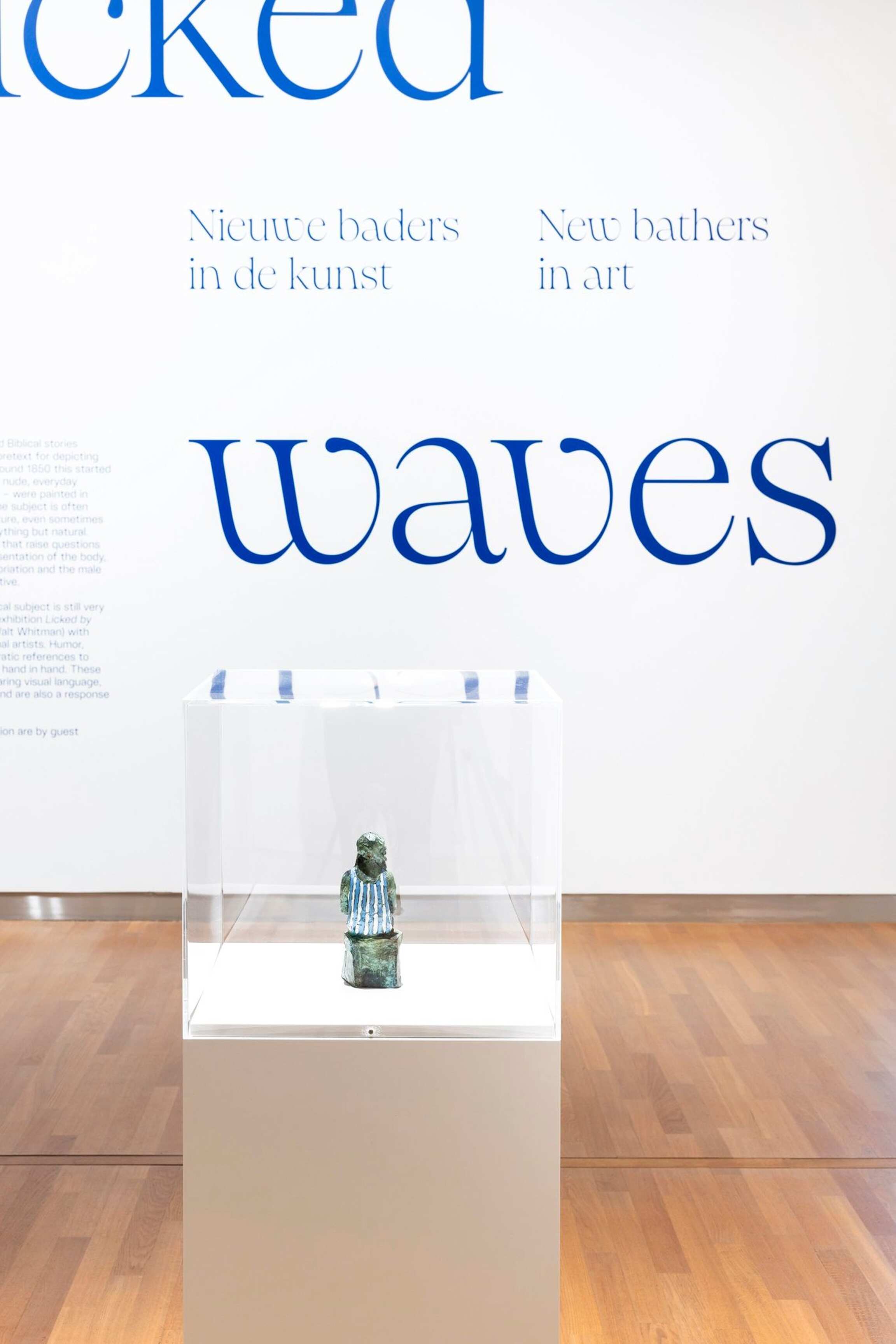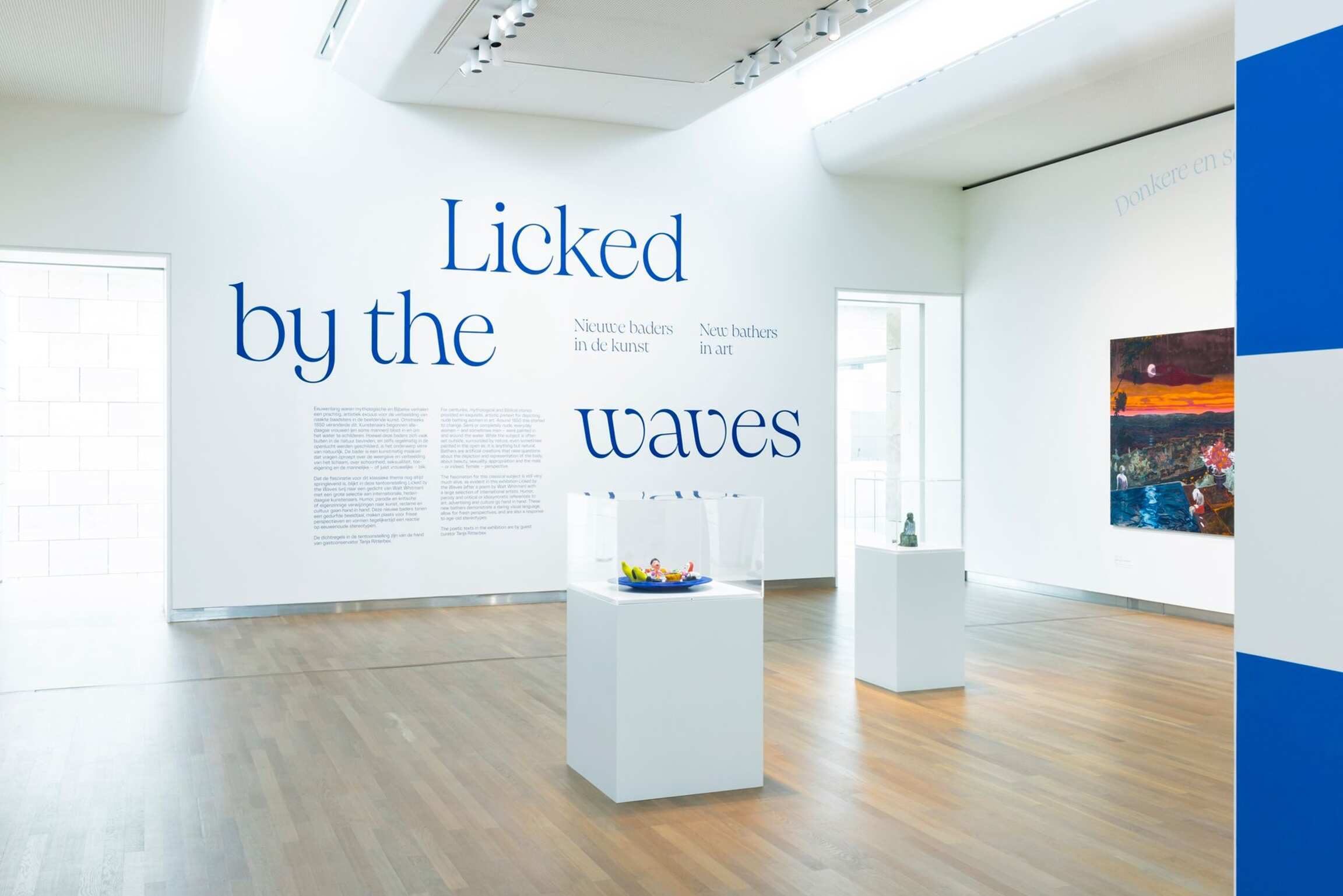 Licked by the Waves (after a poem by Walt Whitman) shows how modern-day artists allow people to play in the surf, to calmly float or to laze at the edge of a swimming pool. Under a blazing sun or in the dark, at night. The pleasure of a sensory experience can leap from the canvas. A surrender to water can be depicted serenely. A bather can almost even become one with the fluid elements. Bathers in the visual arts are not solely (nude) figures, with legs and buttocks, in the water. The surroundings, nature and the water landscape all play at least an equally important role. An Arcadian world in clear blue and green can surround the bather, but beach, sea and the horizon can also envelop the figure in a sultry, orange-red aquatic theatre. Immersion can cleanse and liberate, but also threaten.