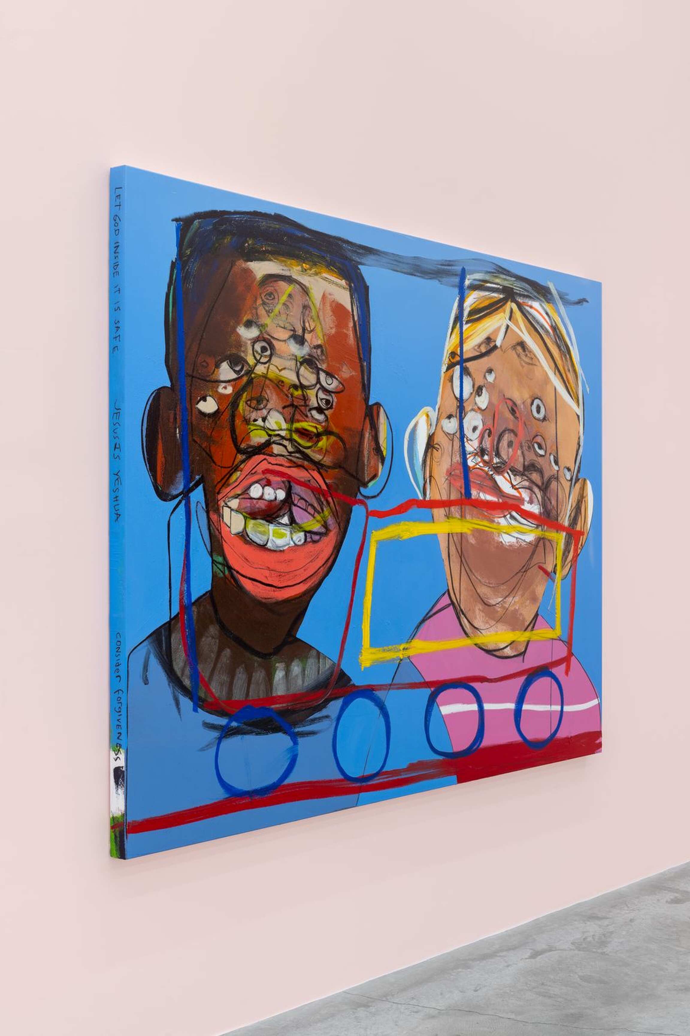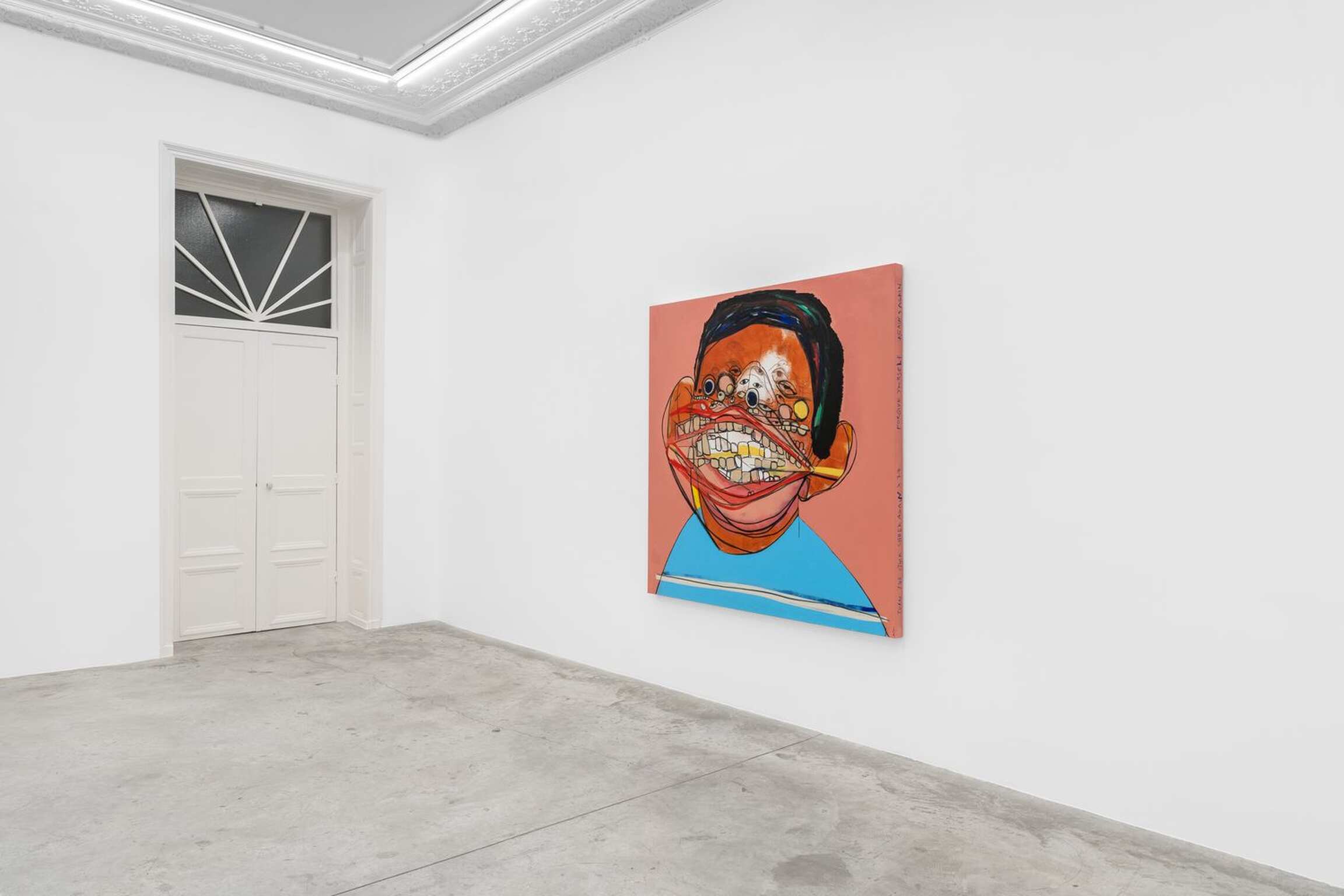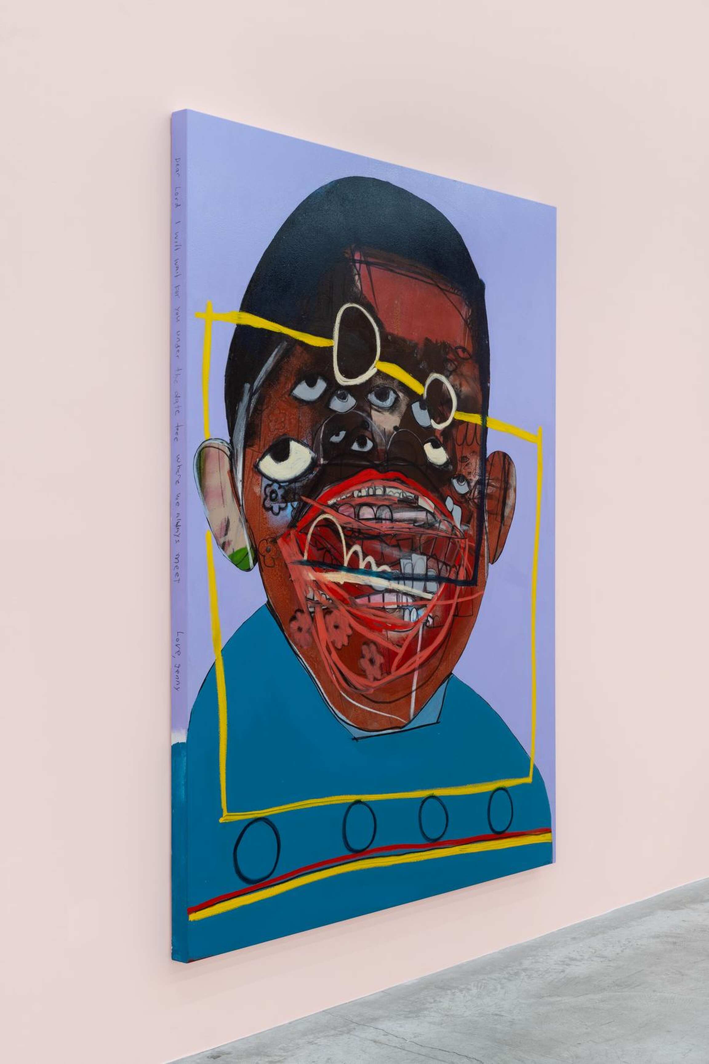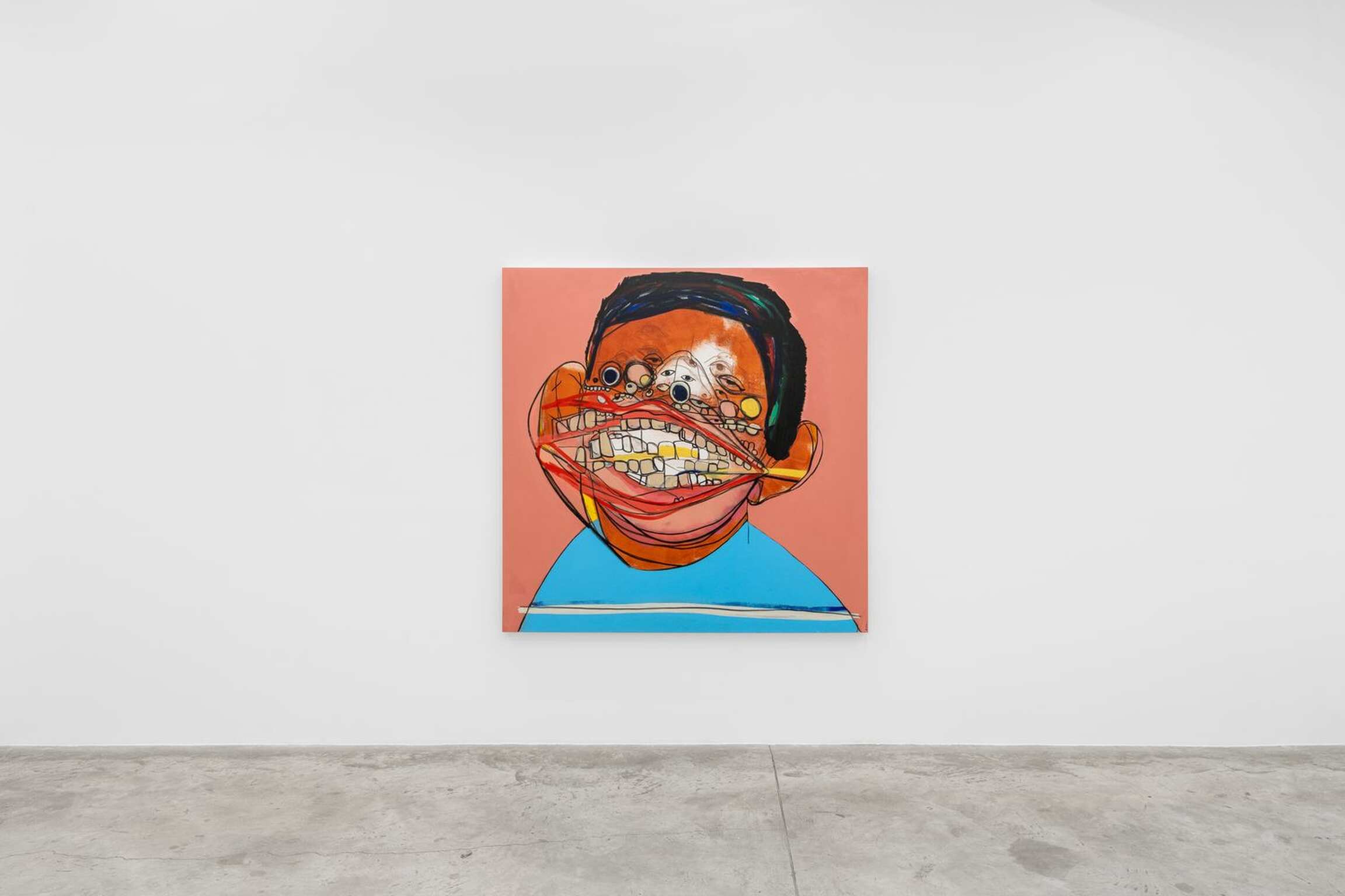 L’ensemble de toiles nouvelles qu’elle présente à la galerie Almine Rech à Paris (sa première exposition personnelle à Paris, la cinquième avec Almine Rech, qui l’exposa à New York, Aspen, Bruxelles et Londres) marque une évolution réjouissante : les personnages de « Parable of Nana » et de « Evidence of Grace » (ses deux précédents solo shows avec la galerie, respectivement à Londres en 2020 et Bruxelles en 2021), étaient affublés de dizaines d’yeux, comme s’ils signifiaient leur exploration curieuse et vorace du monde. Figés dans le mutisme, ces personnages graves et souvent renfrognés semblaient serrer des dents… Ils exprimaient autrement leur personnalité, leur histoire, leurs sentiments. Le nouveau panthéon qui forme « Sweet Jesus » (le titre qu’elle a donné à son exposition parisienne, et qui à lui seul est tout un programme) est bouches ouvertes et toutes dents dehors – souvent bien plus de dents que de raison, qui font écho à bien plus que deux yeux par visage. Ses personnages, semble t’il, se sont mis à sourire. A vociférer, peut-être, à chanter, pourquoi pas, à parler, assurément.