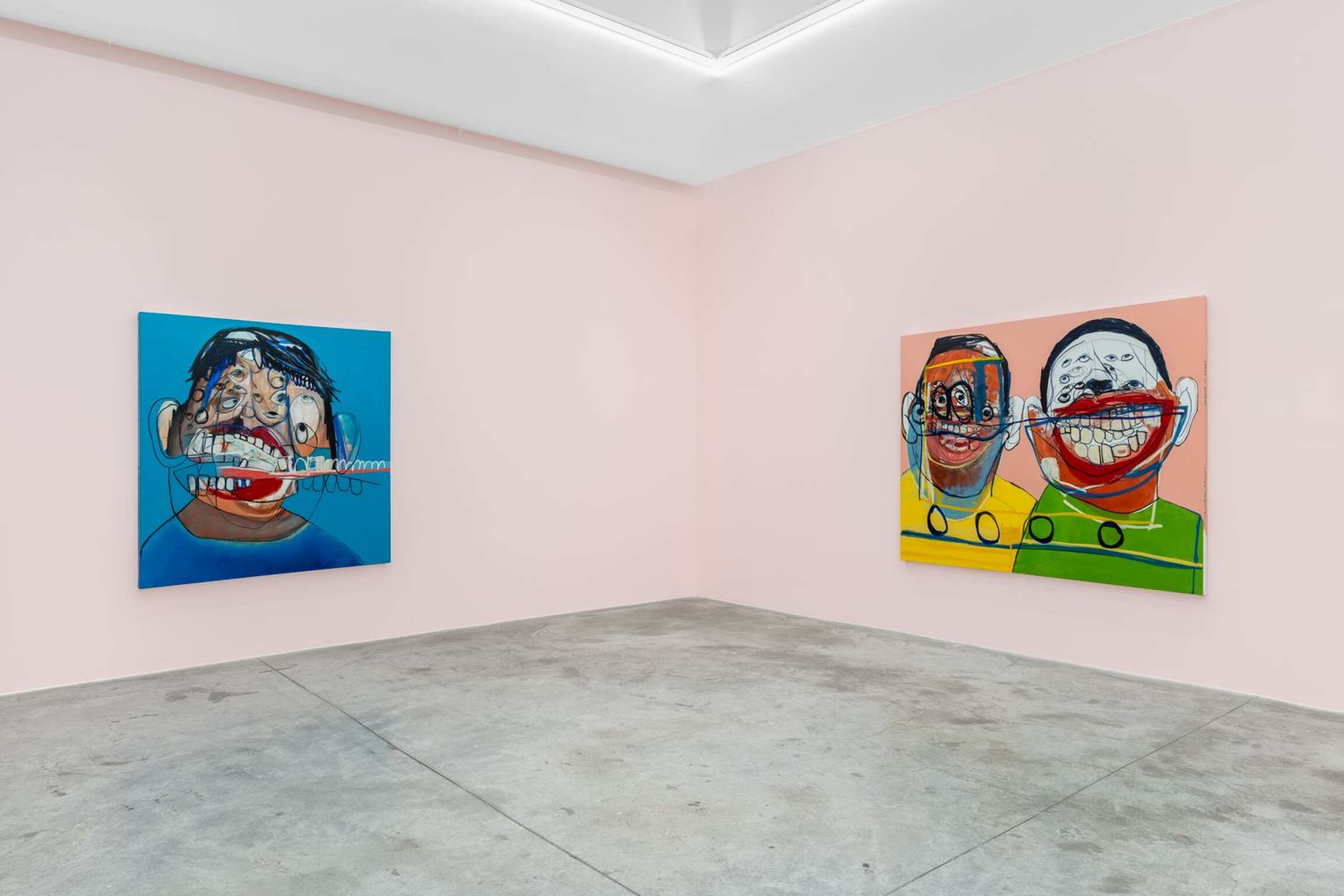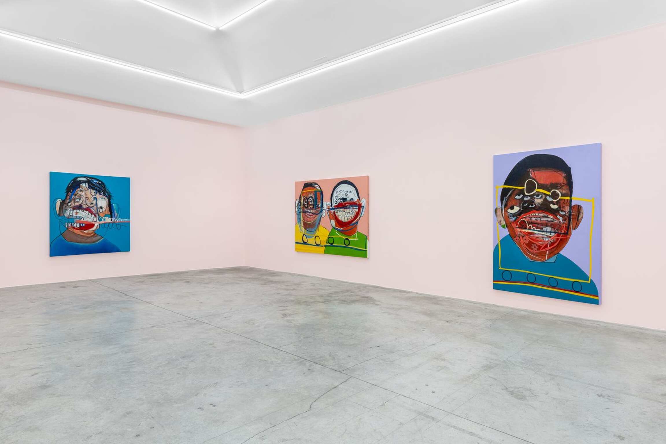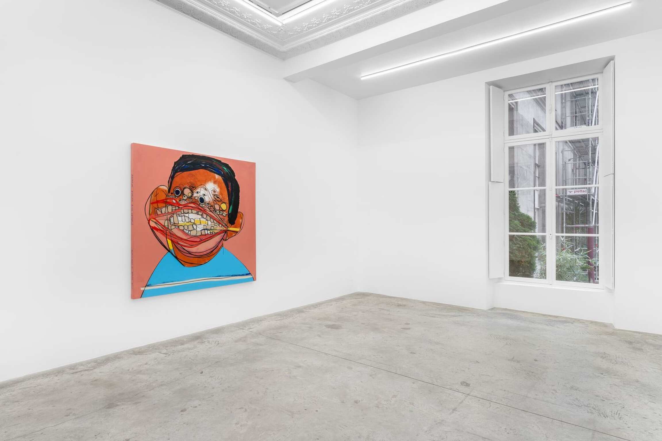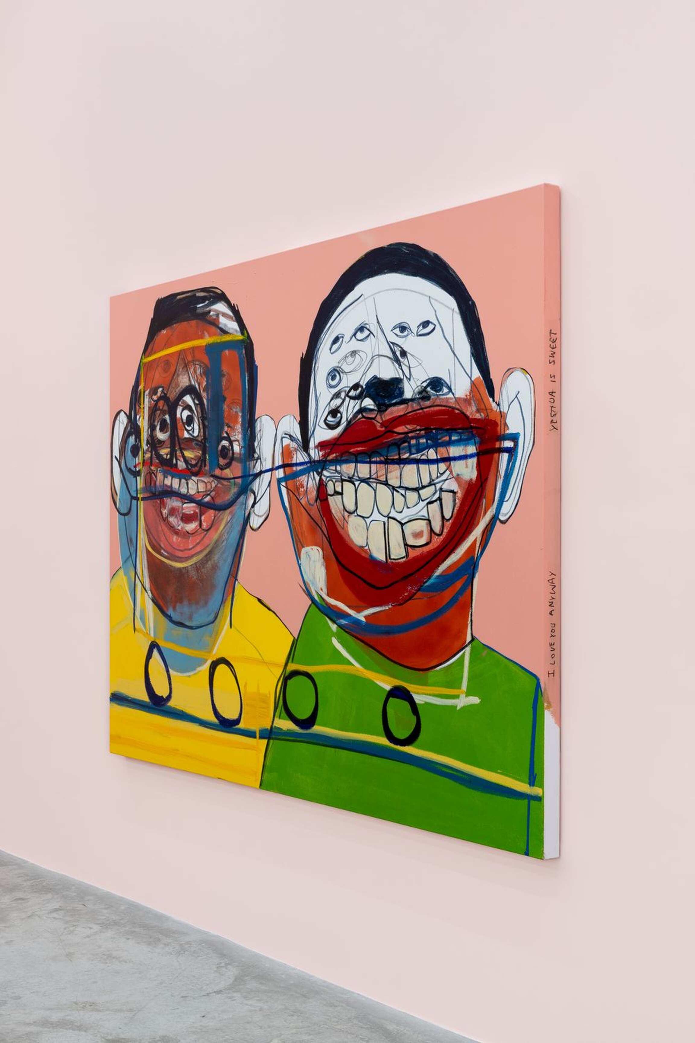 L’ensemble de toiles nouvelles qu’elle présente à la galerie Almine Rech à Paris (sa première exposition personnelle à Paris, la cinquième avec Almine Rech, qui l’exposa à New York, Aspen, Bruxelles et Londres) marque une évolution réjouissante : les personnages de « Parable of Nana » et de « Evidence of Grace » (ses deux précédents solo shows avec la galerie, respectivement à Londres en 2020 et Bruxelles en 2021), étaient affublés de dizaines d’yeux, comme s’ils signifiaient leur exploration curieuse et vorace du monde. Figés dans le mutisme, ces personnages graves et souvent renfrognés semblaient serrer des dents… Ils exprimaient autrement leur personnalité, leur histoire, leurs sentiments. Le nouveau panthéon qui forme « Sweet Jesus » (le titre qu’elle a donné à son exposition parisienne, et qui à lui seul est tout un programme) est bouches ouvertes et toutes dents dehors – souvent bien plus de dents que de raison, qui font écho à bien plus que deux yeux par visage. Ses personnages, semble t’il, se sont mis à sourire. A vociférer, peut-être, à chanter, pourquoi pas, à parler, assurément.