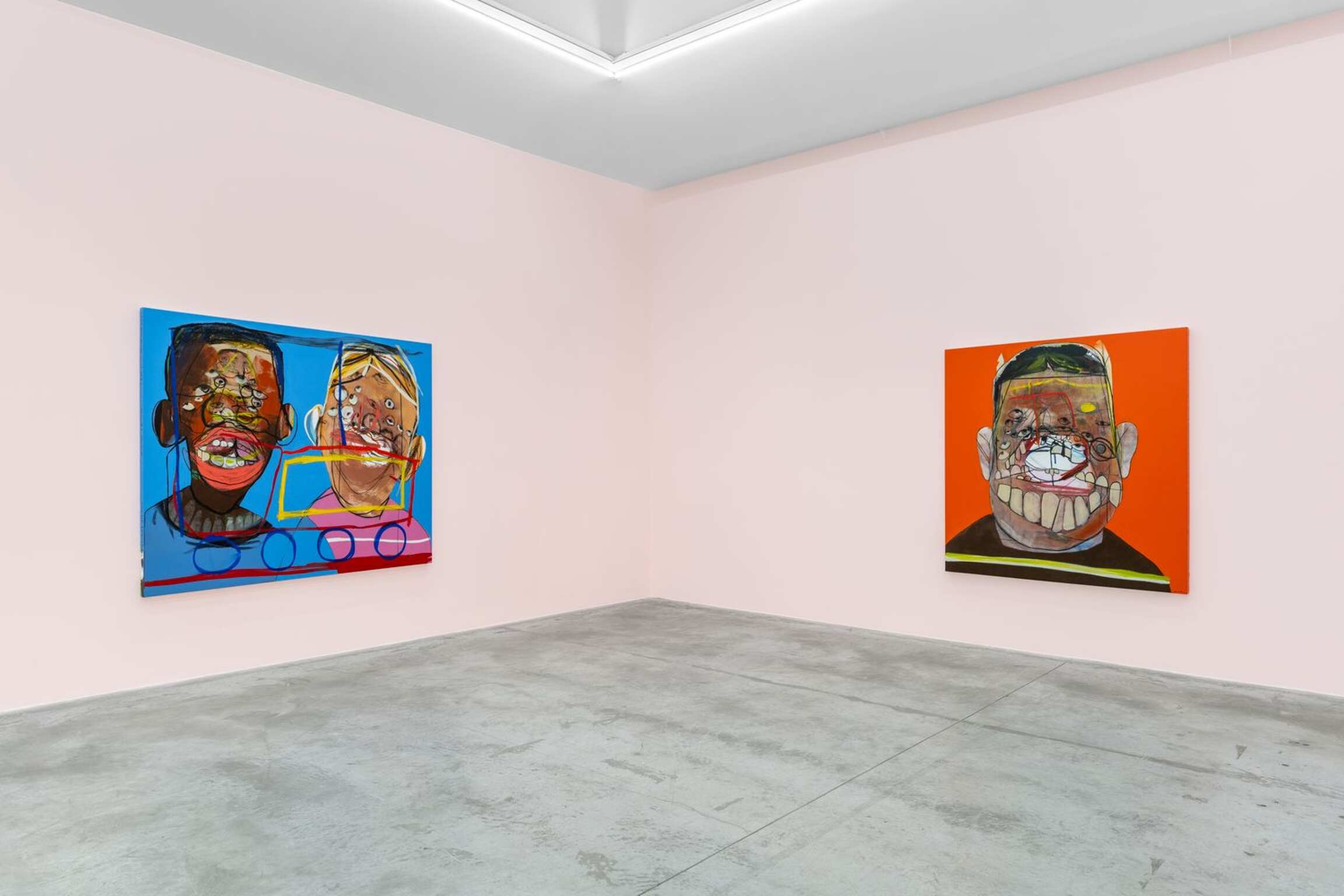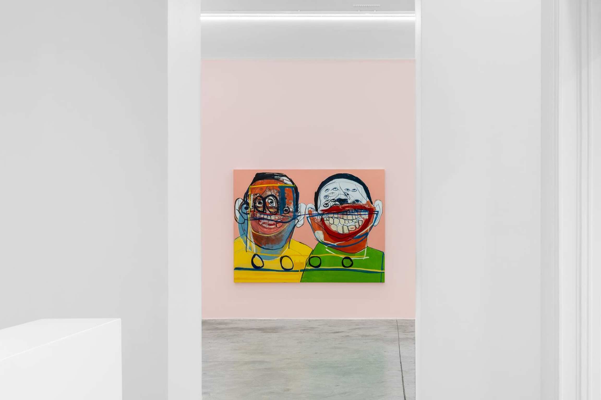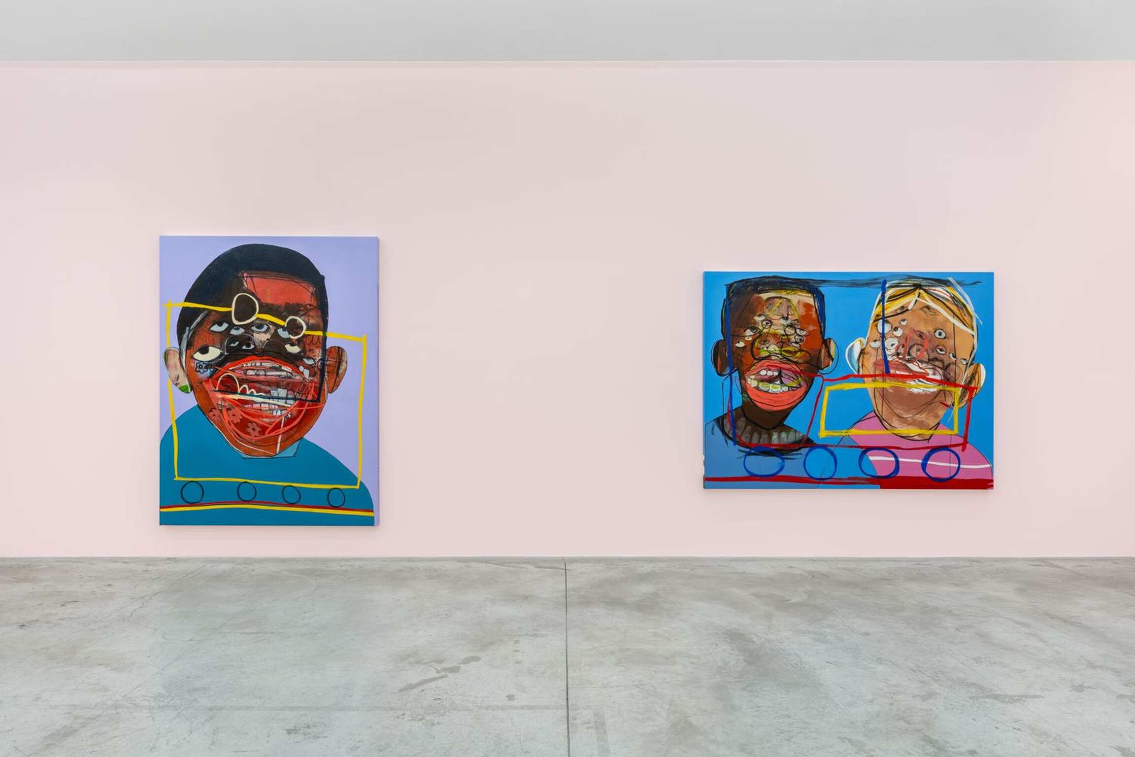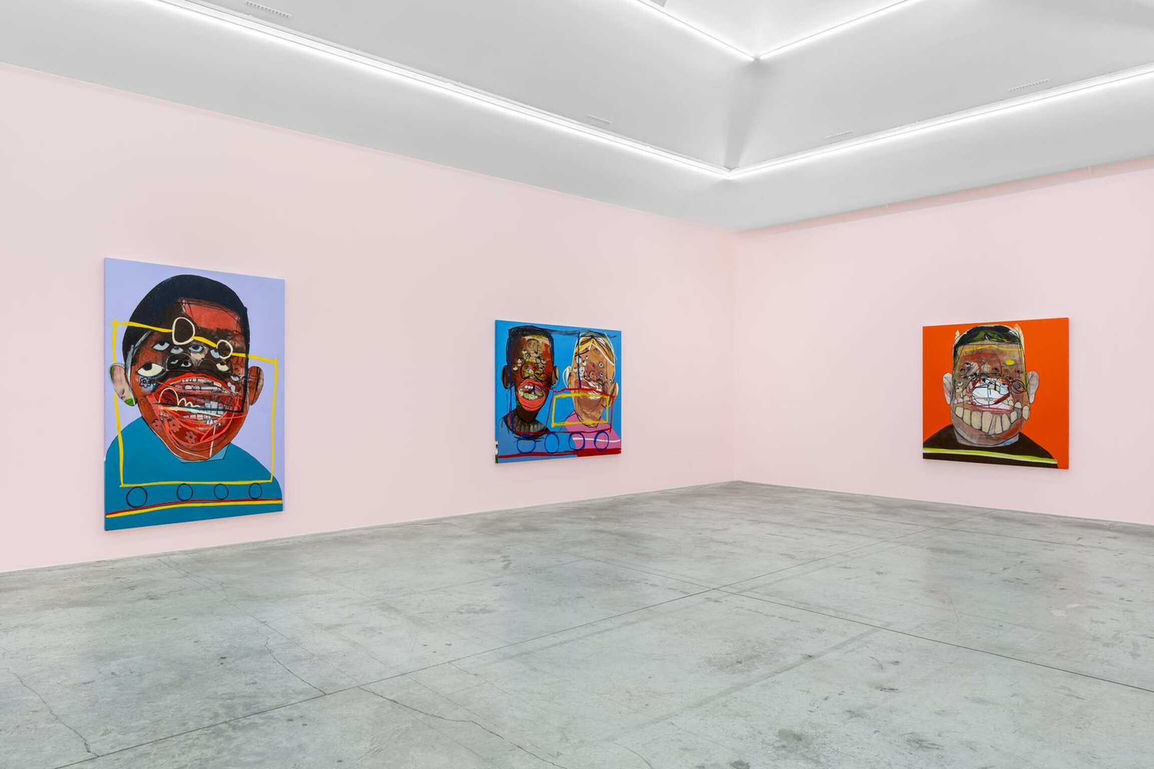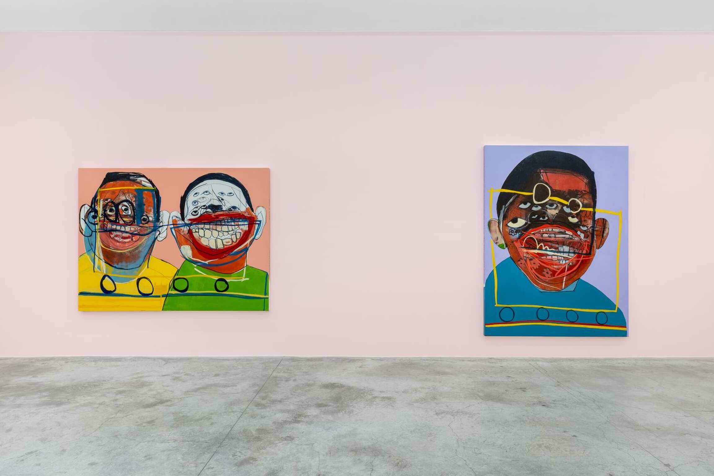 L’ensemble de toiles nouvelles qu’elle présente à la galerie Almine Rech à Paris (sa première exposition personnelle à Paris, la cinquième avec Almine Rech, qui l’exposa à New York, Aspen, Bruxelles et Londres) marque une évolution réjouissante : les personnages de « Parable of Nana » et de « Evidence of Grace » (ses deux précédents solo shows avec la galerie, respectivement à Londres en 2020 et Bruxelles en 2021), étaient affublés de dizaines d’yeux, comme s’ils signifiaient leur exploration curieuse et vorace du monde. Figés dans le mutisme, ces personnages graves et souvent renfrognés semblaient serrer des dents… Ils exprimaient autrement leur personnalité, leur histoire, leurs sentiments. Le nouveau panthéon qui forme « Sweet Jesus » (le titre qu’elle a donné à son exposition parisienne, et qui à lui seul est tout un programme) est bouches ouvertes et toutes dents dehors – souvent bien plus de dents que de raison, qui font écho à bien plus que deux yeux par visage. Ses personnages, semble t’il, se sont mis à sourire. A vociférer, peut-être, à chanter, pourquoi pas, à parler, assurément.