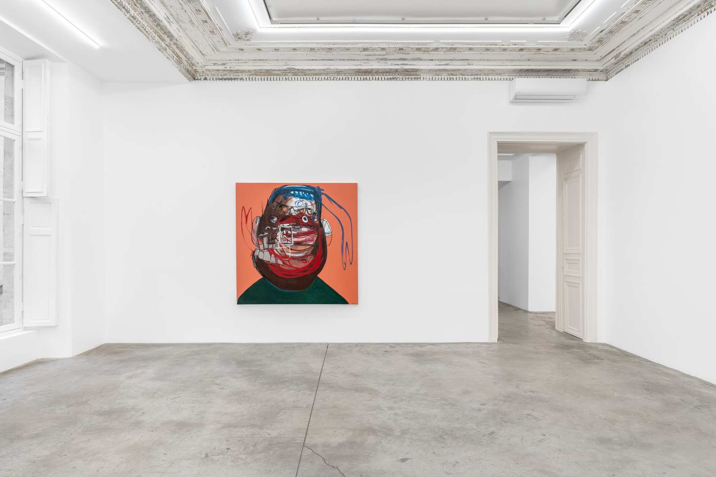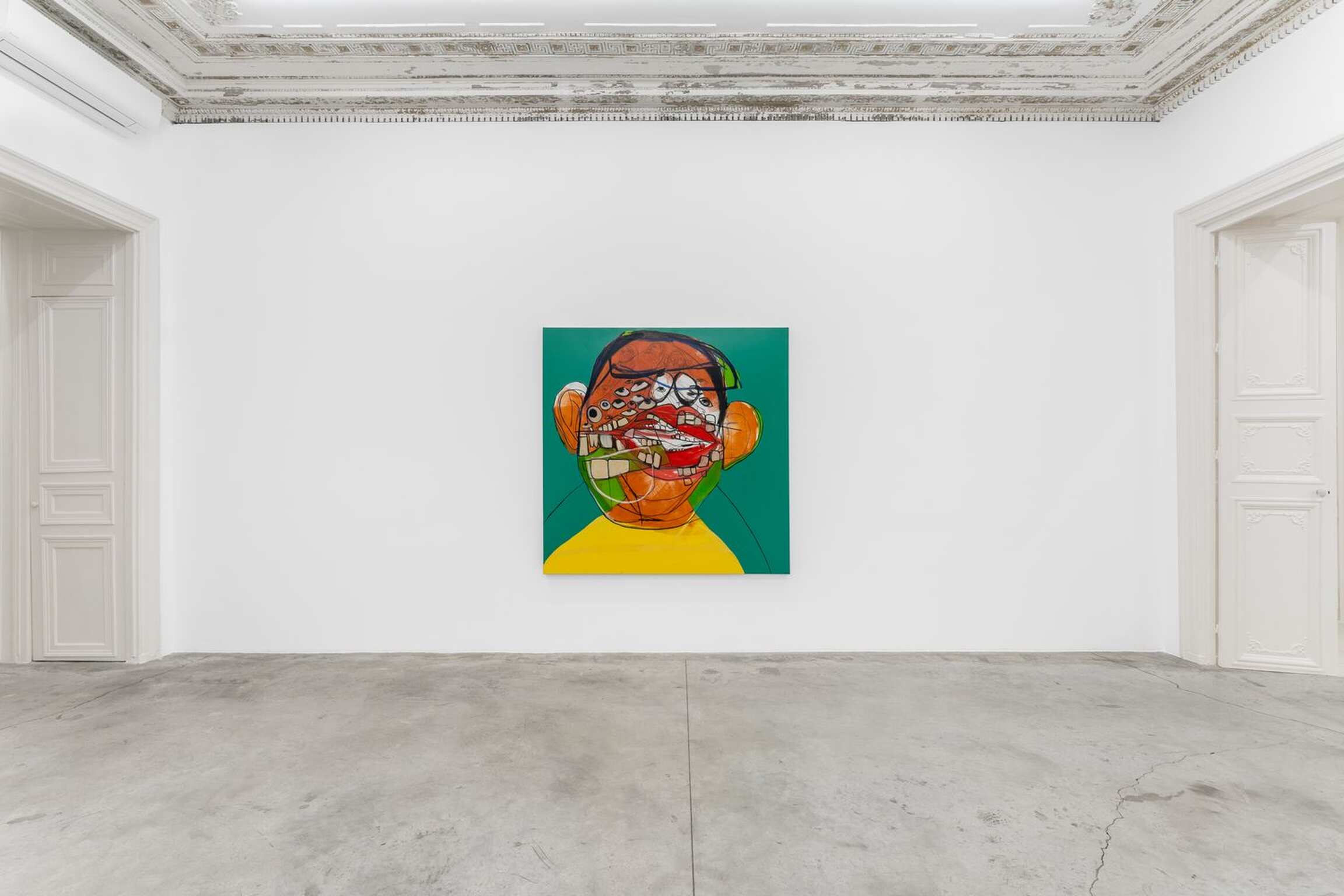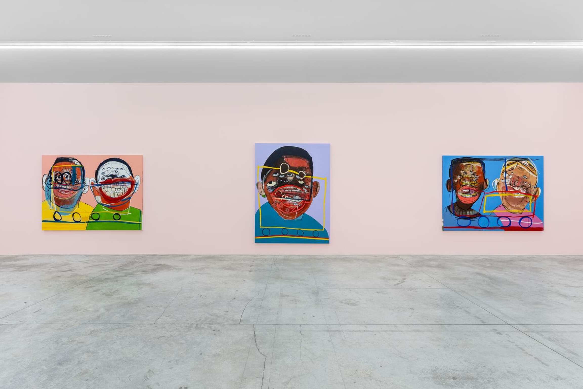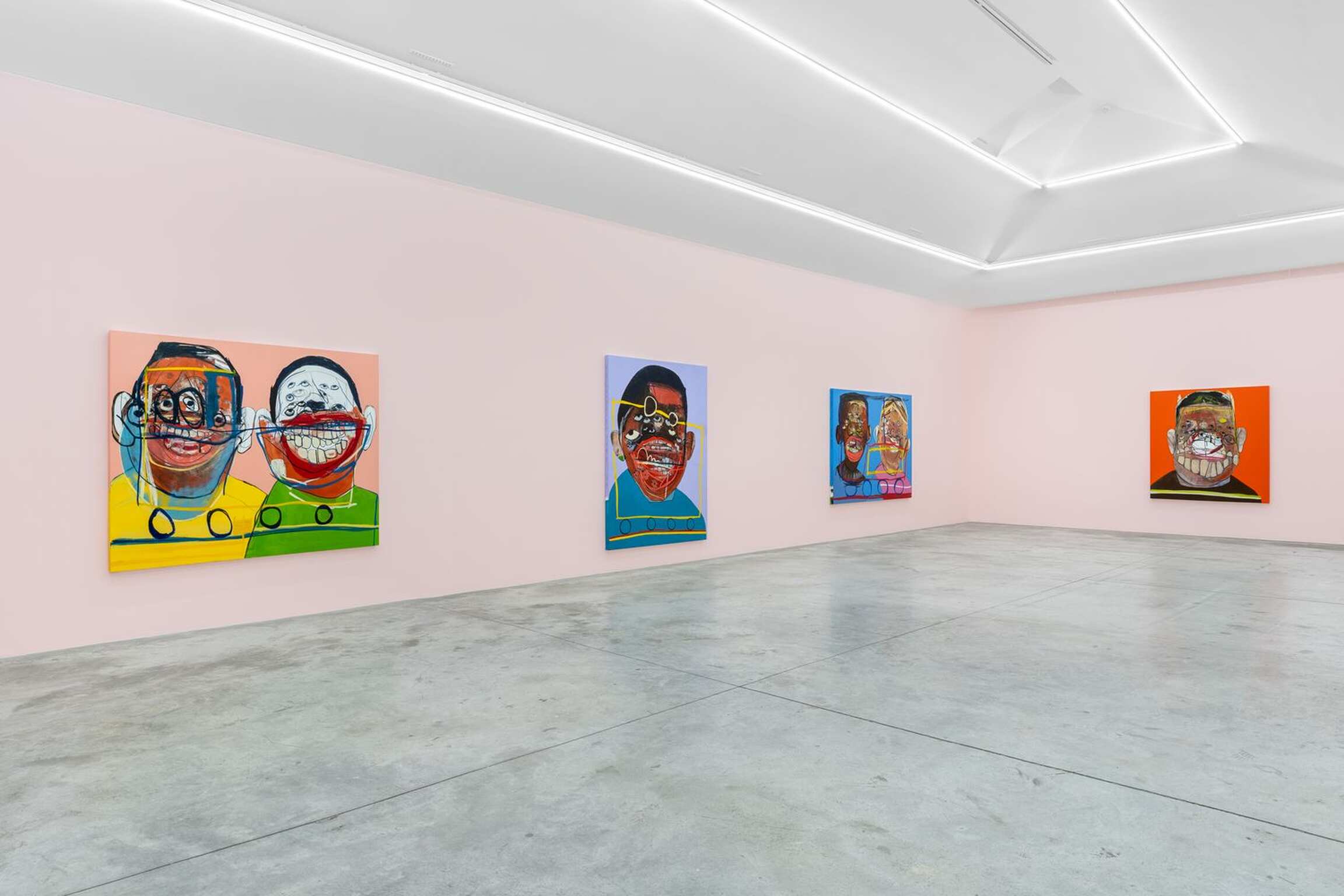 L’ensemble de toiles nouvelles qu’elle présente à la galerie Almine Rech à Paris (sa première exposition personnelle à Paris, la cinquième avec Almine Rech, qui l’exposa à New York, Aspen, Bruxelles et Londres) marque une évolution réjouissante : les personnages de « Parable of Nana » et de « Evidence of Grace » (ses deux précédents solo shows avec la galerie, respectivement à Londres en 2020 et Bruxelles en 2021), étaient affublés de dizaines d’yeux, comme s’ils signifiaient leur exploration curieuse et vorace du monde. Figés dans le mutisme, ces personnages graves et souvent renfrognés semblaient serrer des dents… Ils exprimaient autrement leur personnalité, leur histoire, leurs sentiments. Le nouveau panthéon qui forme « Sweet Jesus » (le titre qu’elle a donné à son exposition parisienne, et qui à lui seul est tout un programme) est bouches ouvertes et toutes dents dehors – souvent bien plus de dents que de raison, qui font écho à bien plus que deux yeux par visage. Ses personnages, semble t’il, se sont mis à sourire. A vociférer, peut-être, à chanter, pourquoi pas, à parler, assurément.