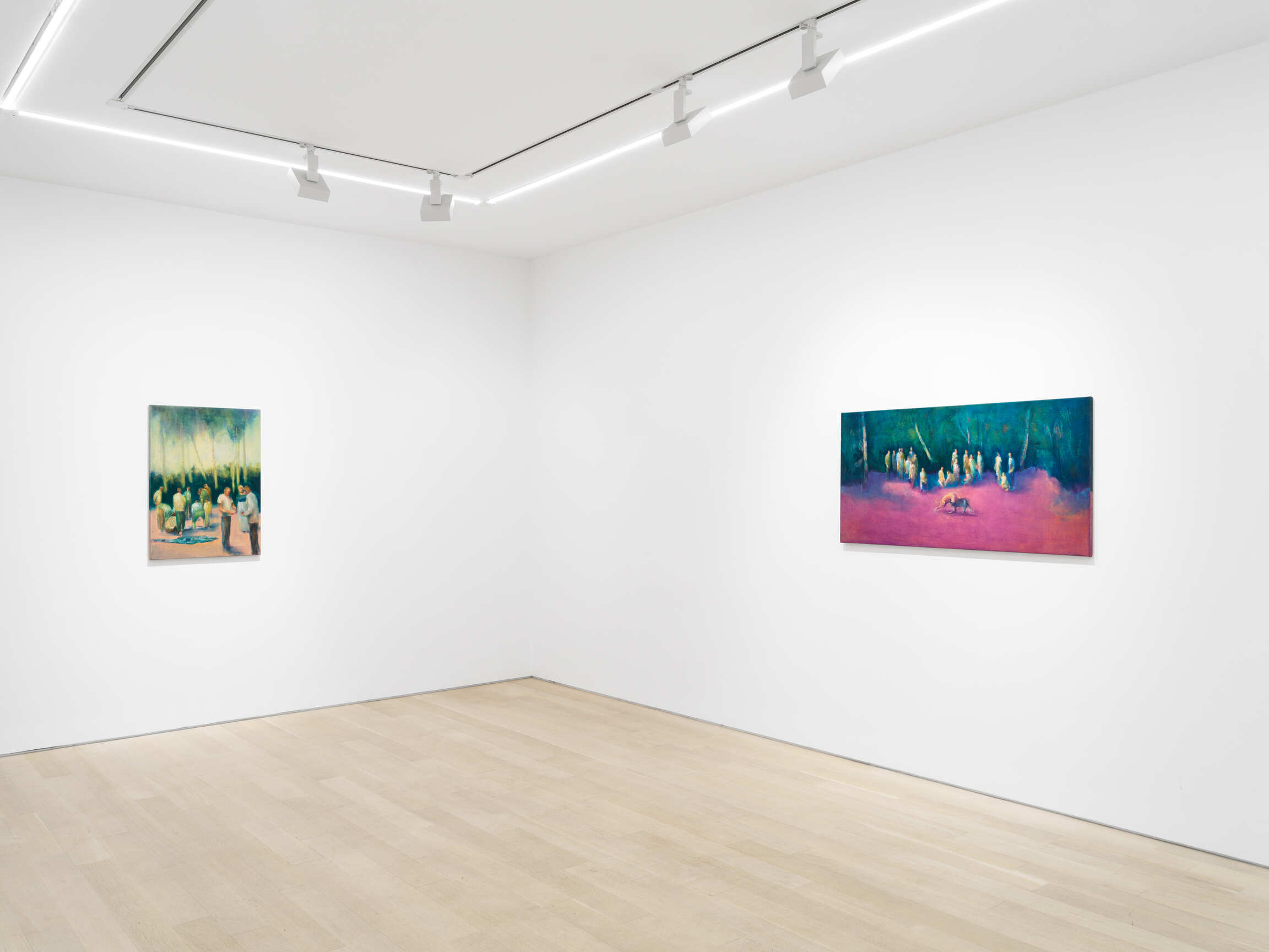 The influence of the late writer and painter Henry Darger writ large in de Flers’ art. Darger’s ability to create unusual, imaginary worlds and sketch tales of good and evil resonates through the eerie scenes of gatherings seen in de Flers’ works. These focused and alienated crowds, bound by the borders of the panavision format, are also an ode to cinema. The opera of still-focused figures is surrounded by propulsive action of nature and bright colors, creating a deeply rhythmic, cinematic image and opening the discourse about what is real and what is a dream.