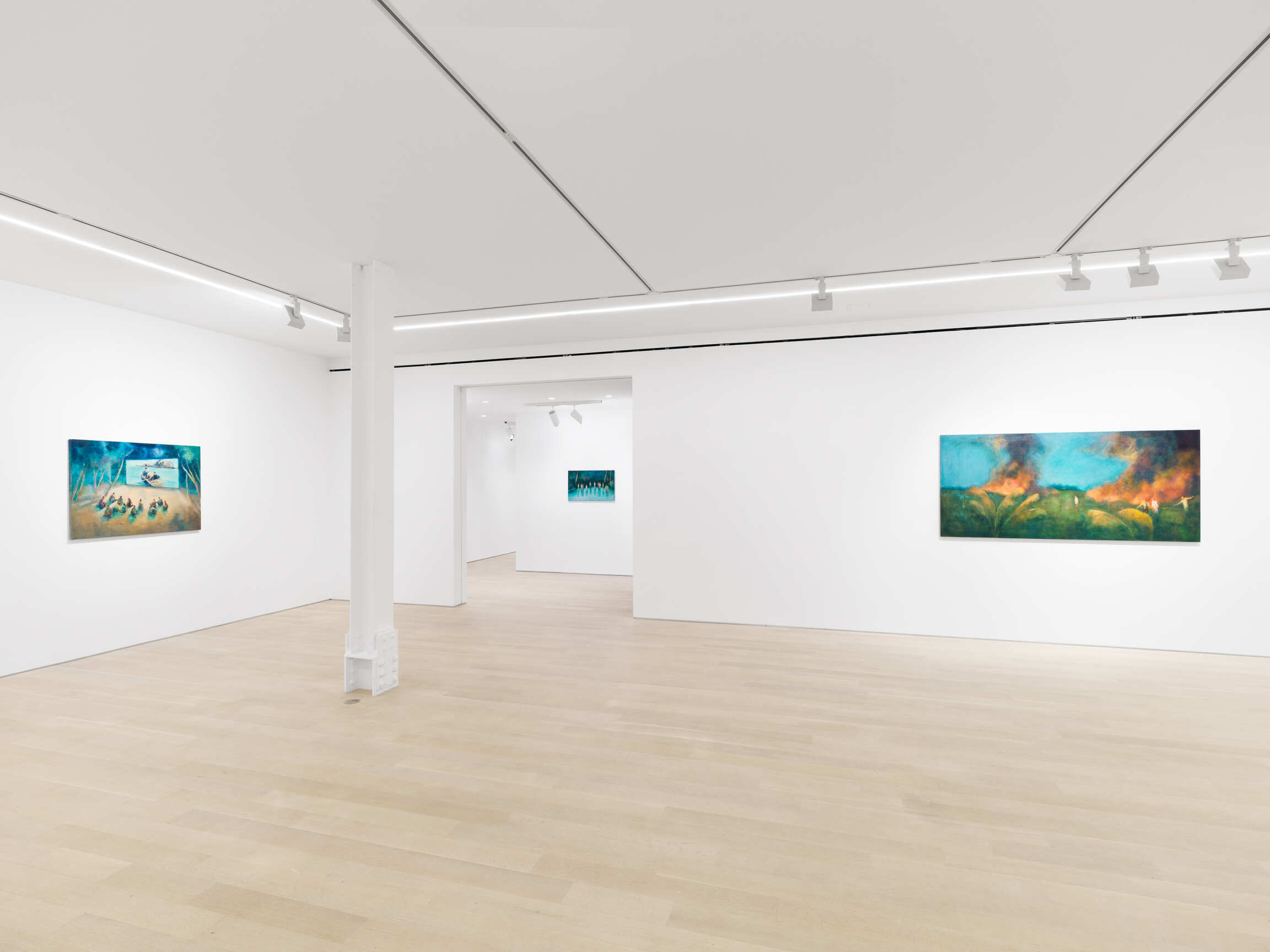 The influence of the late writer and painter Henry Darger writ large in de Flers’ art. Darger’s ability to create unusual, imaginary worlds and sketch tales of good and evil resonates through the eerie scenes of gatherings seen in de Flers’ works. These focused and alienated crowds, bound by the borders of the panavision format, are also an ode to cinema. The opera of still-focused figures is surrounded by propulsive action of nature and bright colors, creating a deeply rhythmic, cinematic image and opening the discourse about what is real and what is a dream.