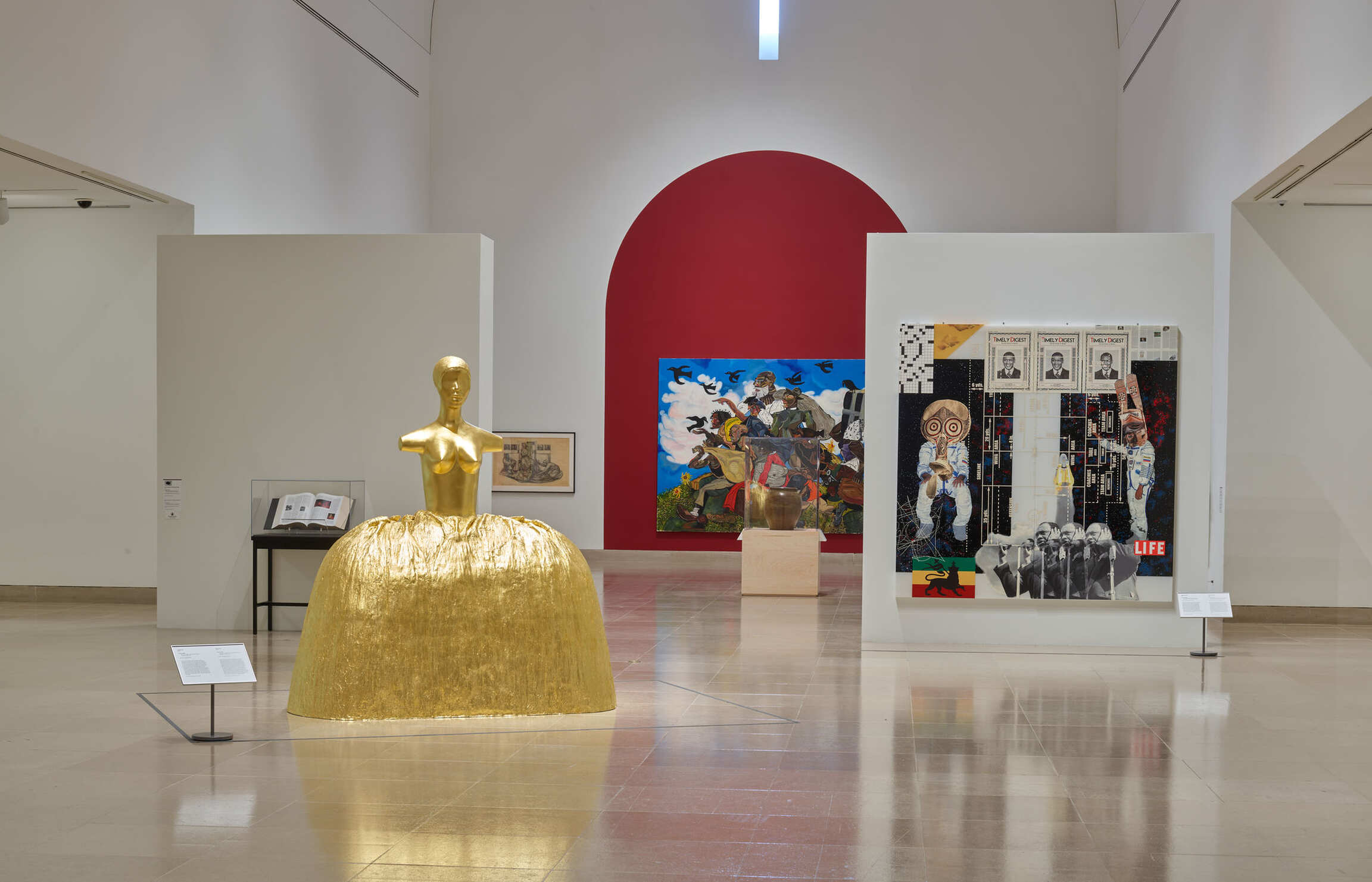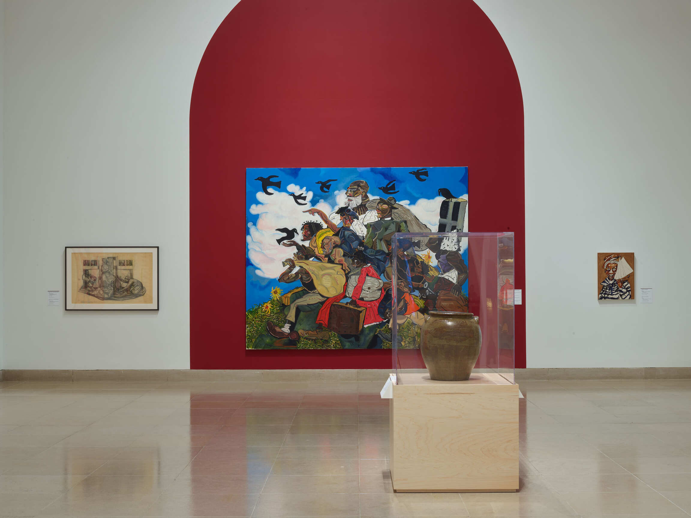 The Barrel Vault presents a confluence of each curator’s perspective as envisioned by Brodbeck. This section includes Cupboard, 2022, a recently acquired monumental gilt bronze sculpture by Simone Leigh; Pocket Rocket, 2020, a mixed-media work by Tschabalala Self; and a ceramic vessel created by David Drake, a literate enslaved potter who made stoneware in the Antebellum era.