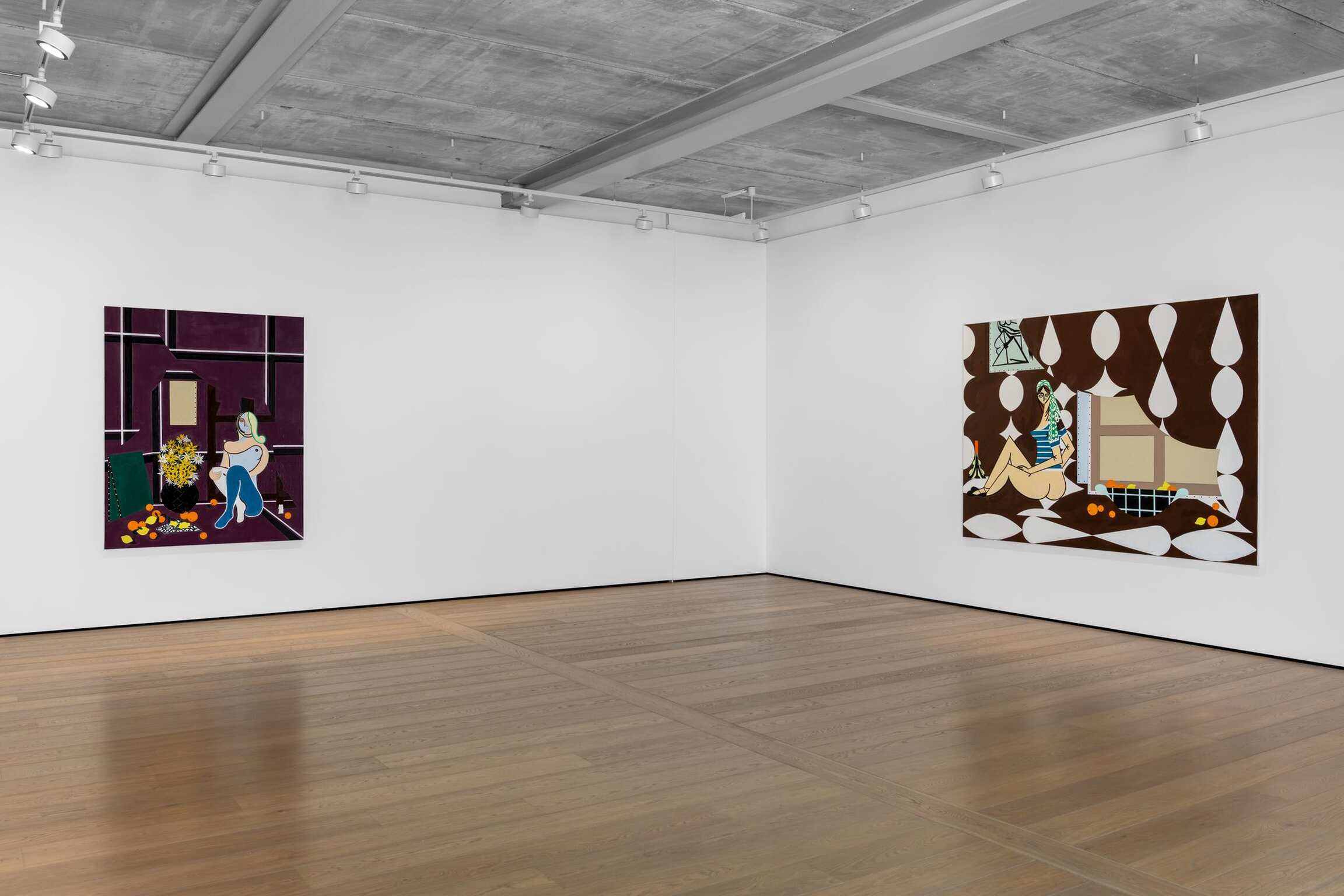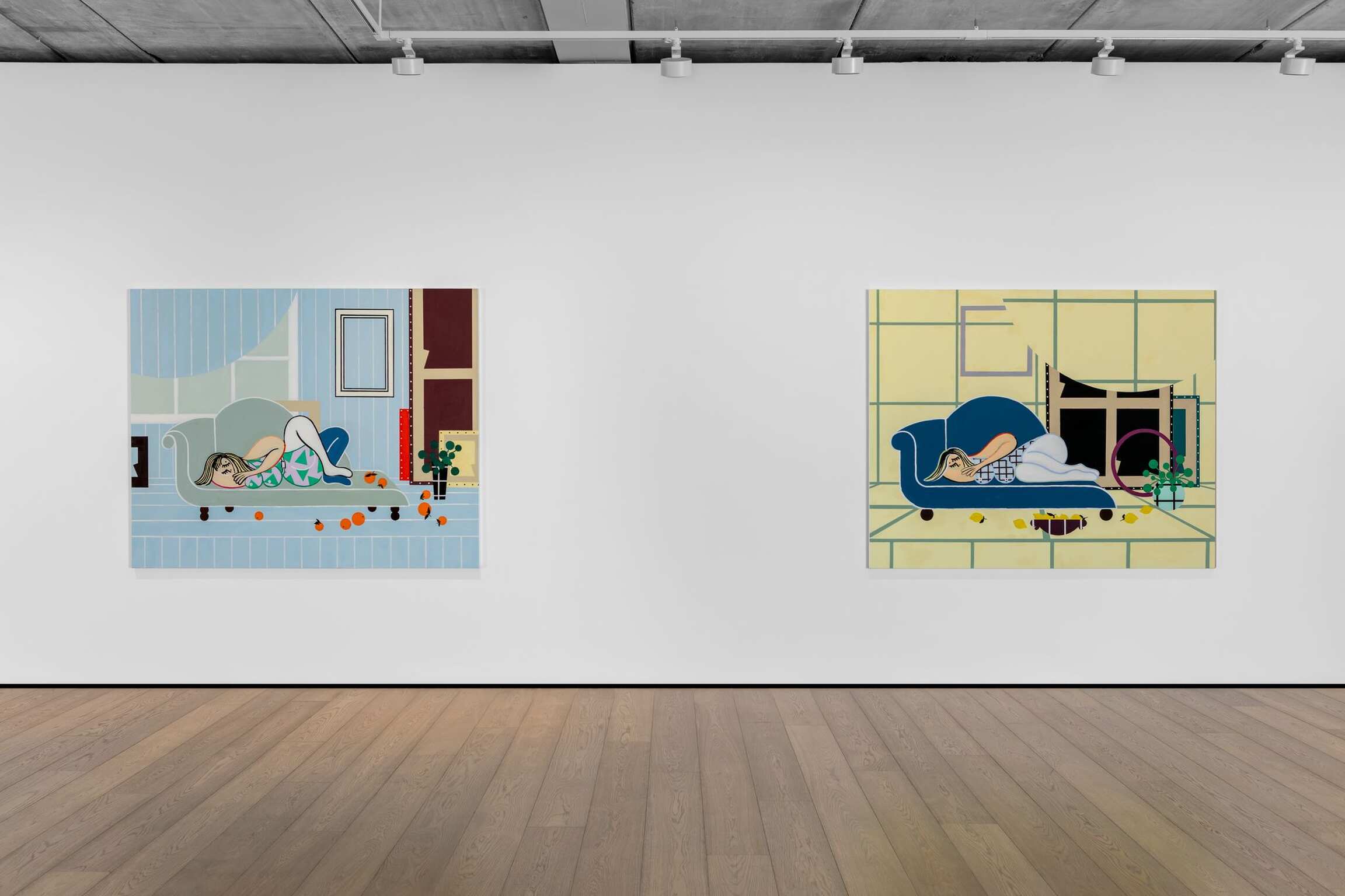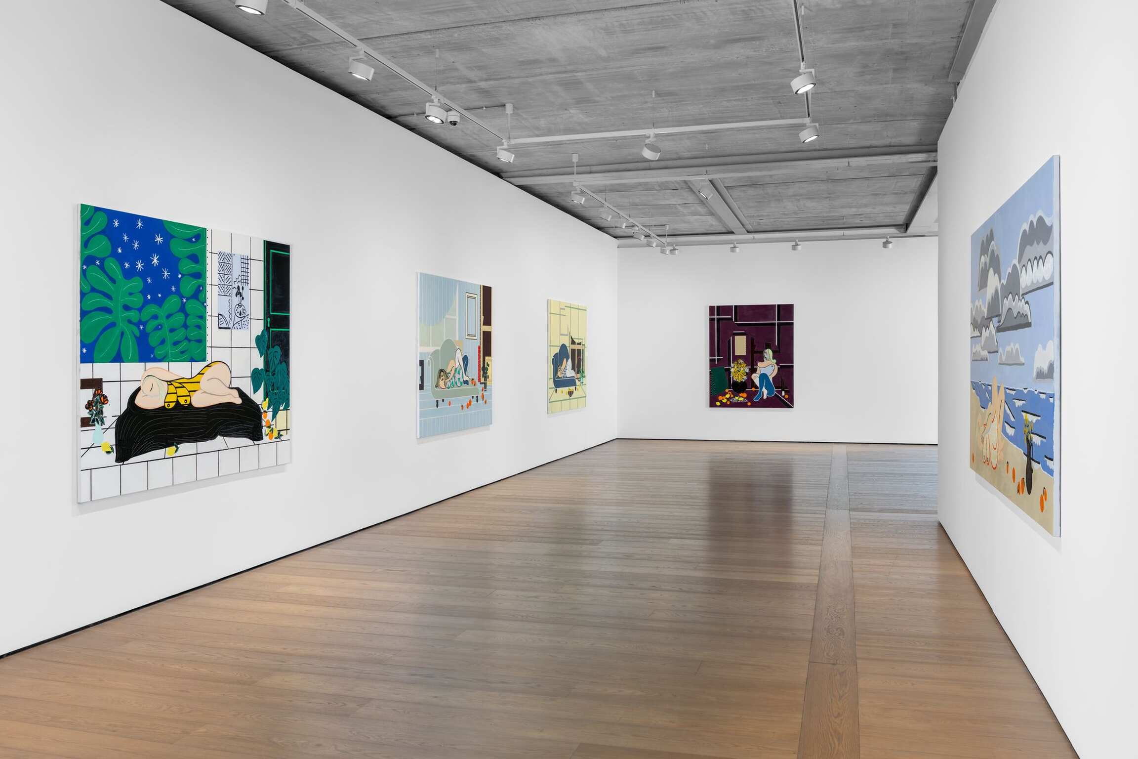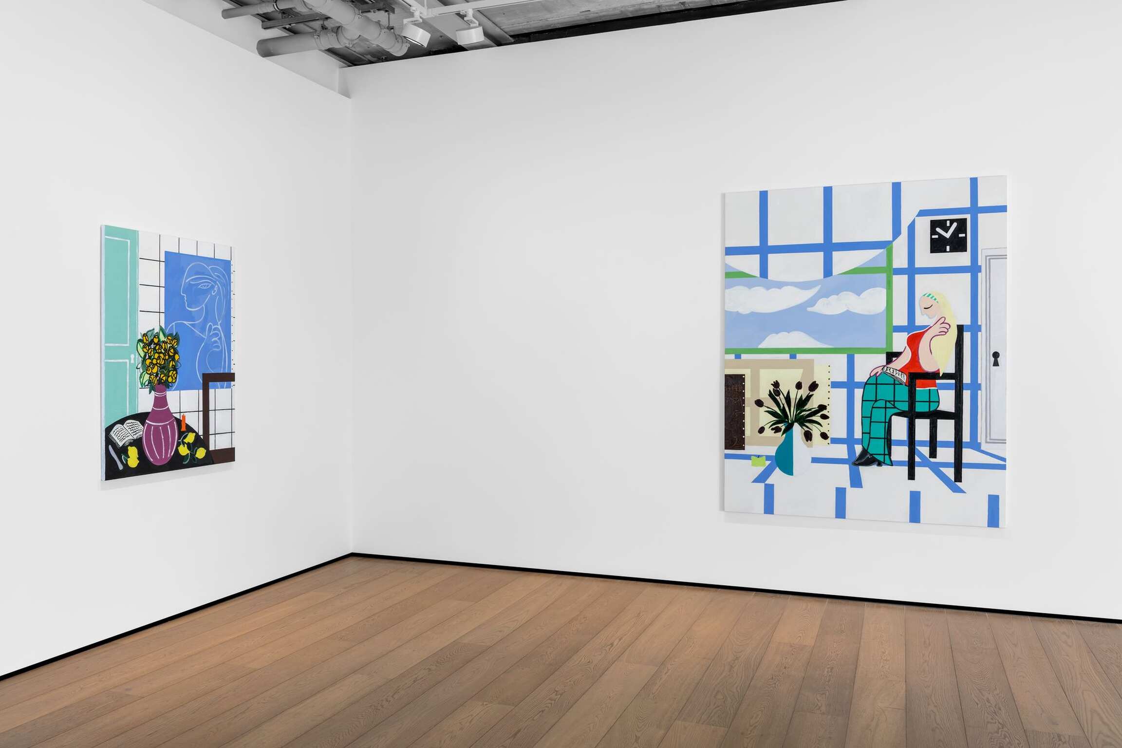 Her riveting compositions are replete with quotations—even clouds seem to emanate from a repertoire of artworks—generating a feeling of visual familiarity and a sense of play, which is reinforced by the use of bold, unmodulated colours, combined in this new series with sassy baby blue, lilac, and soft pink. Henri Matisse’s recurrent oranges make an incongruous appearance by the sea in Lone Bather and Clouds 2 (2024). The Green Door quotes Pablo Picasso’s Femme assise près d’une fenêtre (Marie-Thérèse) (1932). A black and white composition in the background of Atassi’s majestic Summer Night (2024) is taken from Matisse’s Grand intérieur rouge (1948). The montages of Tom Wesselmann also come to mind. Yet Atassi carries this inheritance lightly and choreographs her fictional spaces with humour and determination in her obsessive construction of space.