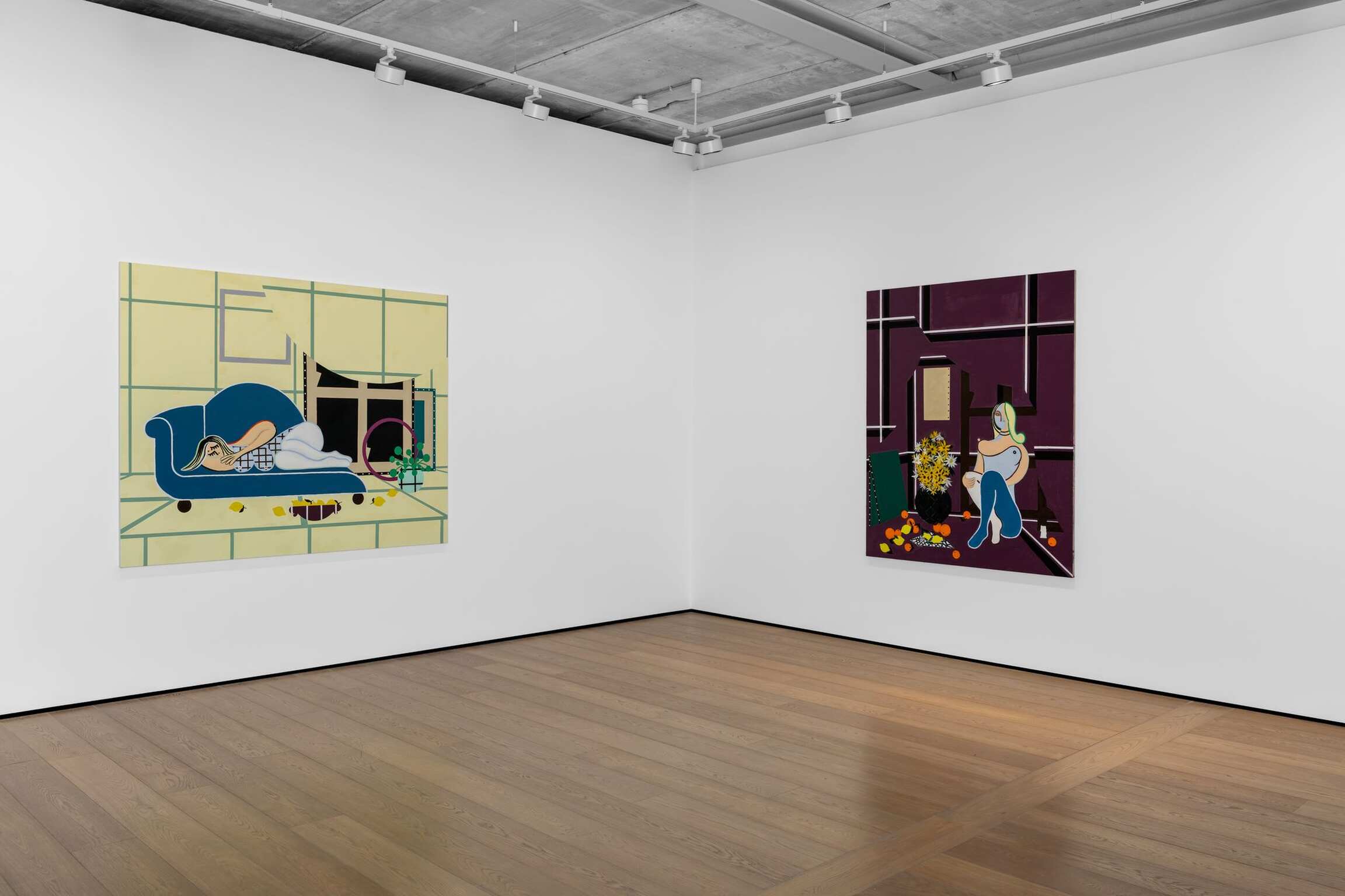 On closer inspection, it becomes evident that few models are actually at work. With their eyes shut or cast down, the figures are steeped in reading, sleeping on a divan or resting, curled up in an armchair. Acrobats have put down their hoops—their relaxed bodies are sagging. The languorous, soft spills create an impression of ease that differs from the way models are traditionally portrayed. Atassi explains that she paints models “in abstracto, outside the desire of the painter”.[1] This is a time of their own. Figures are caught in the suspended, “lost hours” that give the exhibition its title and signal a departure. As she now invites the viewer to share these intimate moments, Farah Atassi’s works convey a sense of tranquillity and harmony. The upright poses in Woman with Green Headscarf (2022) and Seated Woman and Daisies (2024) form exceptions to these laid-back attitudes. Yet, even in these cases, the figures are both sensual and serenely confident.