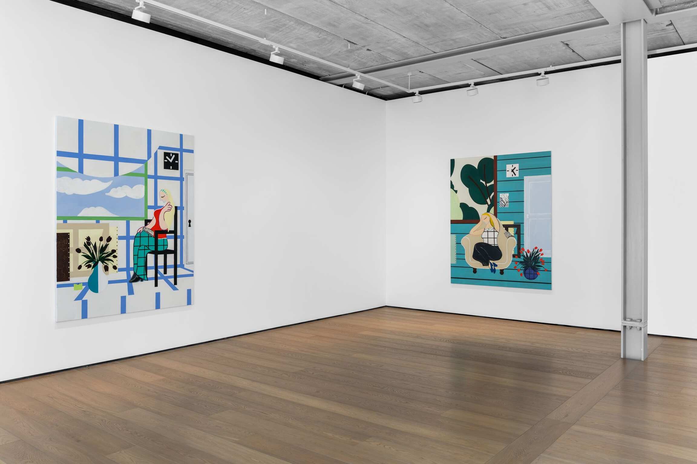 As she continues to subvert artistic conventions, Atassi now touches on the essence of painting; both in its allegorical dimension and relation to representation and in its social reality. With these new works also enters a sense of narration, which Farah Atassi has long held back from, and which takes the artist’s studio as its pivot. Creating an impression of parallel spaces to that of the studio, curtains and windows announce enchanting landscapes made of lush, abundant vegetation in The Rest (2024) and Summer Night (2024), while skyscapes brimming with clouds become a focus in works such as Woman reading by the Window (2024). Elsewhere, doors and their large keyholes suggest further oneiric spaces that belong to the inner life of the model. In Sleeping Acrobat (2023) the cross-ruled window to the left deliberately echoes the stretchers of the resting, turned-around canvases to the right. Even the frame hanging on the wall is empty and reveals the striped background of the studio. The work is entirely centred on the interiority of the acrobat and the space she occupies.