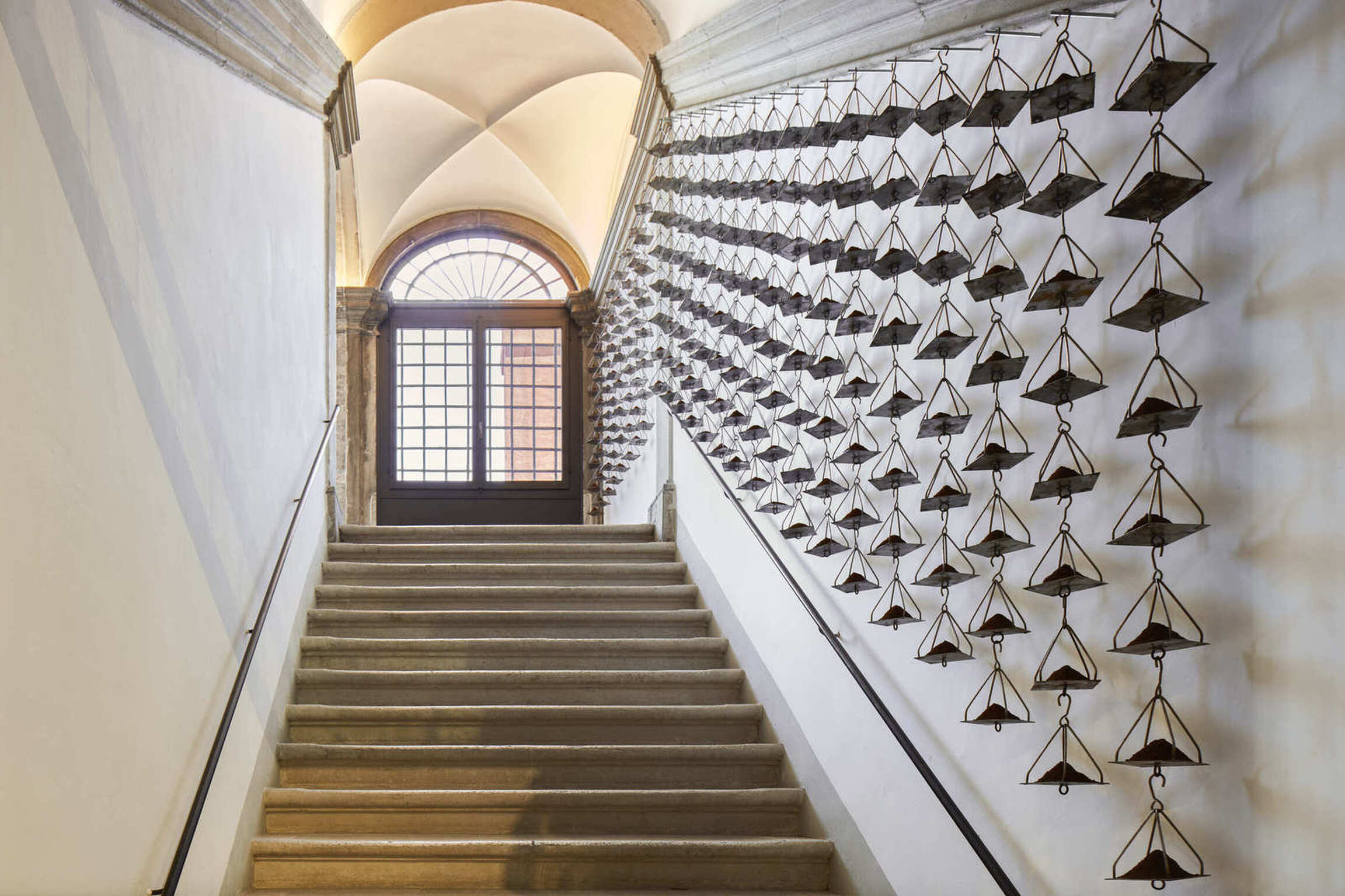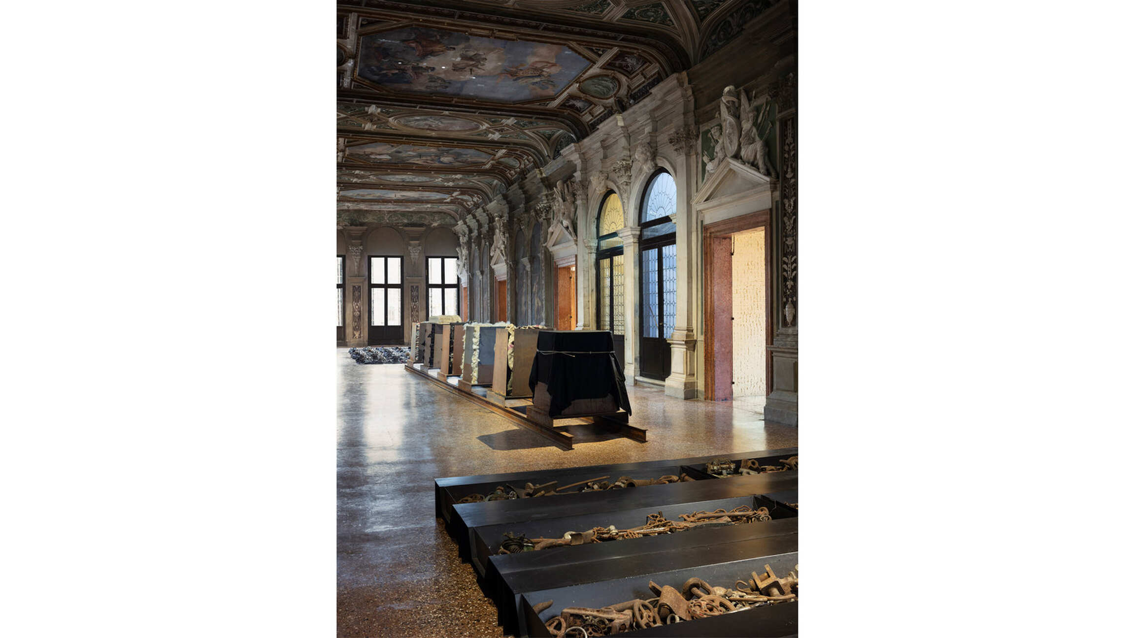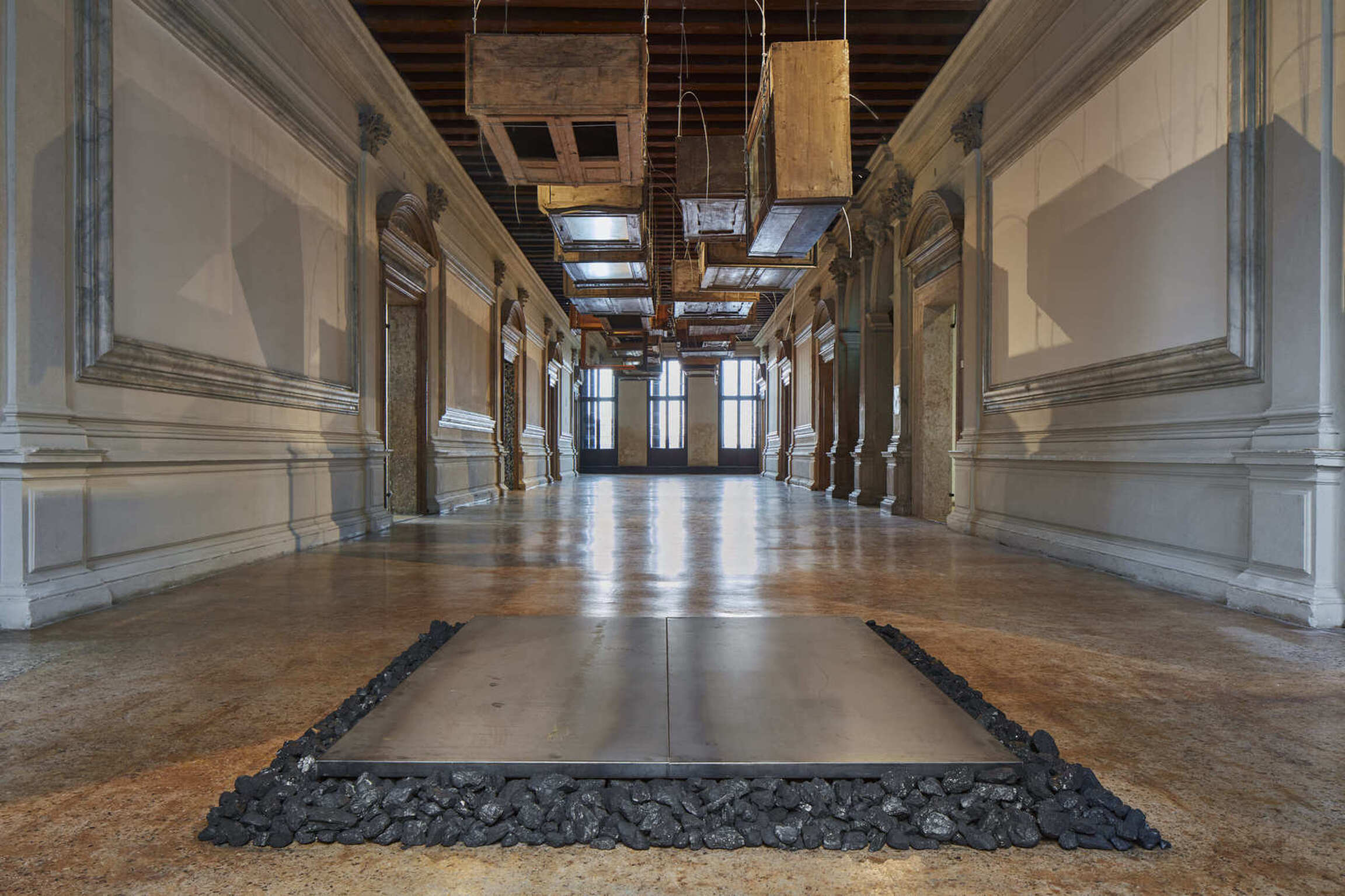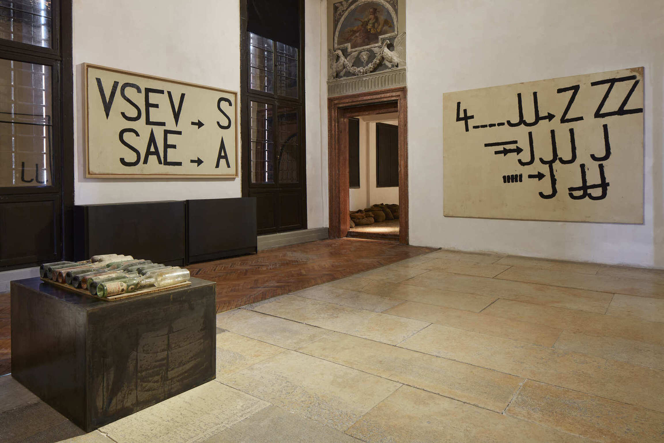 The exhibition narrative is completed with large-scale installations realized by Kounellis from the end of the 1980s. These ensembles envelop shelves or metal constructions containing objects of various origins: from musical instruments to sacks, from plaster casts to stones, from coats to glasses, from mechanical gears to fragments of furniture. The large interventions hosted in the central rooms of the two main floors of Ca’ Corner della Regina are included in this context. Already as early as 1967 Kounellis dealt with the motifs of gravity and equilibrium in his works. However, it wasn’t until the 1980s and 1990s that he developed a deeper dialogue with architectural and urban spaces. Both of these aspects would result in the monumental 1992’s installation presented in the internal courtyard of the Venetian palazzo. Originally conceived for the external façade of a building in Barcelona, it is composed of seven metal plates that support sacks filled with coffee beans.