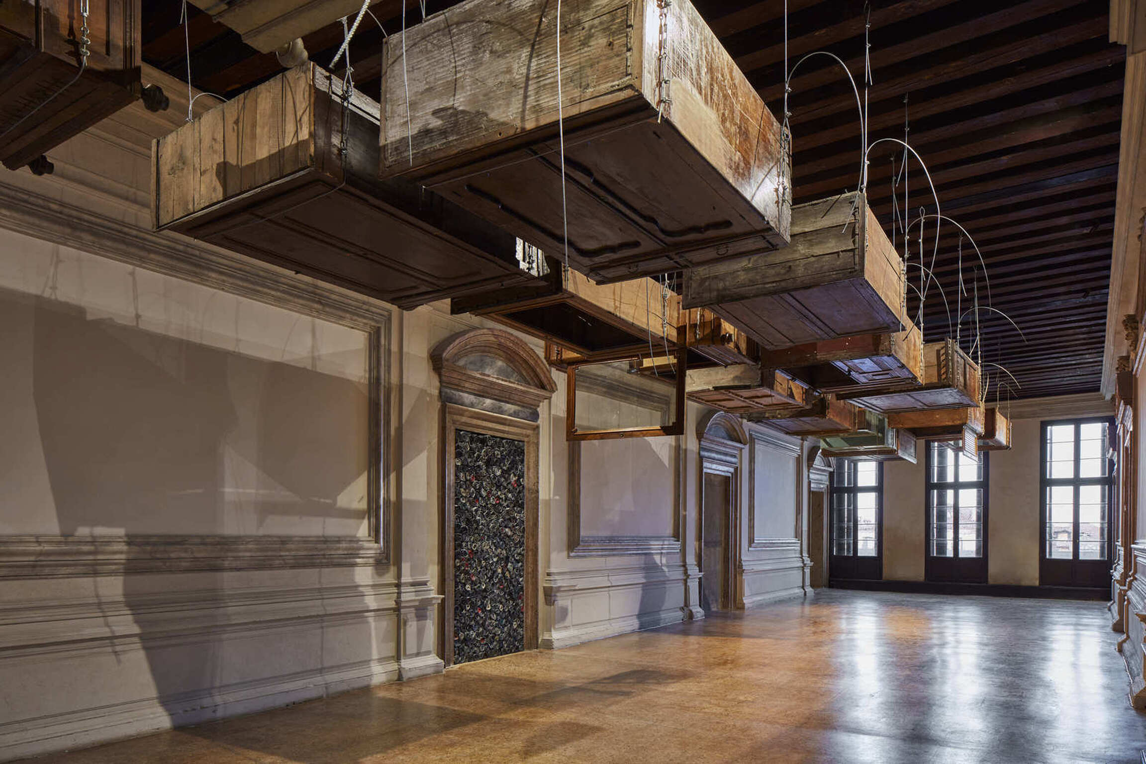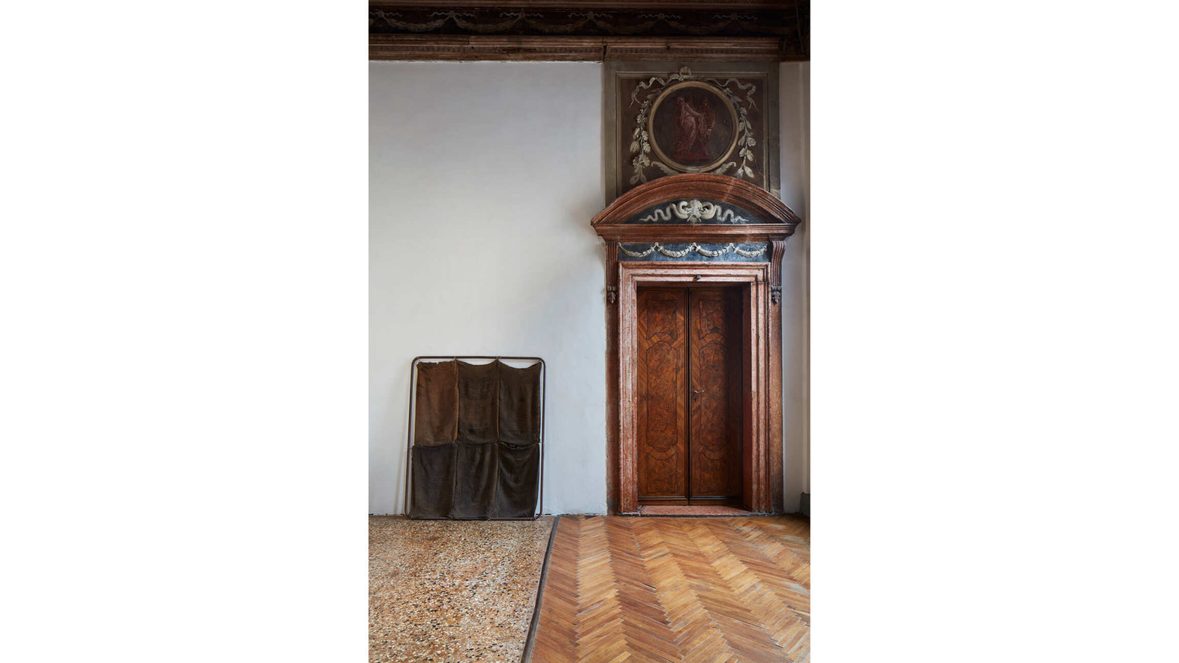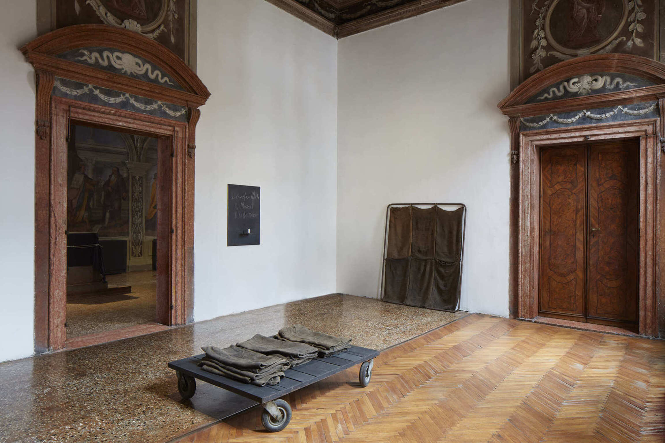 The exhibition narrative is completed with large-scale installations realized by Kounellis from the end of the 1980s. These ensembles envelop shelves or metal constructions containing objects of various origins: from musical instruments to sacks, from plaster casts to stones, from coats to glasses, from mechanical gears to fragments of furniture. The large interventions hosted in the central rooms of the two main floors of Ca’ Corner della Regina are included in this context. Already as early as 1967 Kounellis dealt with the motifs of gravity and equilibrium in his works. However, it wasn’t until the 1980s and 1990s that he developed a deeper dialogue with architectural and urban spaces. Both of these aspects would result in the monumental 1992’s installation presented in the internal courtyard of the Venetian palazzo. Originally conceived for the external façade of a building in Barcelona, it is composed of seven metal plates that support sacks filled with coffee beans.