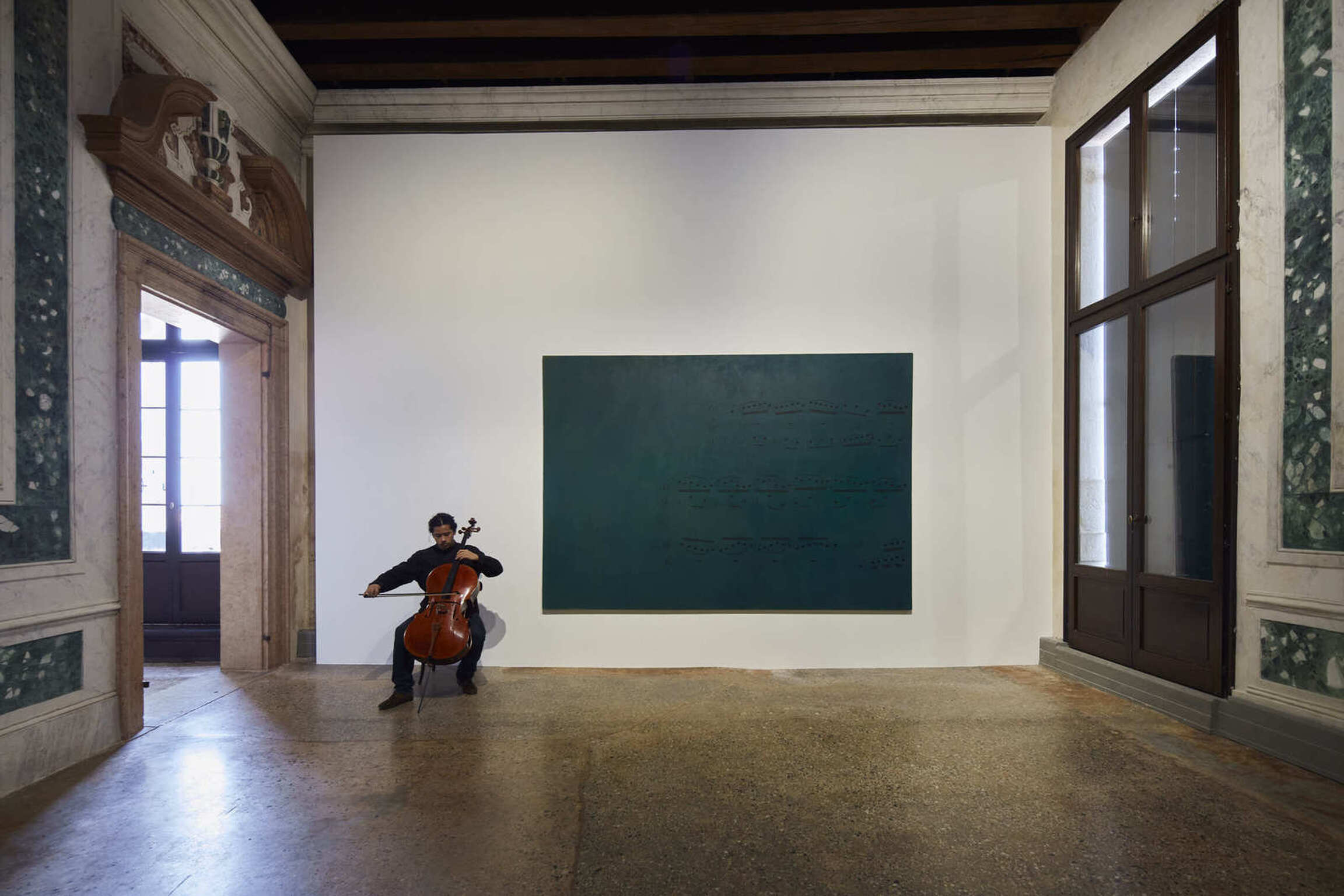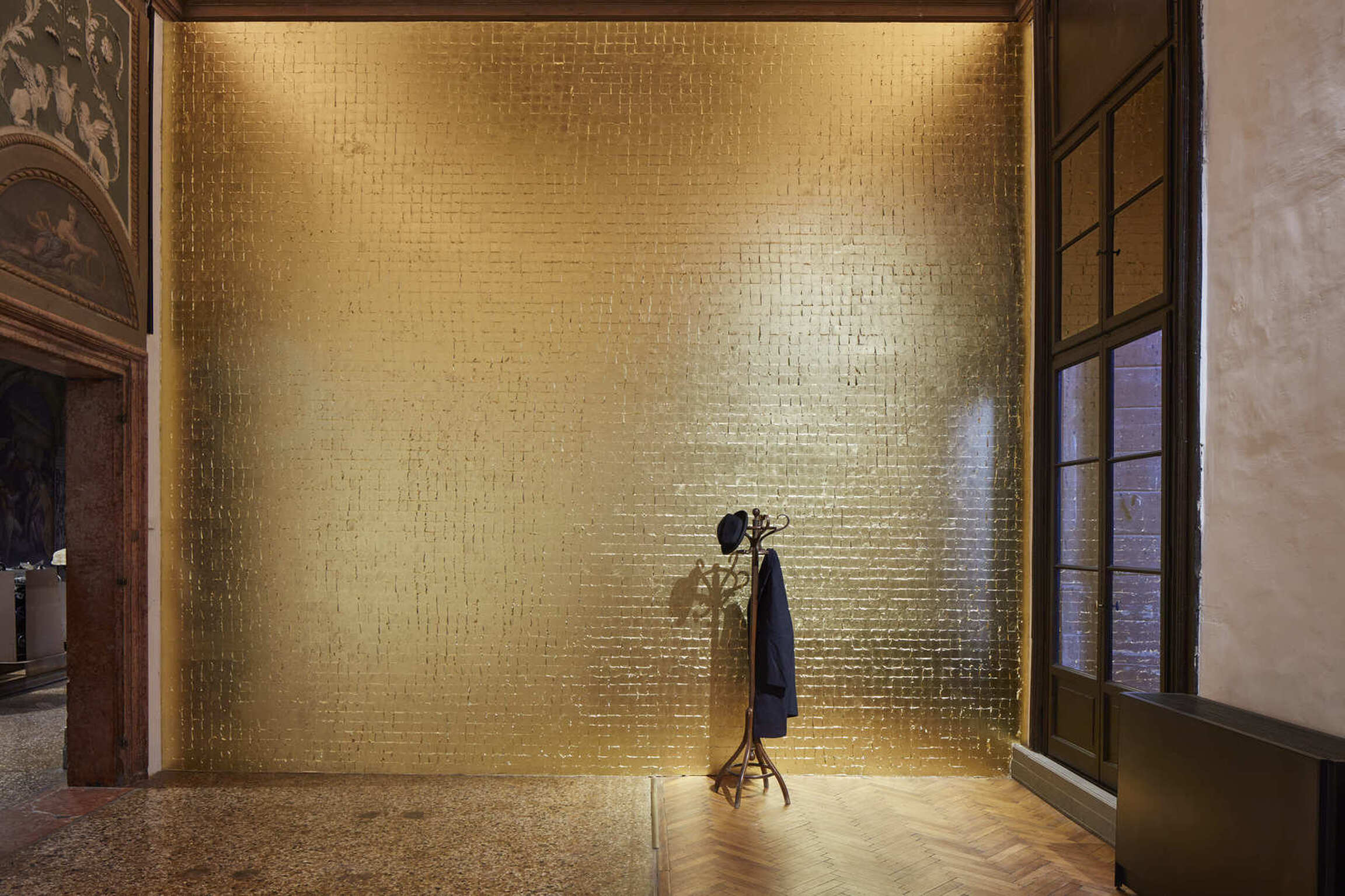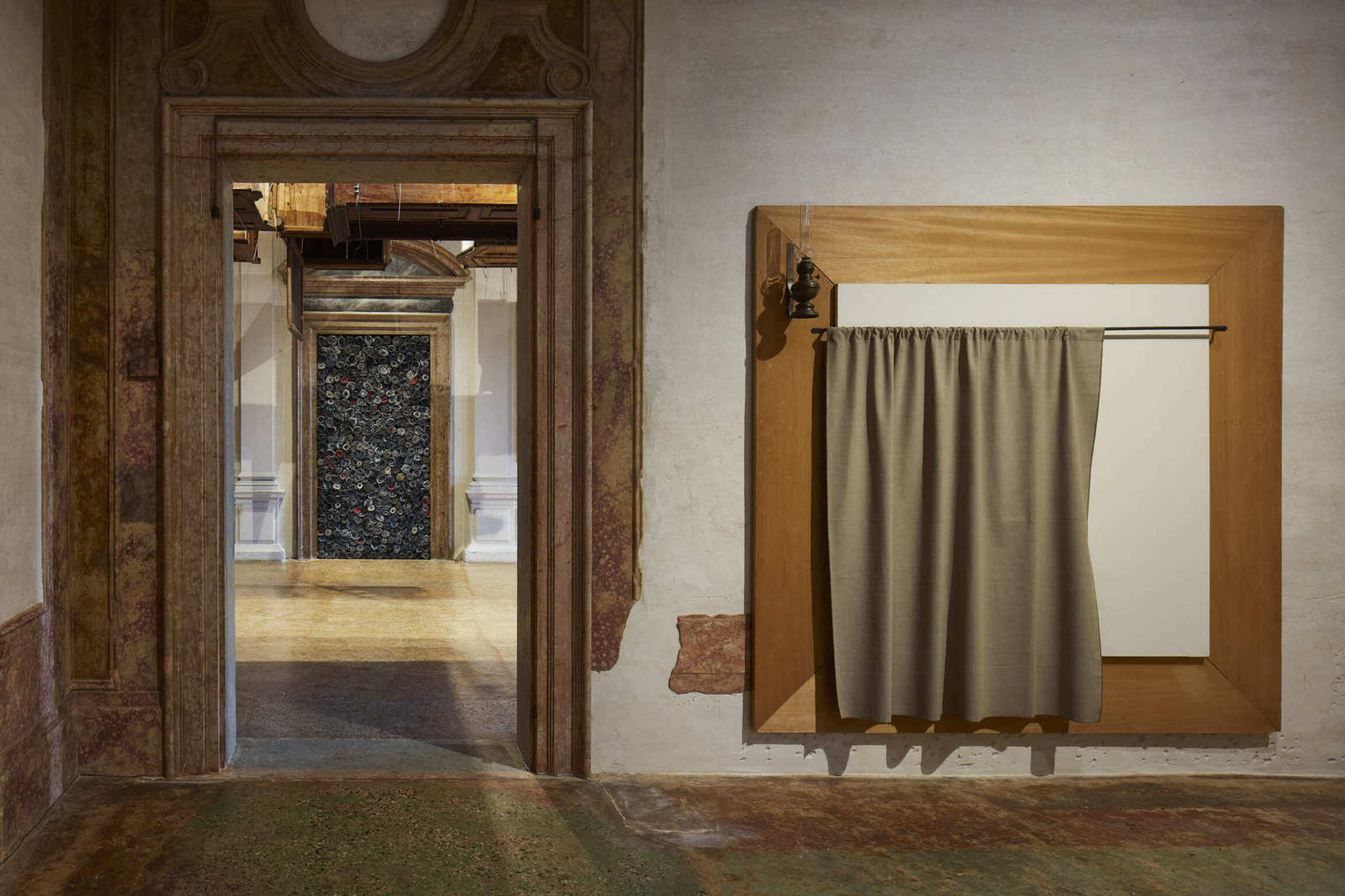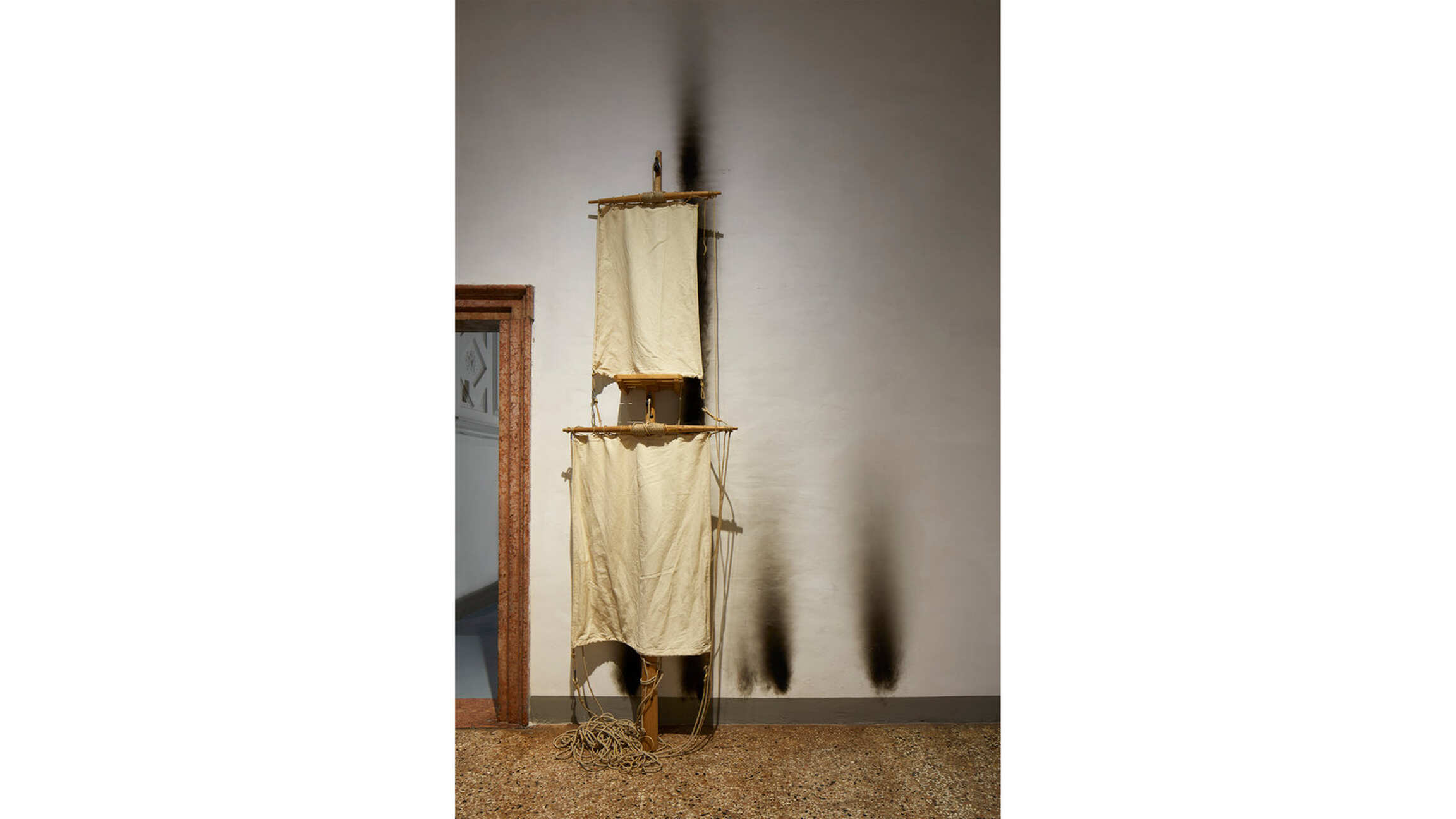The exhibition narrative is completed with large-scale installations realized by Kounellis from the end of the 1980s. These ensembles envelop shelves or metal constructions containing objects of various origins: from musical instruments to sacks, from plaster casts to stones, from coats to glasses, from mechanical gears to fragments of furniture. The large interventions hosted in the central rooms of the two main floors of Ca’ Corner della Regina are included in this context. Already as early as 1967 Kounellis dealt with the motifs of gravity and equilibrium in his works. However, it wasn’t until the 1980s and 1990s that he developed a deeper dialogue with architectural and urban spaces. Both of these aspects would result in the monumental 1992’s installation presented in the internal courtyard of the Venetian palazzo. Originally conceived for the external façade of a building in Barcelona, it is composed of seven metal plates that support sacks filled with coffee beans.
