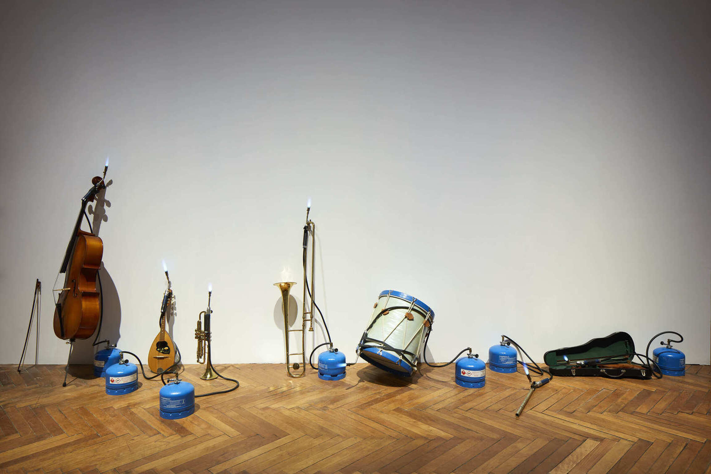 Kounellis moved from a written and pictorial language to a physical and environmental one. Thus the use of organic and inorganic entities transformed his practice into corporeal experience, conceived as a sensorial transmission. In particular, the artist explored the sound dimension through which a painting is translated into sheet music to play or dance to. Already in 1960, Kounellis began chanting his letters on canvas, and in 1970 the artist included the presence of a musician or a dancer. An investigation into the olfactory, which began in 1969 with coffee, continued through the 1980s with elements like grappa, in order to escape the illusory limits of the painting and join with the virtual chaos of reality.