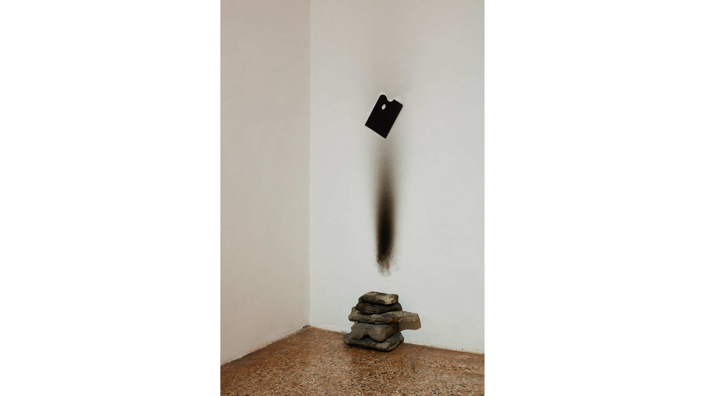 Beginning in 1967, the year of the so-called “fire daisy,” the phenomenon of combustion began to appear frequently in the artist’s work: a “fire writing” that enlights the transformative and regenerative potential of flames. At the height of the mutation, according to alchemical tradition, we find gold, employed by the artist in multiple ways. In the installation Untitled (Tragedia civile) (1975), the contrast between the gold leaf that covers a bare wall and the black clothing hanging on a coat hanger underlines the dramatic nature of a scene that alludes to a personal and historical crisis. In Kounellis’ work smoke, naturally connected with fire, functions both as a residual of a pictorial process, and as proof of the passage of time. The traces of soot on stones, canvases and walls that characterize some of his works from 1979 and 1980 indicate a personal “return to painting,” in opposition to the anti-ideological and hedonistic approach employed in a large part of the painting production in the 1980s.