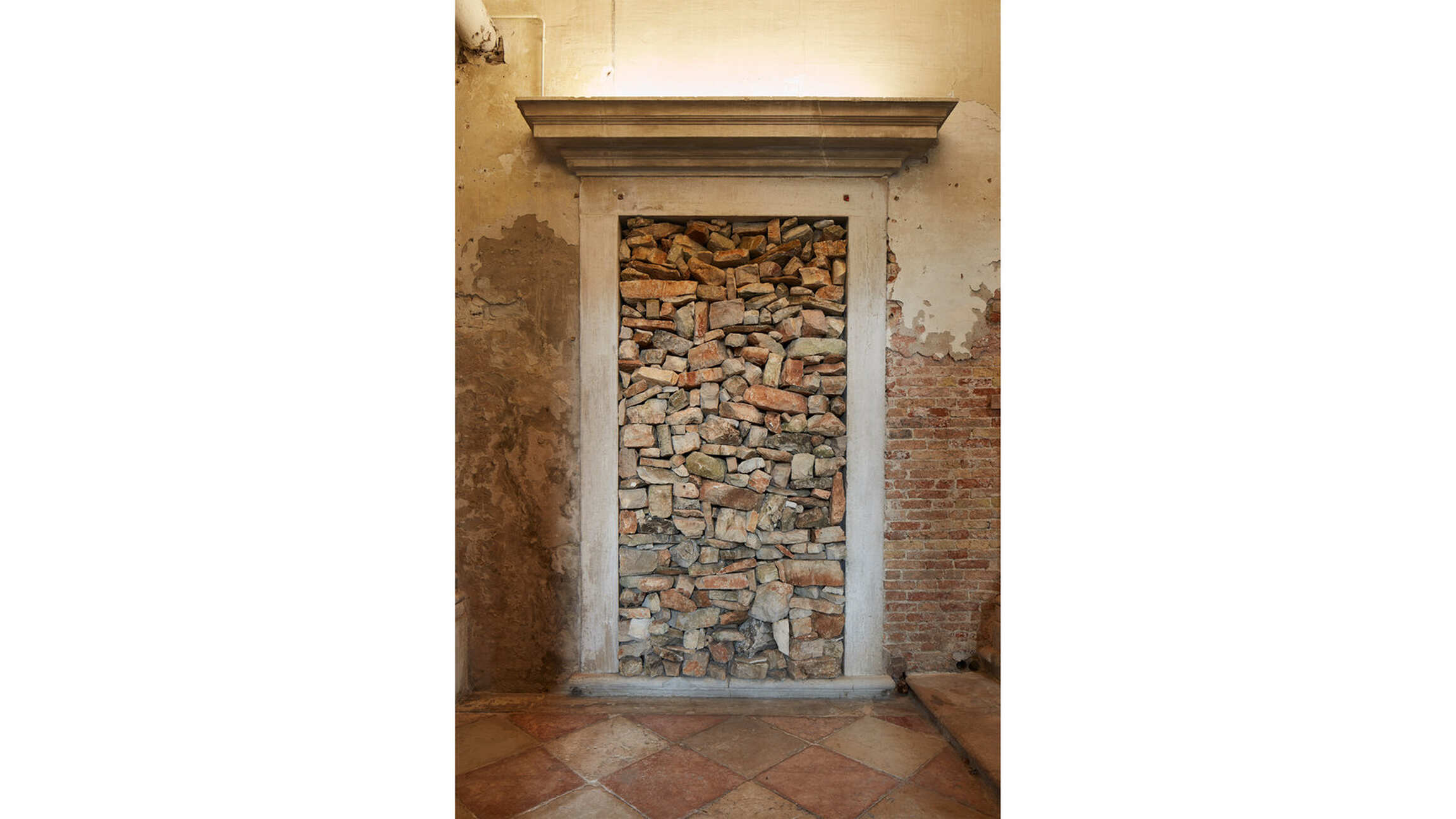 Throughout his artistic research Kounellis develops a tragic and personal relationship with culture and history, avoiding a refined and reverential attitude. He would eventually represent the past with an incomplete collection of fragments of classical statues, as in the work from 1974. Meanwhile, in other works the Greco-Roman heritage is explored through the mask, as in the 1973 installation made up of a wooden frame on which plaster casts of faces are placed. The door is another symbol of the artist’s intolerance for the dynamics of his present. The passageways between rooms are closed up with stones, iron reinforcing bars and lead sheets making several spaces inaccessible in order to emphasize their unknown, metaphysical and surreal dimension.