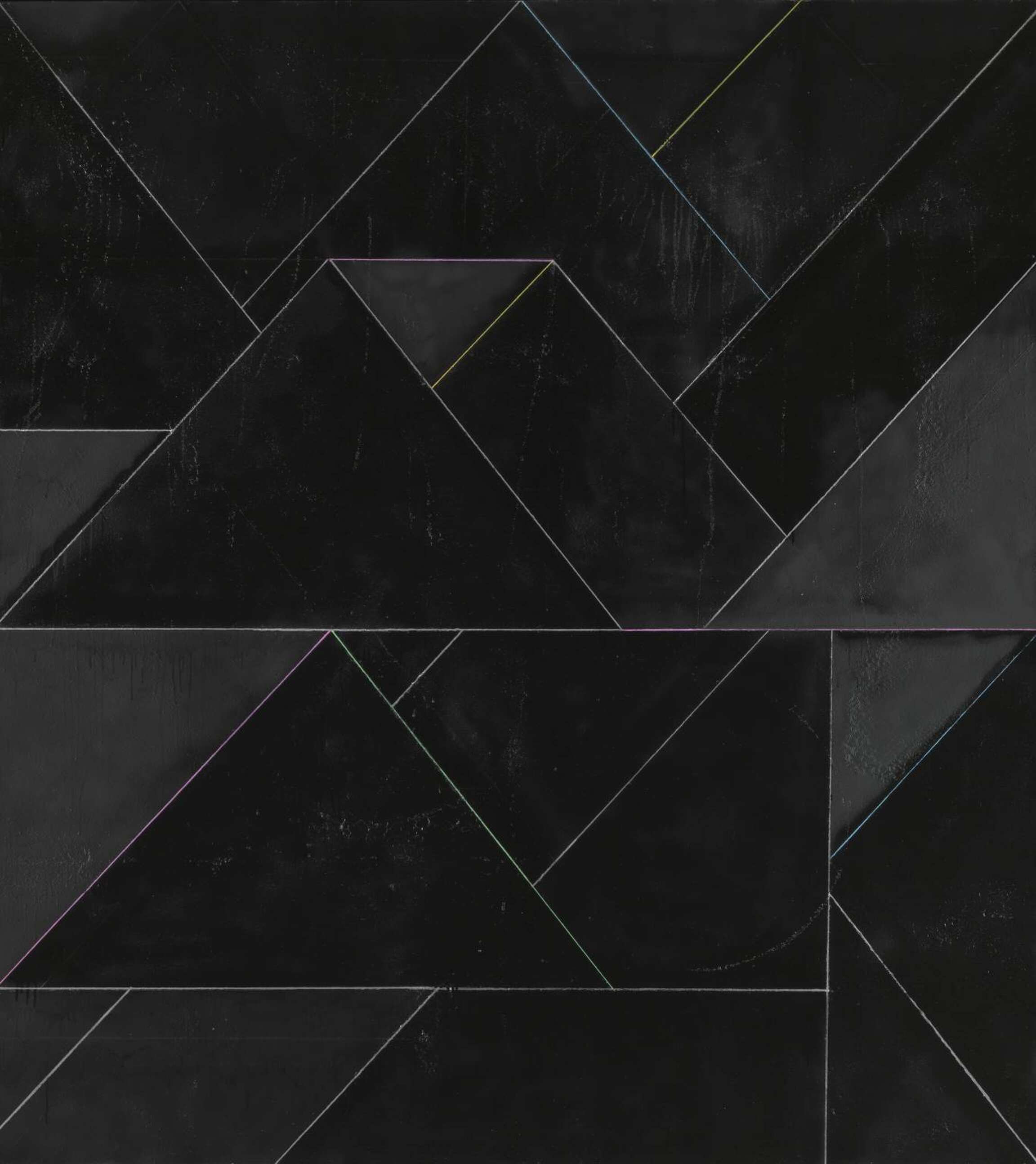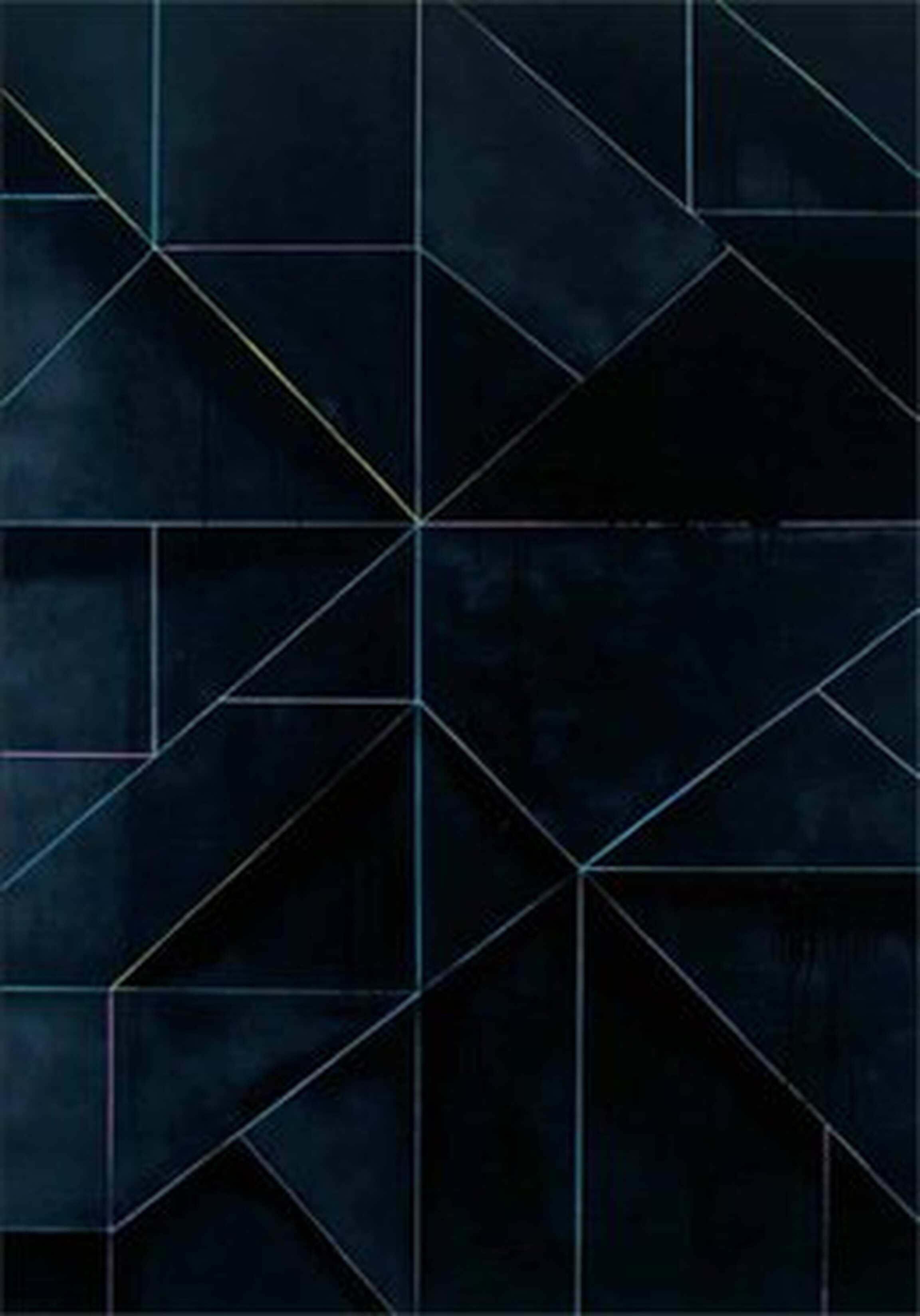 In The Melancholy of Departure 2006, delicate coloured lines delineate triangular black forms that sit in front of, behind or hover alongside each other. The eye is kept moving around and back and forth between these interconnected geometric shapes, carried along by electric blue, green and pink lines, just as neon light pierces the darkness. As if created by a malfunctioning spider, the grid of this linear network seems to have its own logic while rigorously denying order or pattern. The title refers to a 1914 painting by Giorgio de Chirico, Gare Montparnasse (The Melancholy of Departure), which features the symbolic departure of a steam train. It is a scene in which perspective has broken down, signalling a sense of loss but also liberating escape. In the arresting Country 10 2006, a loosely painted, pale green sphere, suggestive of a frail sun or alien moon, is suspended in a roughly-drawn cube scratched out of the blackened ground of the canvas. Like Country 10, the fictional location for the radical opera Victory over the Sun, first performed in 1913 in St Petersburg with sets and costumes designed by the Russian artist Kasimir Malevich2, Peri’s painting evokes a bleak futuristic world in which darkness dominates.