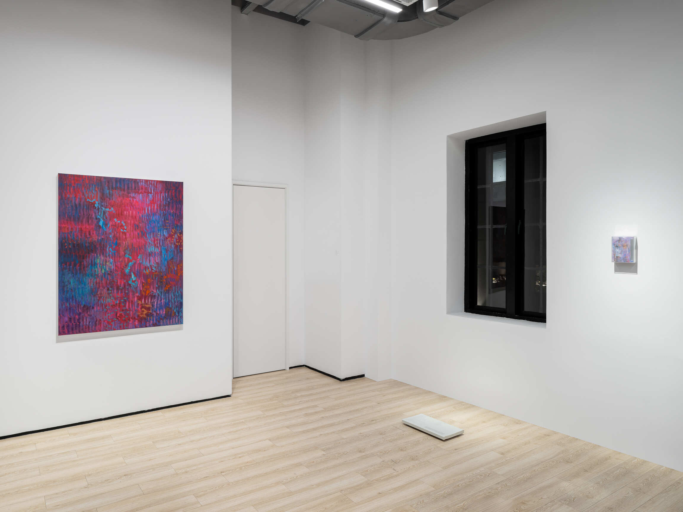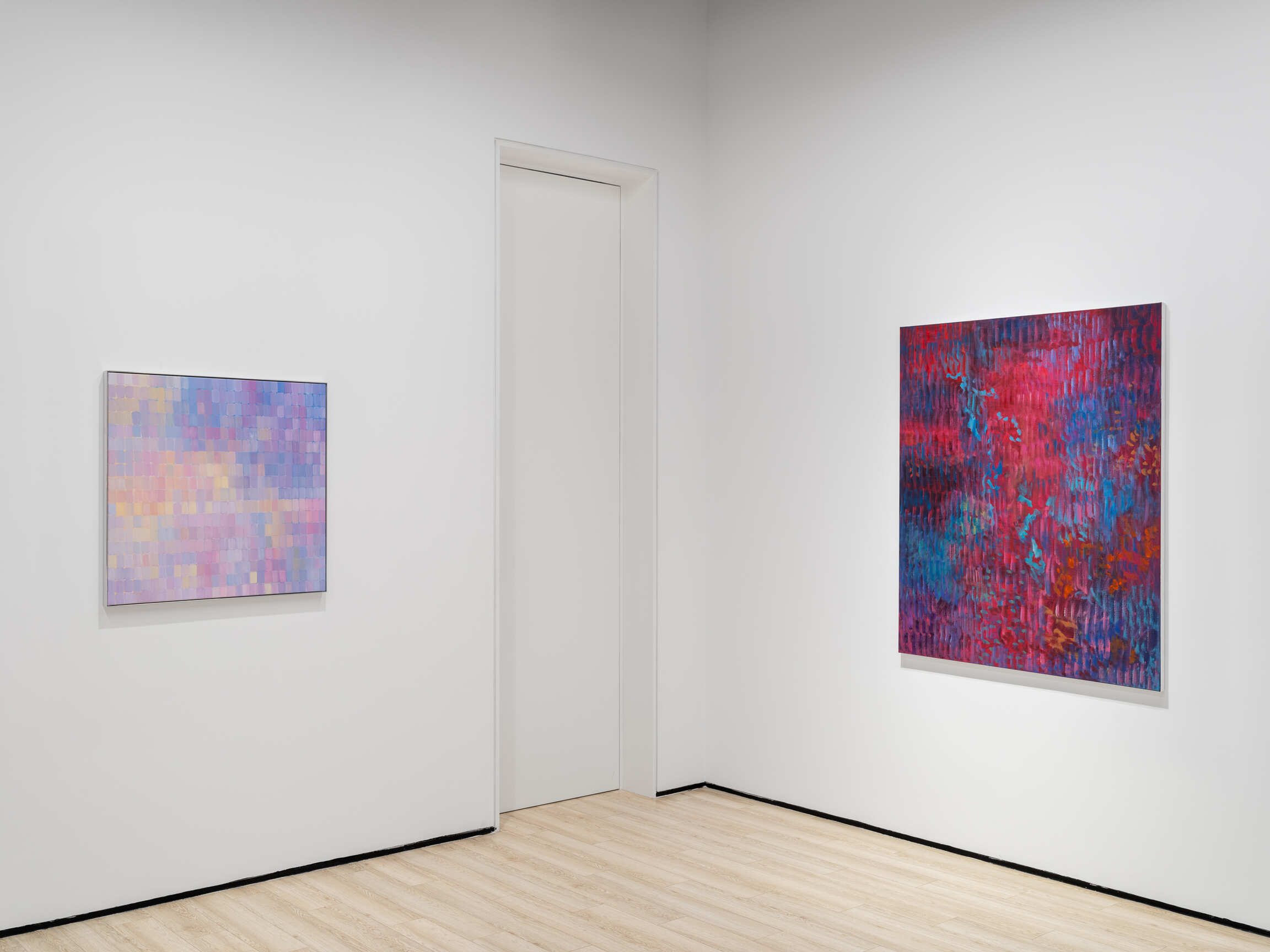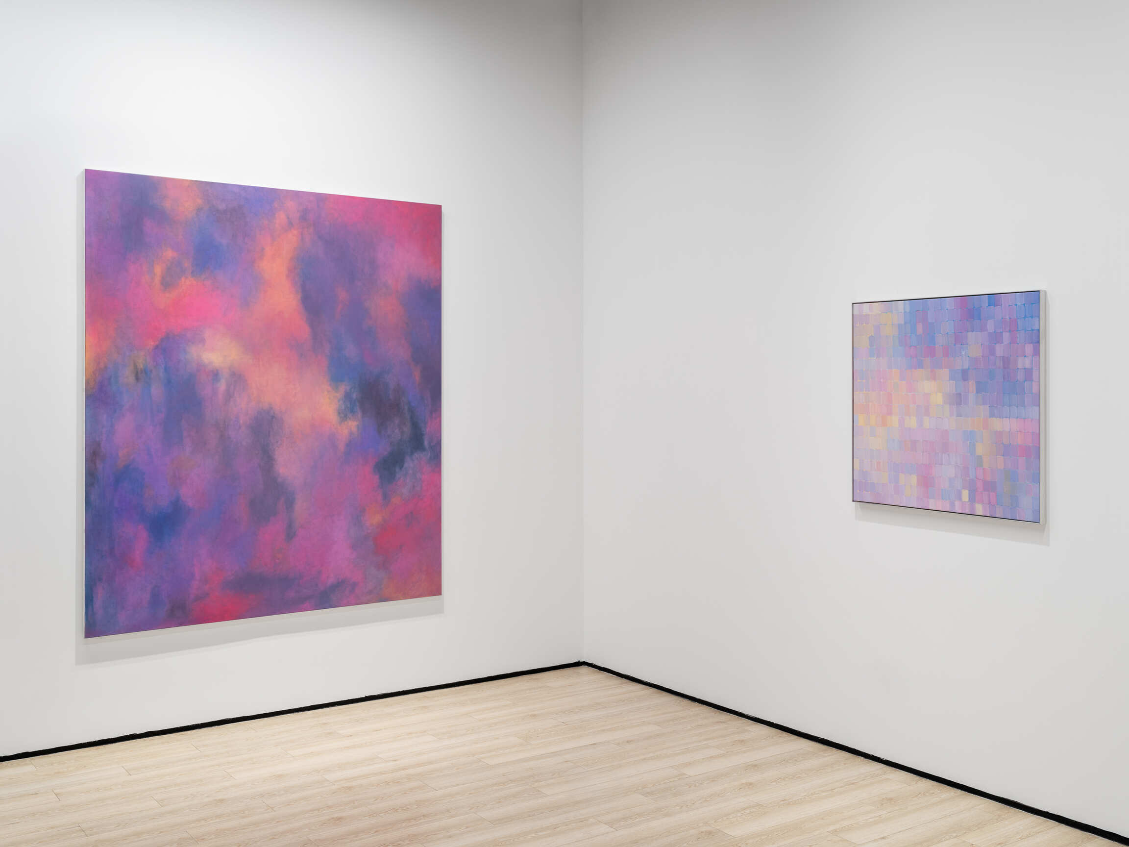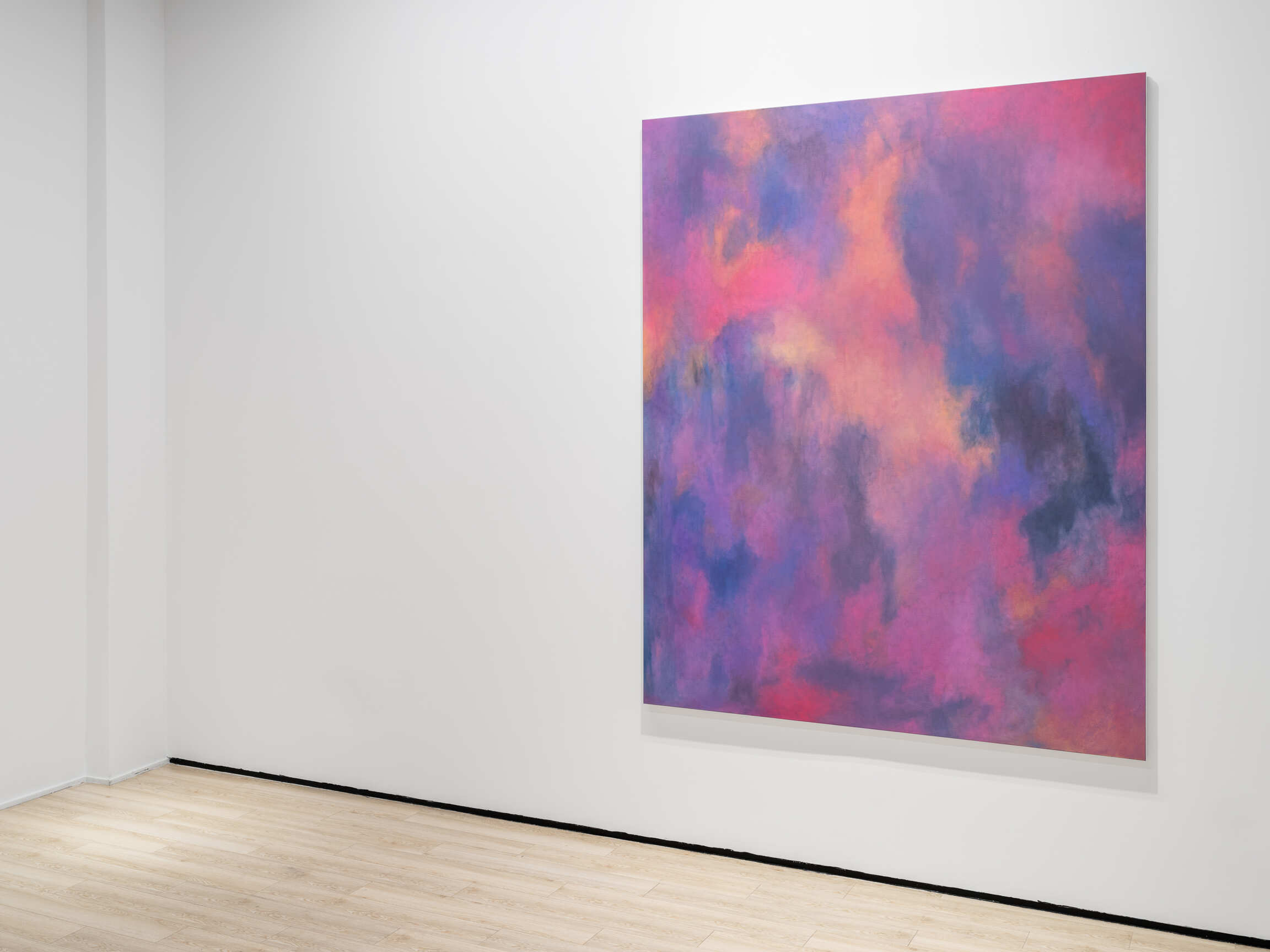 Bringing together paintings from different series, this presentation is unified by a singular chromatic color palette—a gradation from pink to blue, passing through mauve and purple.