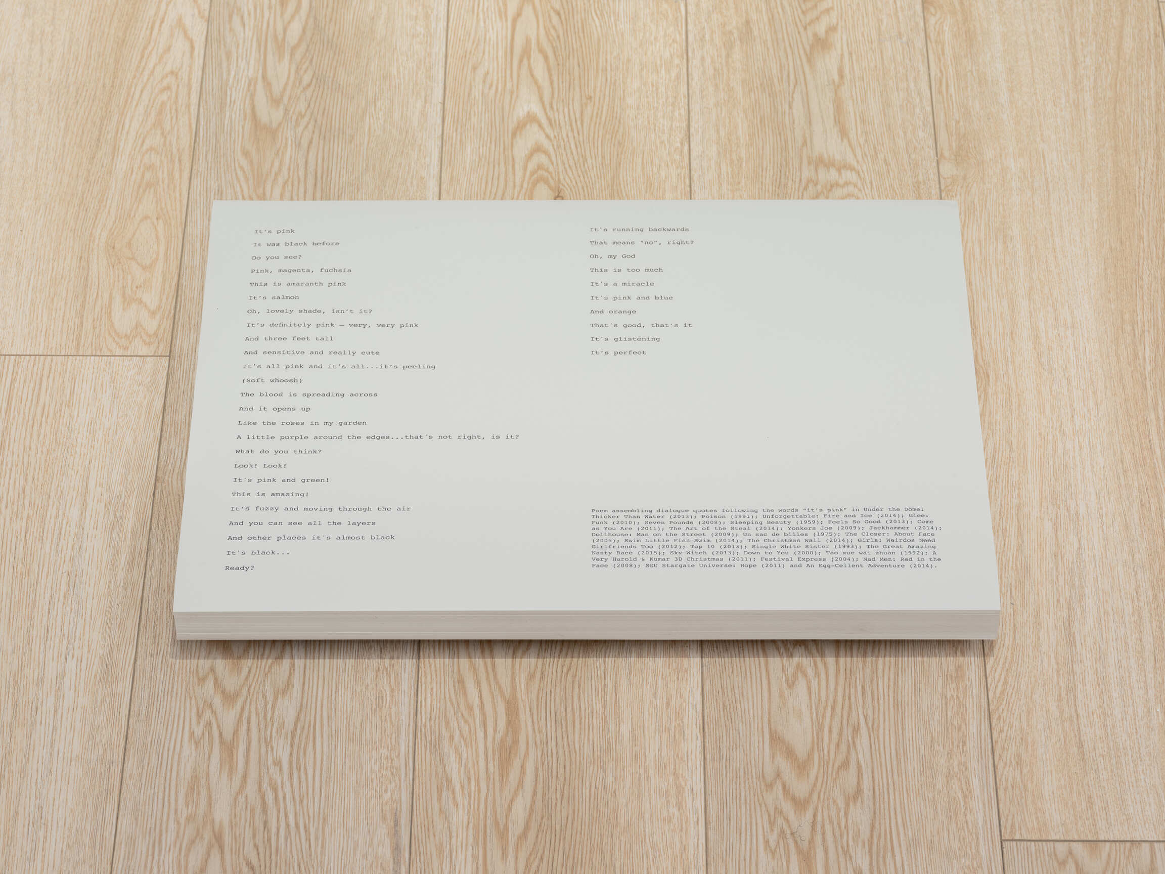 Jean-Baptiste Bernadet’s four paintings are accompanied by "It’s pink" (2024), a text piece by Maxime Fauconnier (b.1989, lives and works in Brussels), an assemblage of quotes from film dialogues following the words "it's pink". Presented in the space as a stack of free posters, Fauconnier’s poem doubles as the exhibition text.