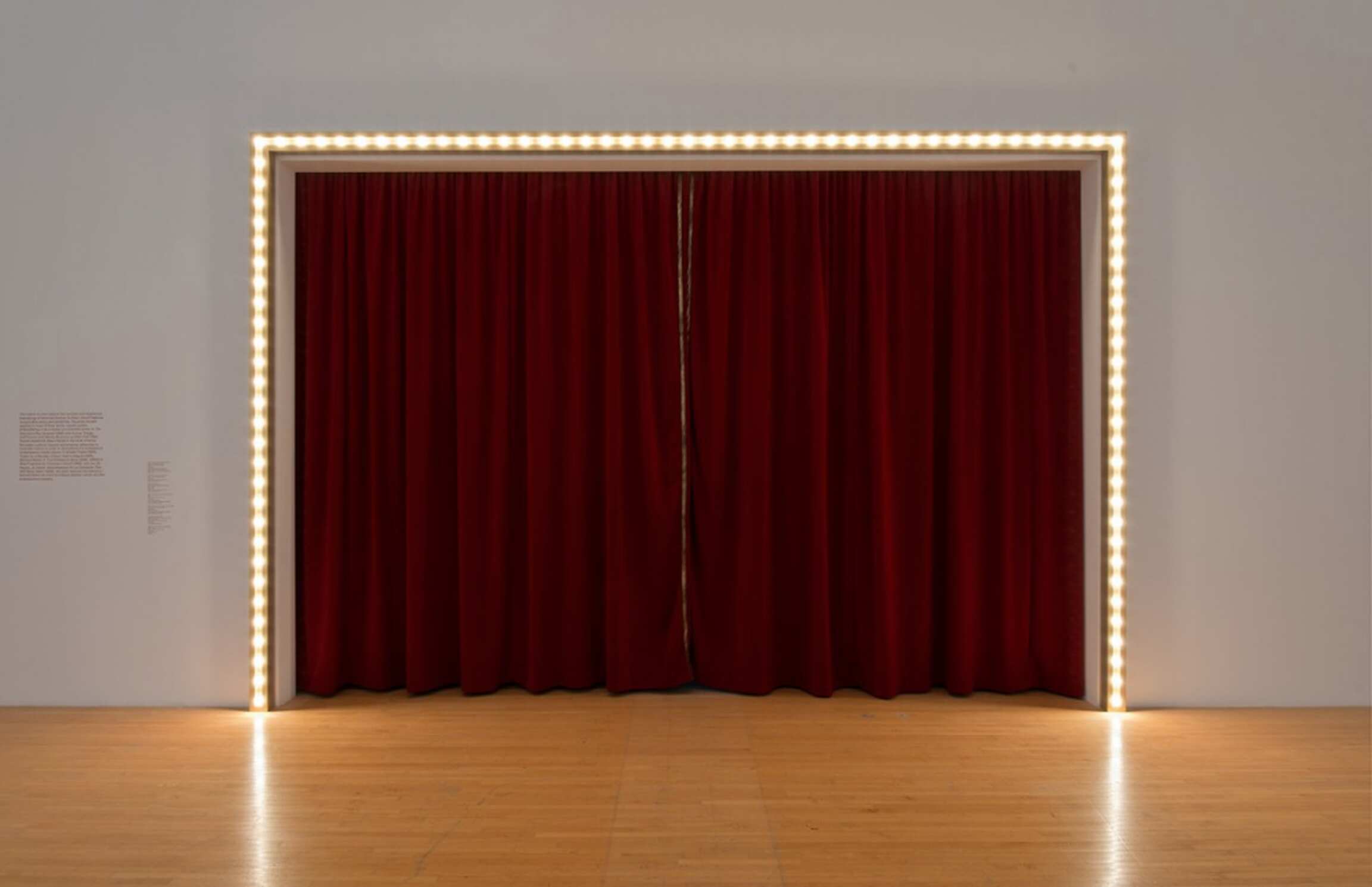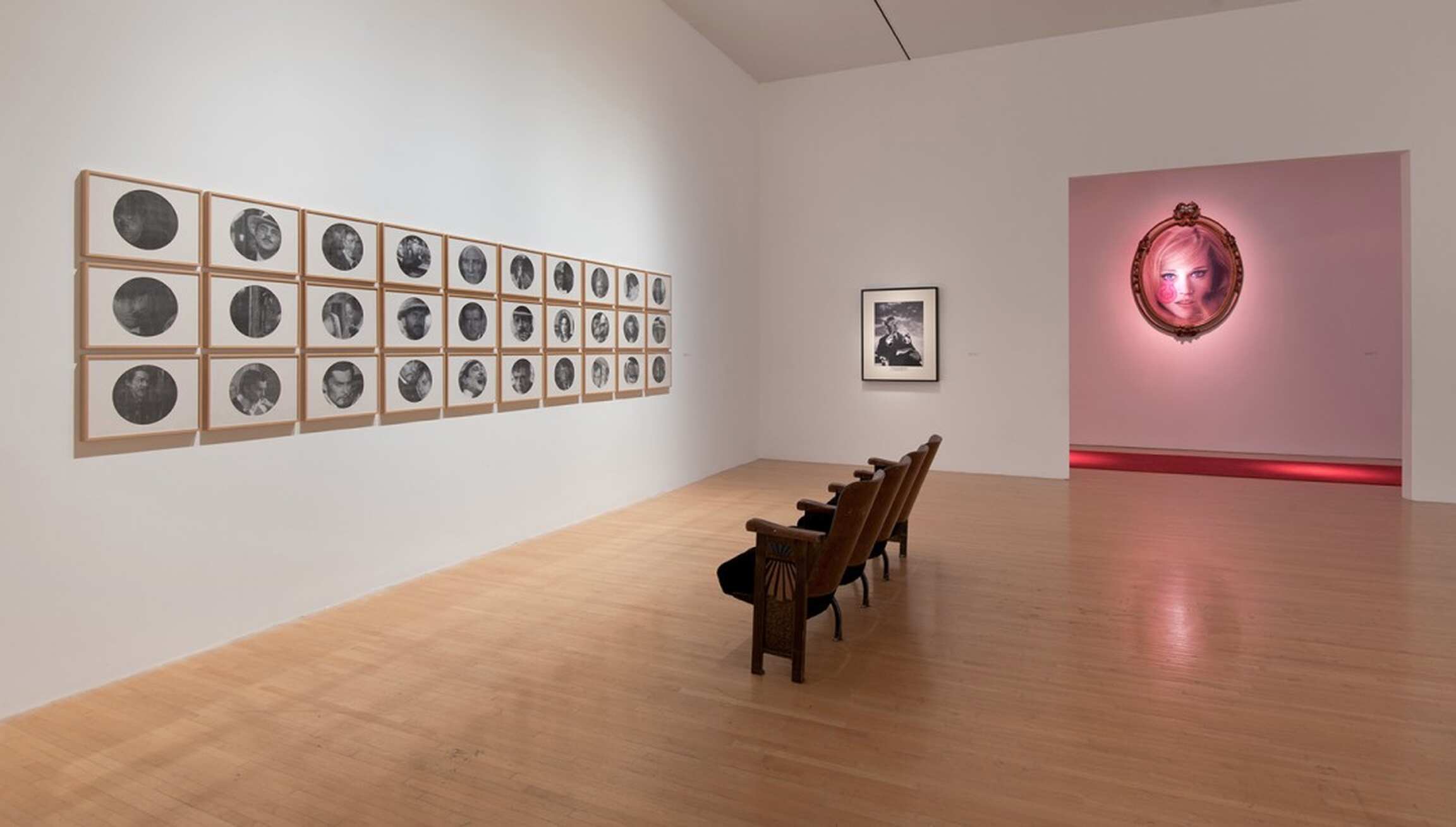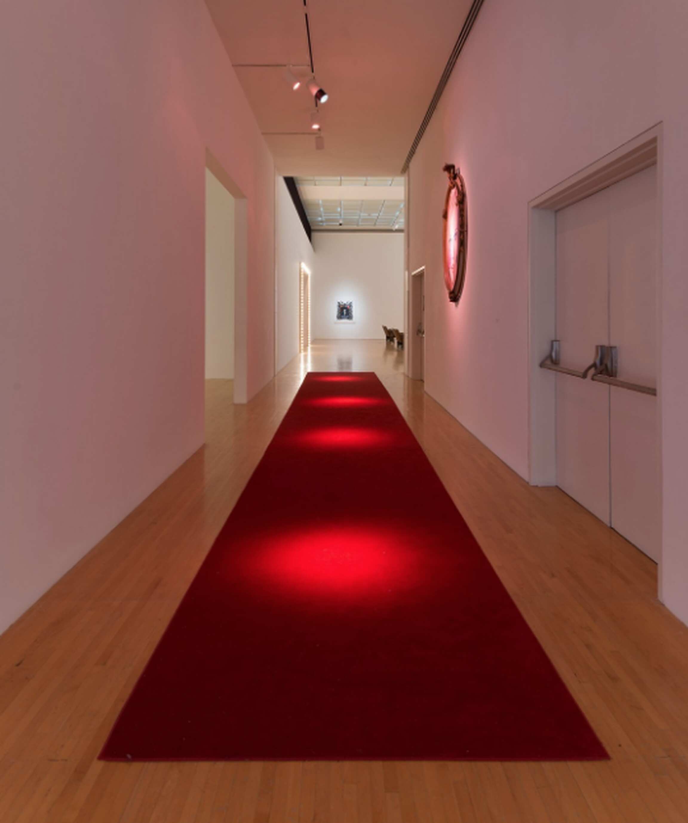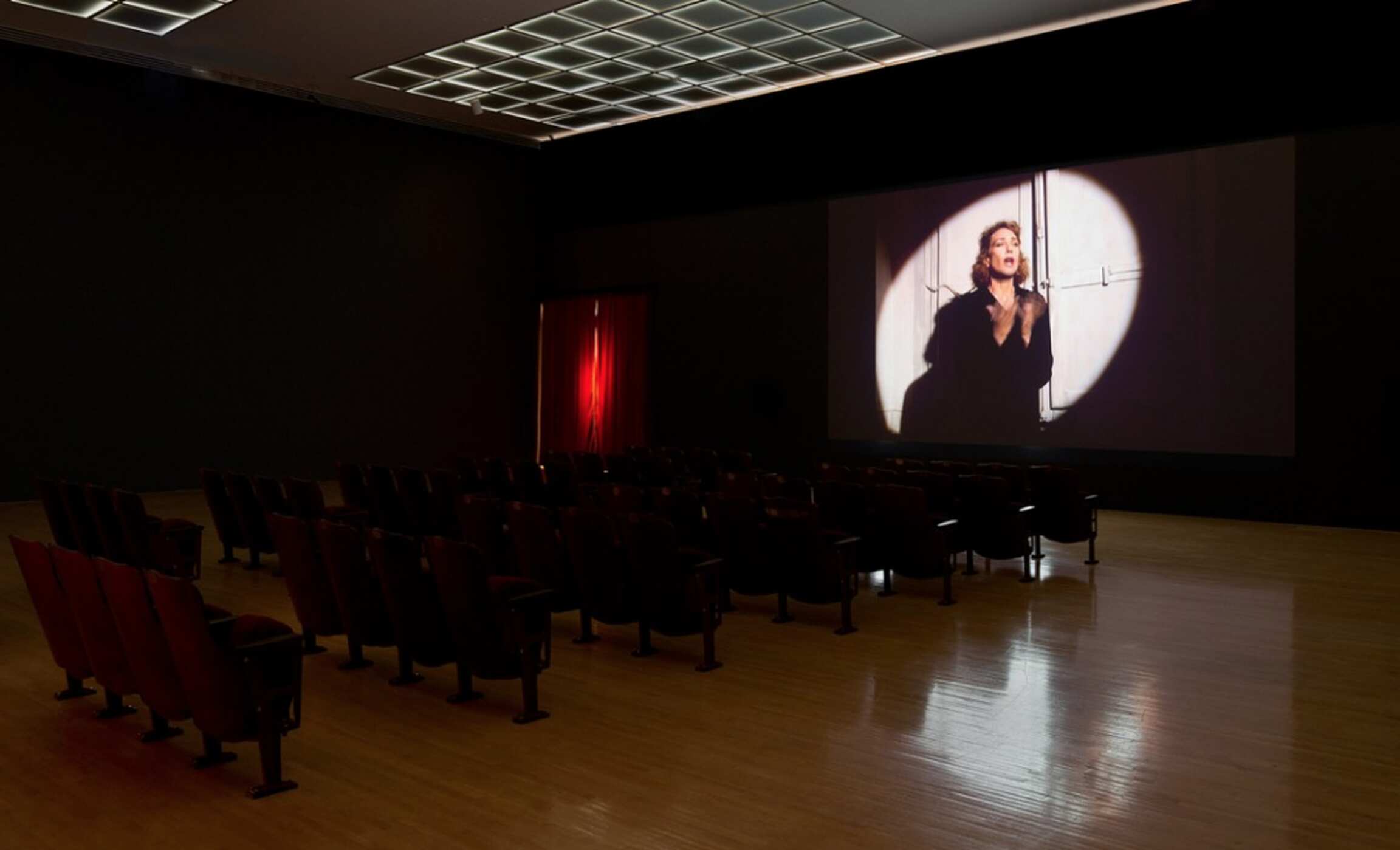 At the core of the exhibition is a theater-like space sharing the exhibition's title, Cinema Vezzoli. The selection of videos screened here feature well-known contemporary actors Marisa Berenson, Milla Jovovich, Eva Mendes, Helen Mirren, Natalie Portman, and Michelle Williams. Upon exiting the theater, visitors are presented with a large tapestry depicting the opening credits from Sono come tu mi vuoi (As You Desire Me, 2007), a film starring legendary Swedish American actress Greta Garbo. Vezzoli's fascination with larger-than-life personalities comes full circle with the inclusion of Portrait of Sophia Loren as the Muse of Antiquity (After Giorgio de Chirico) (2011), installed in the museum's courtyard.