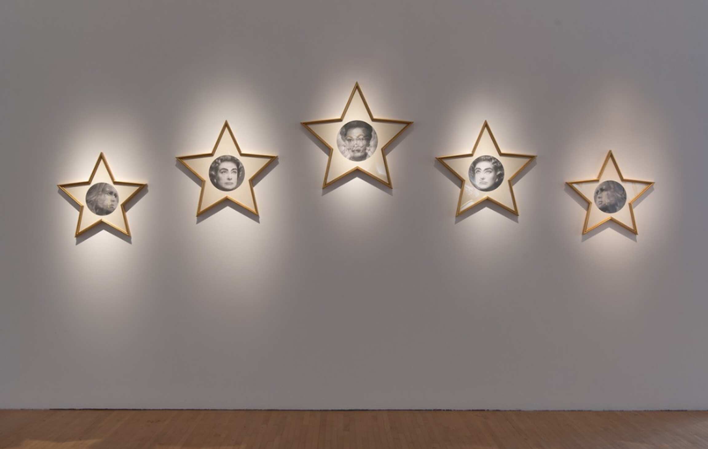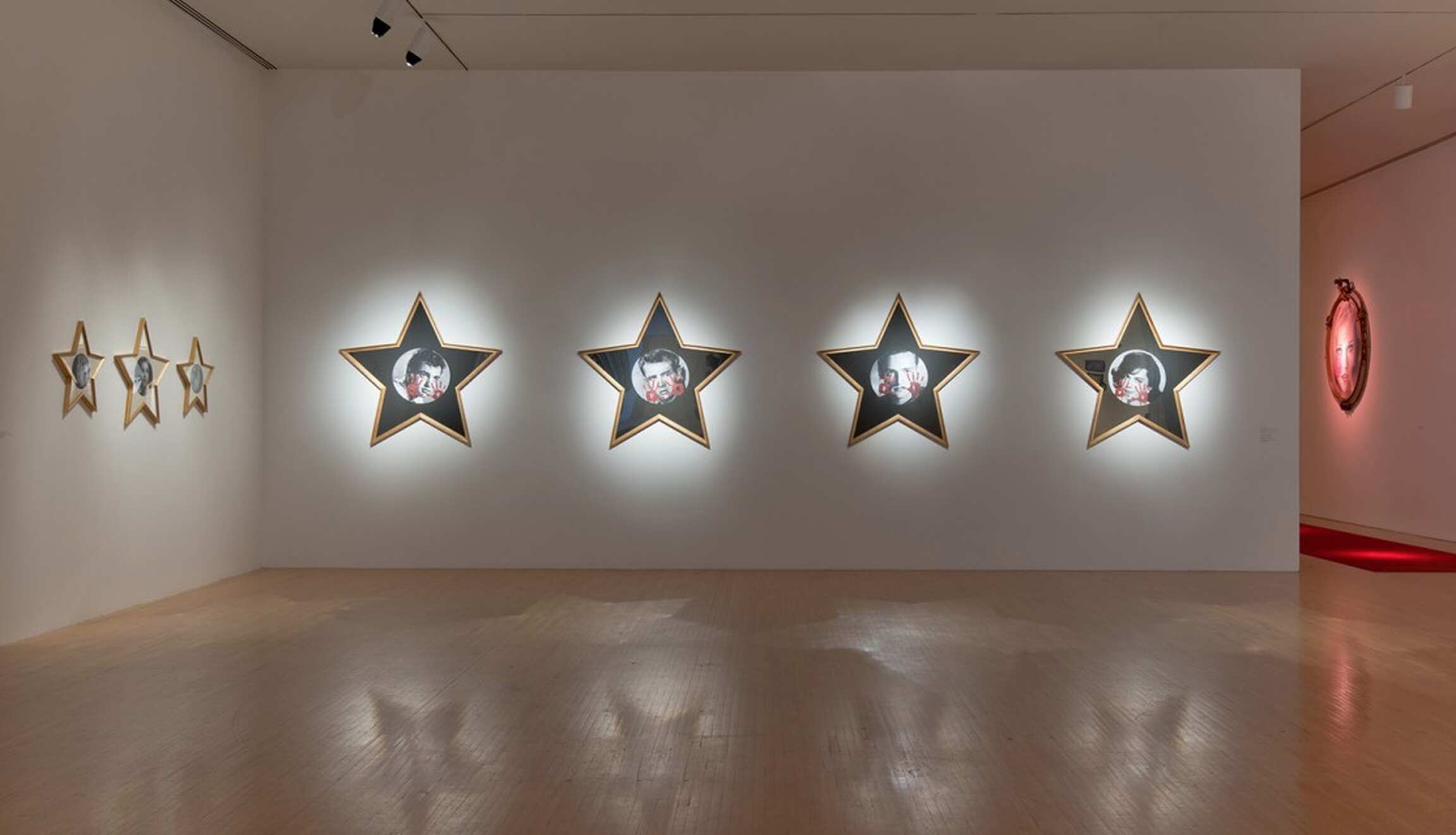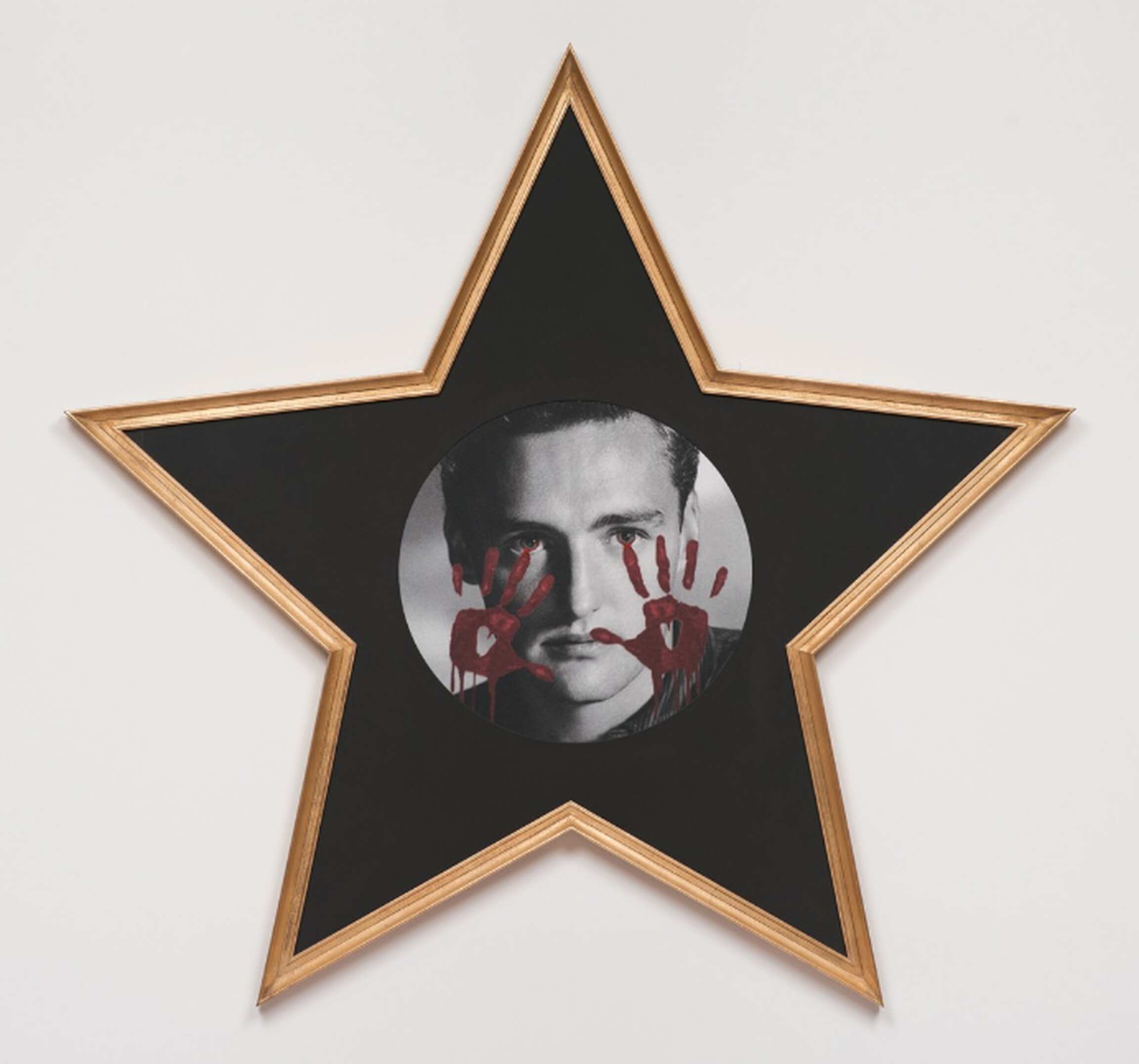 In a series of portraits of movie icons in star-shaped frames, reminiscent of the stars on the Hollywood Walk of Fame, long streams of embroidered tears emanate from the eyes of Katharine Hepburn and Spencer Tracy. A gallery dedicated to Italian filmmaker Luchino Visconti, an influential figure in Vezzoli's oeuvre, displays teary-eyed portraits of actors from the director's celebrated films Senso (1954) and Death in Venice (1971). The sorrow portrayed in these works represents life's intrinsic drama, existing regardless of wealth or fame.