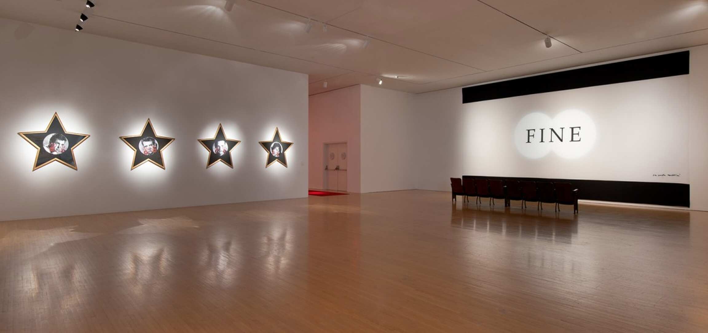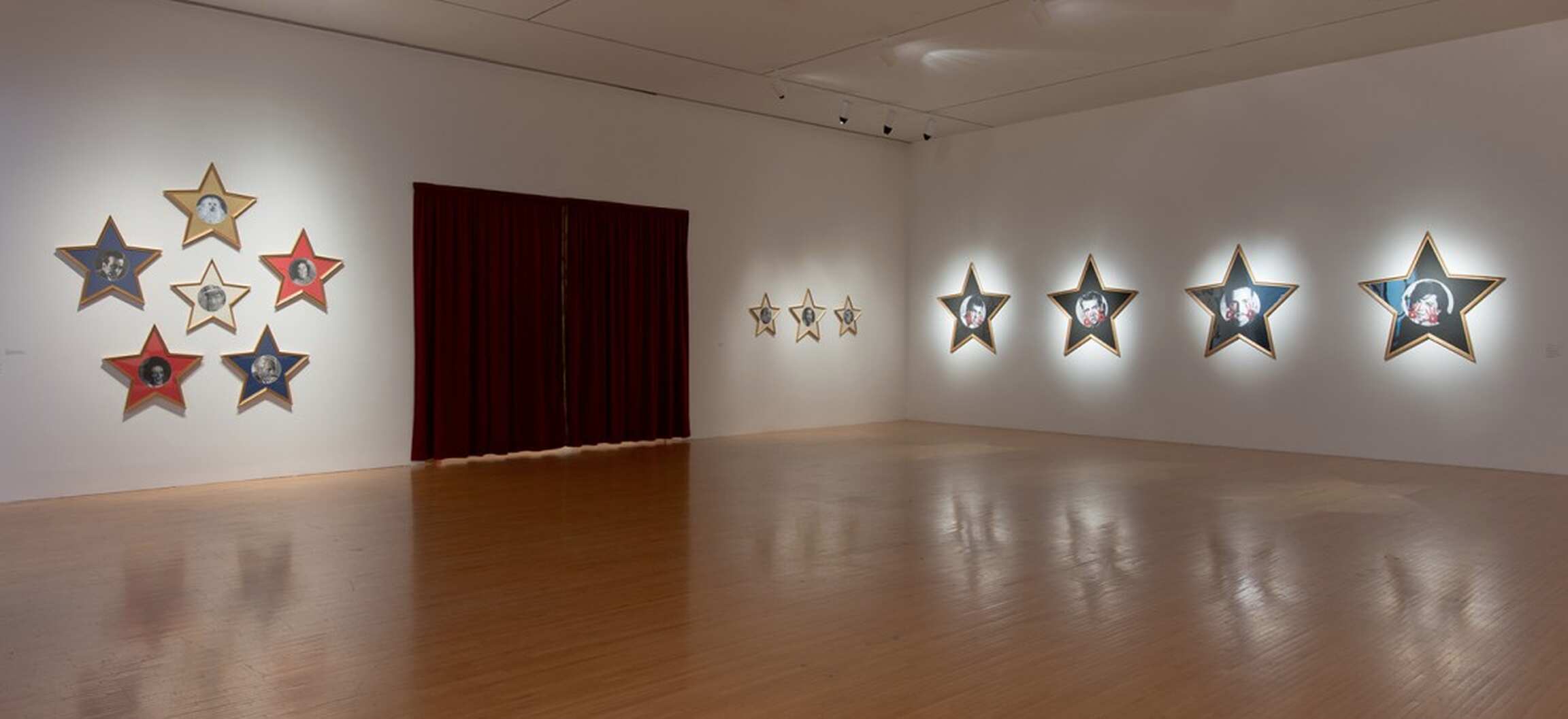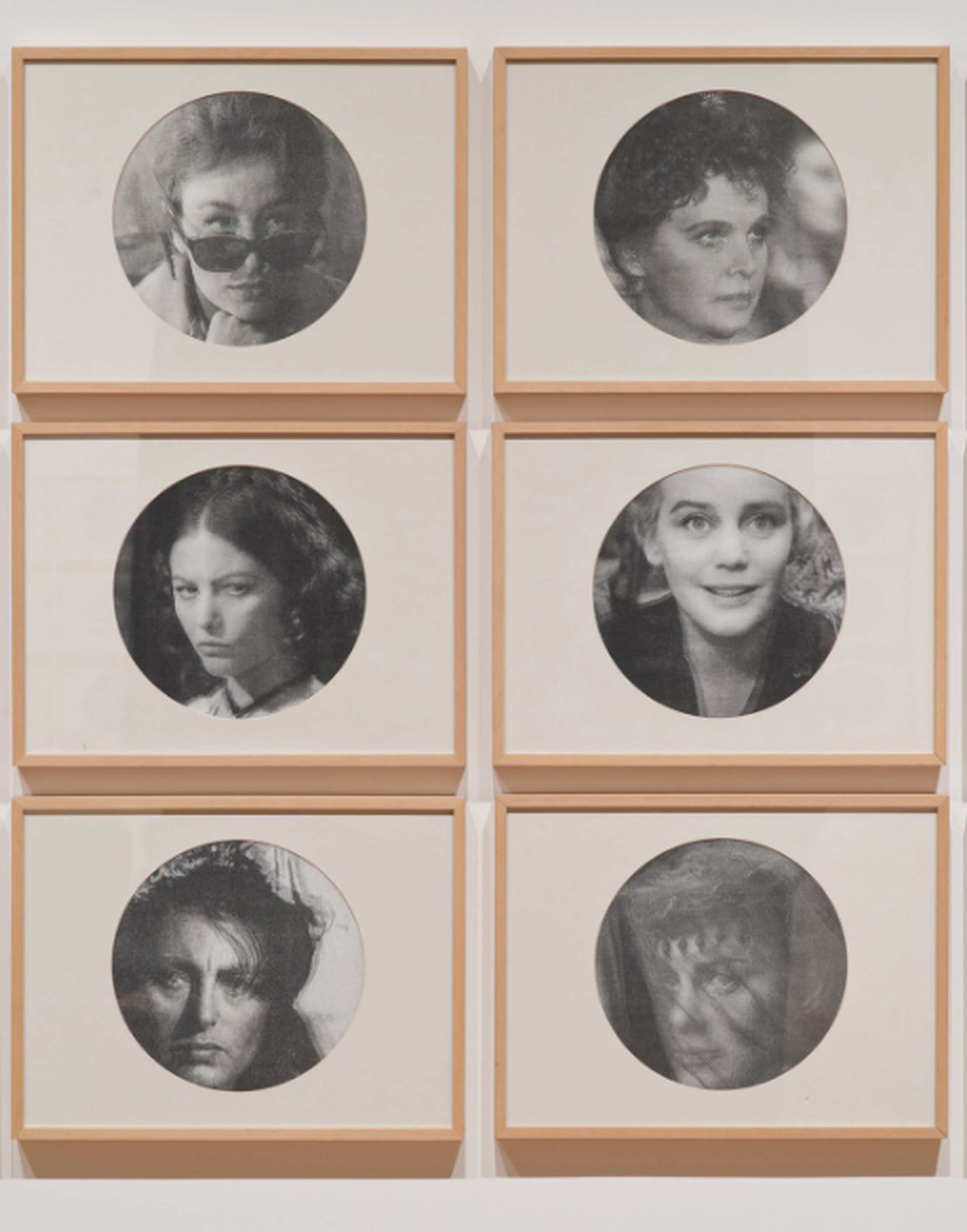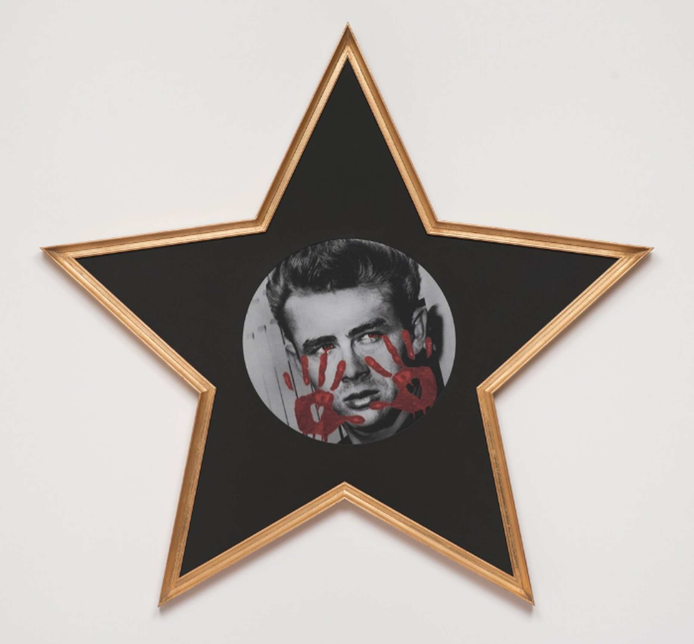 In a series of portraits of movie icons in star-shaped frames, reminiscent of the stars on the Hollywood Walk of Fame, long streams of embroidered tears emanate from the eyes of Katharine Hepburn and Spencer Tracy. A gallery dedicated to Italian filmmaker Luchino Visconti, an influential figure in Vezzoli's oeuvre, displays teary-eyed portraits of actors from the director's celebrated films Senso (1954) and Death in Venice (1971). The sorrow portrayed in these works represents life's intrinsic drama, existing regardless of wealth or fame.