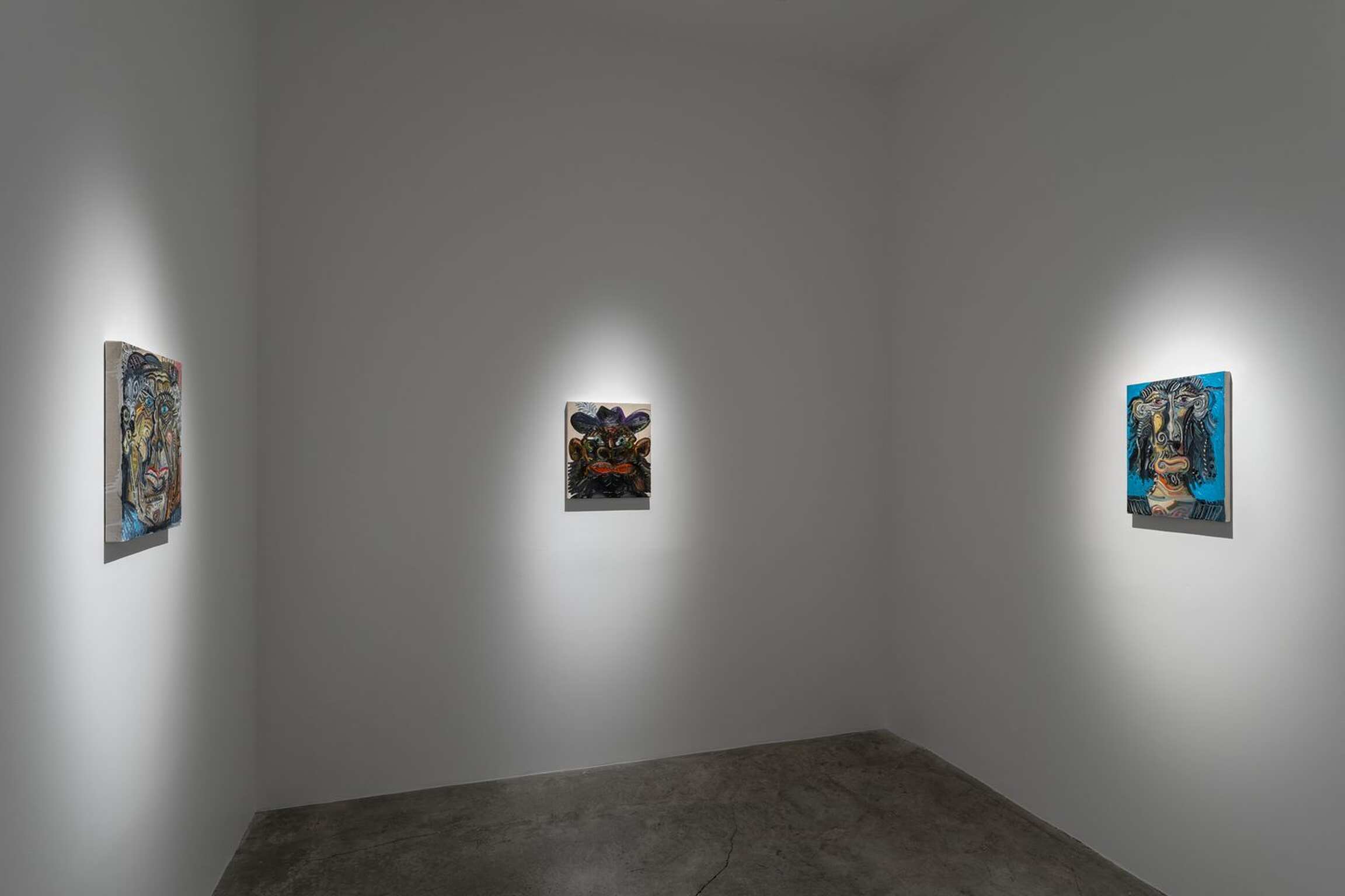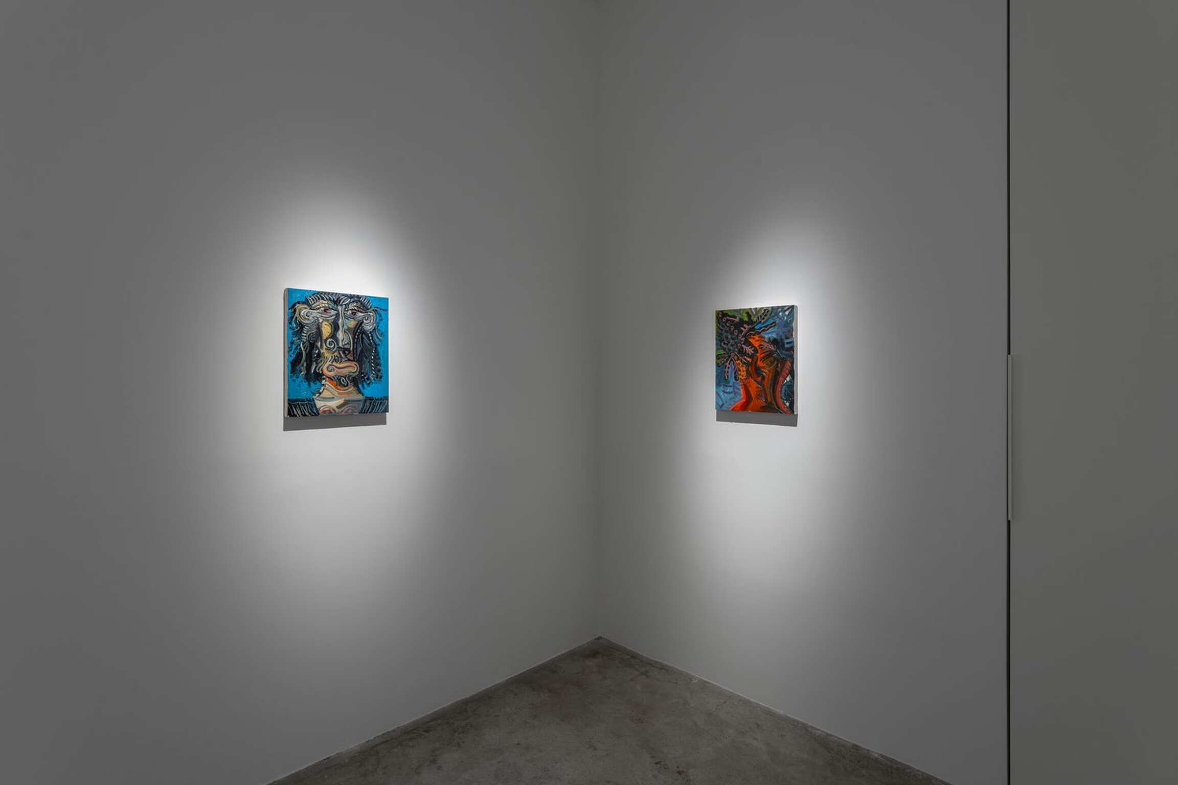 The cartoonish faces of the characters in Moral Currency are rendered in varying styles, as if each is an actor wearing a mask. The exact time and place of these characters cannot be located – history is collapsed in on itself, as the contemporary viewer is forced to reckon with ‘perils past.’ The emphasis is both on these characters as individual players, and the scenes taking place between them. They are defined on their own terms but are also inextricably tied to the composition that they share, transformed by the larger scene taking place.