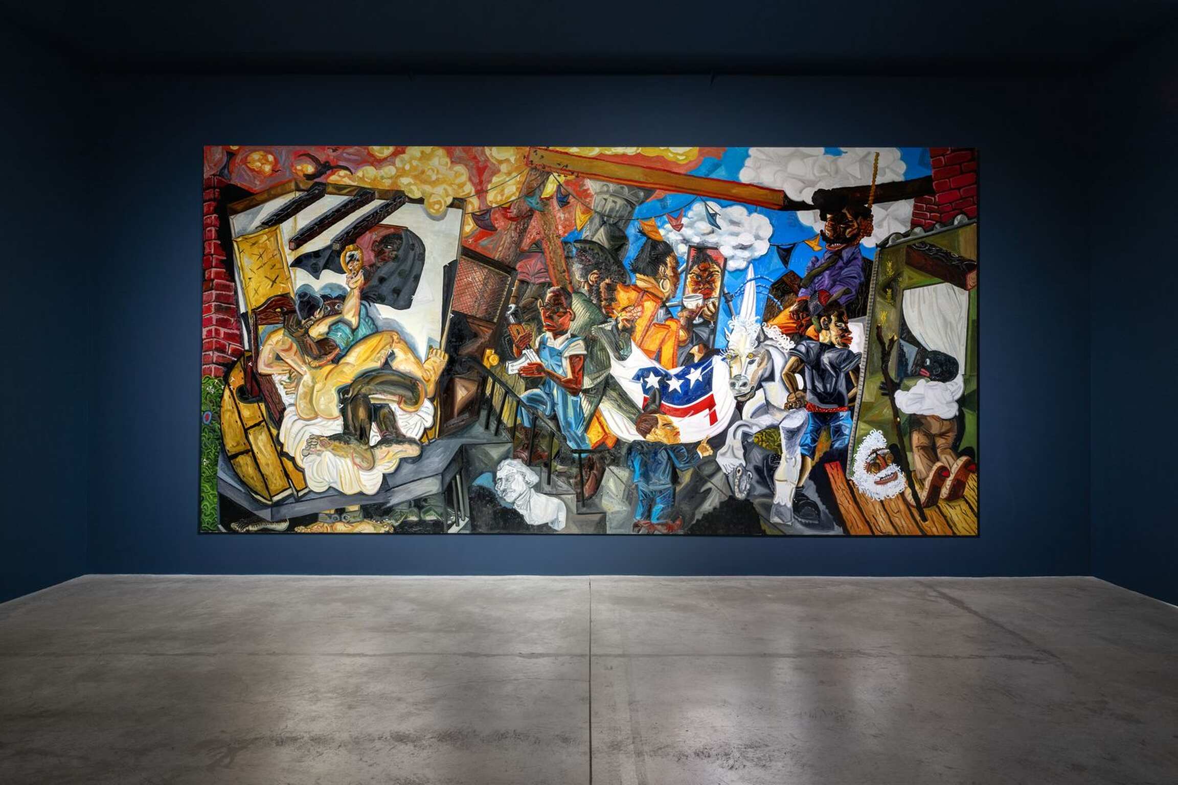 Take, for instance, the painting Moral Currency. The massive composition shares many similarities with the infamous Guernica by Picasso: the scale of the canvas, the interactions between man and animal, the jarring fusion of domestic interiors and the chaos ensuing just outside. Also similar to Picasso’s painting, the characters in the scene face outwards, as if they are actors presenting themselves to an audience. The disjunct relationship between figure and ground furthers this feeling of turmoil and confusion, making it unclear exactly where bodies, and the interactions between them, begin and end.