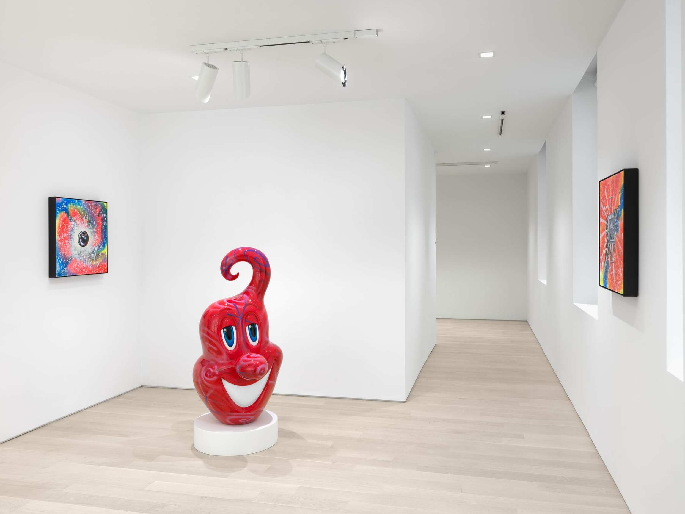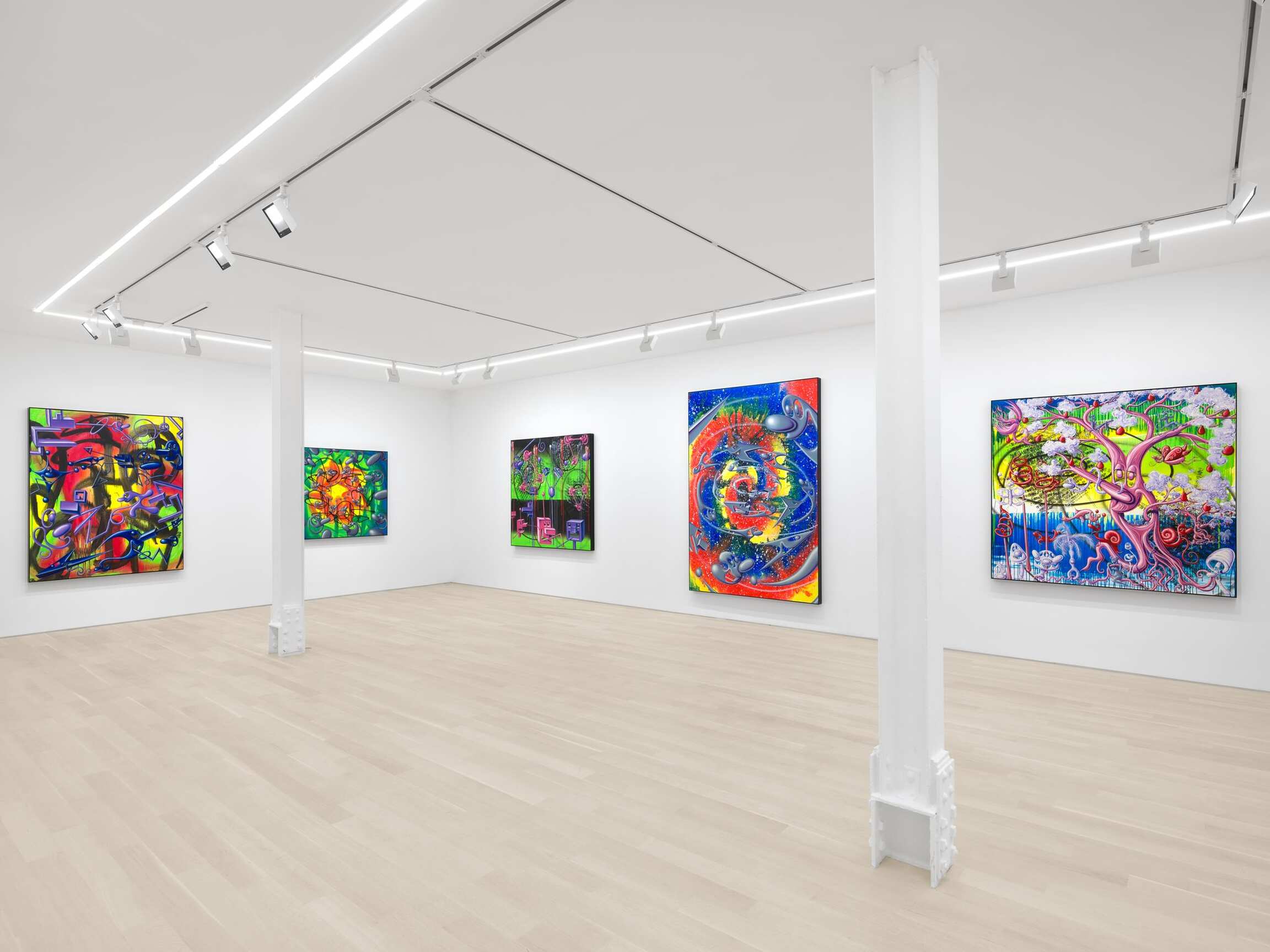 Scharf has been sounding these alarms for decades. With imagery he derived from popular cultures both beastly and benign, he made effervescent paintings that drew attention to the willful destruction of natural resources by commercial interests, yet were utterly engaging and even entertaining or, one might say, devilish. Nevertheless, it’s striking how closely the grinning, bulb-nosed tricksters in these 15 new works, several painted just before the coronavirus reached the United States, suggest a nimble virus multiplying, mutating and seeding a deceptively sweet universe radiating from a still fiery sun. At the same time, their rolling, crisscrossing trajectories evoke organisms that are all dressed up with no one to invade but themselves, thanks to the resilience of the human spirit. Which is art. Scharf can contain the pandemonium he paints within the edges of his canvas, if not in life, but the act at least raises the possibility that it can be done. Which feels right.