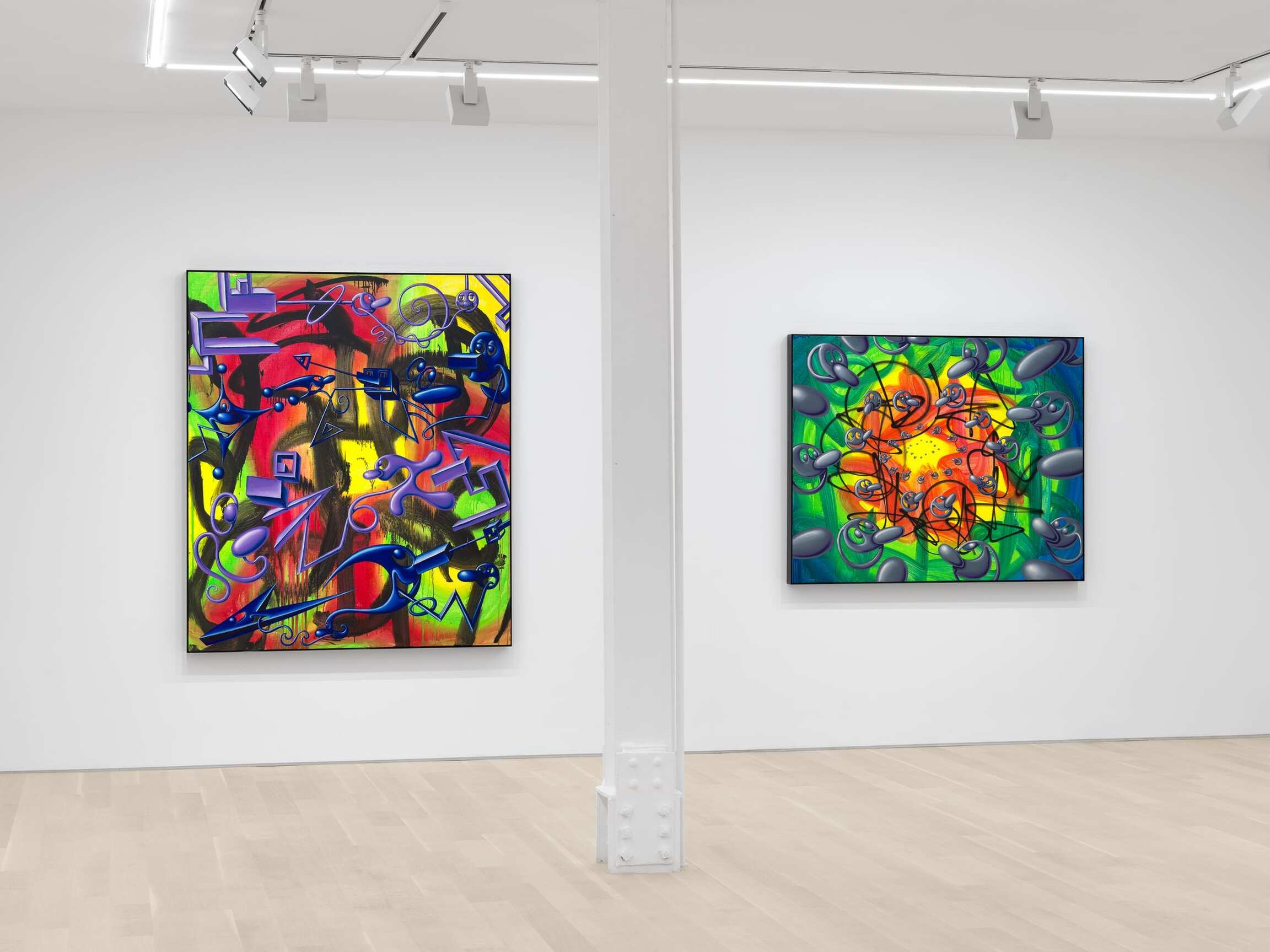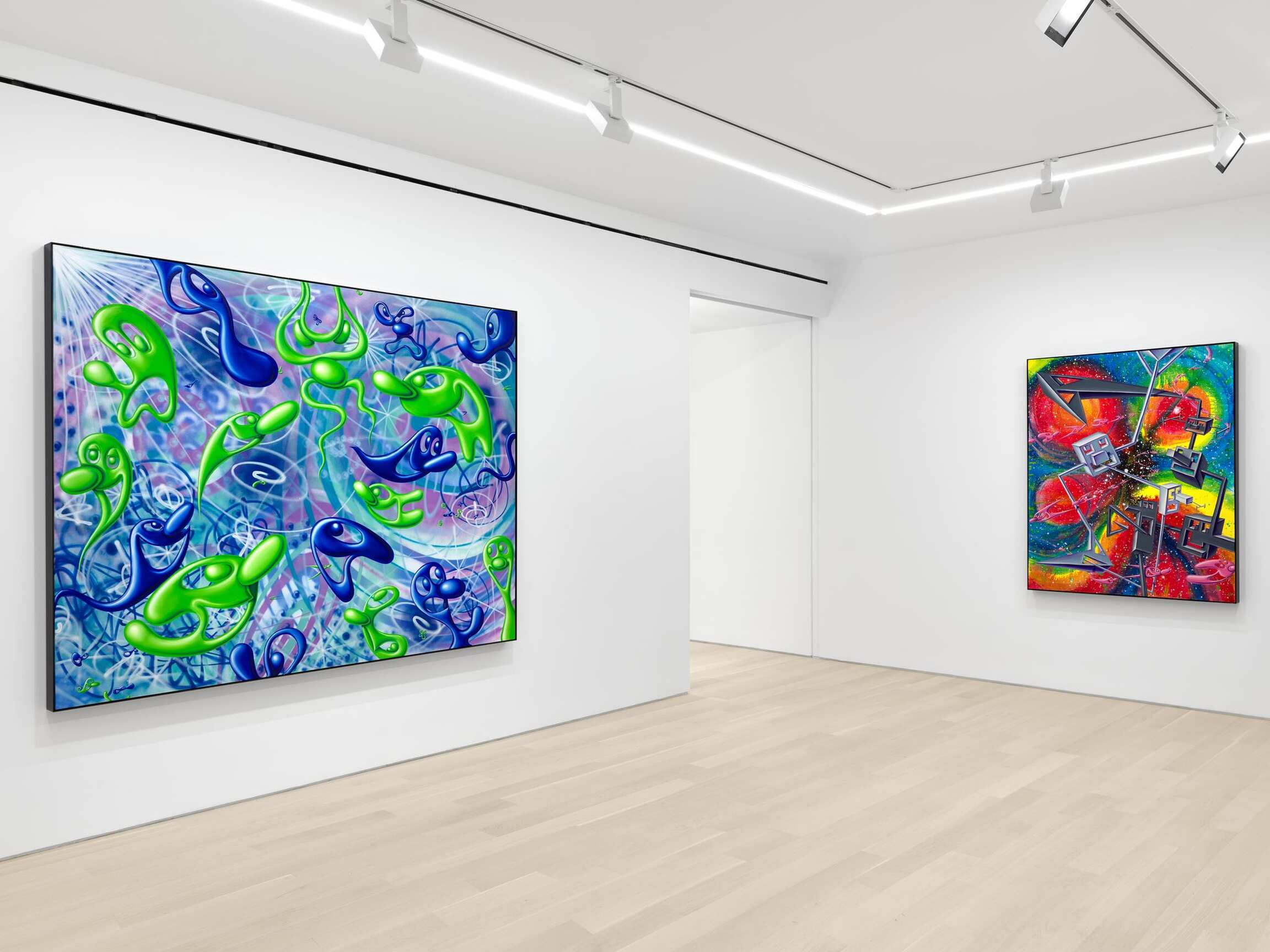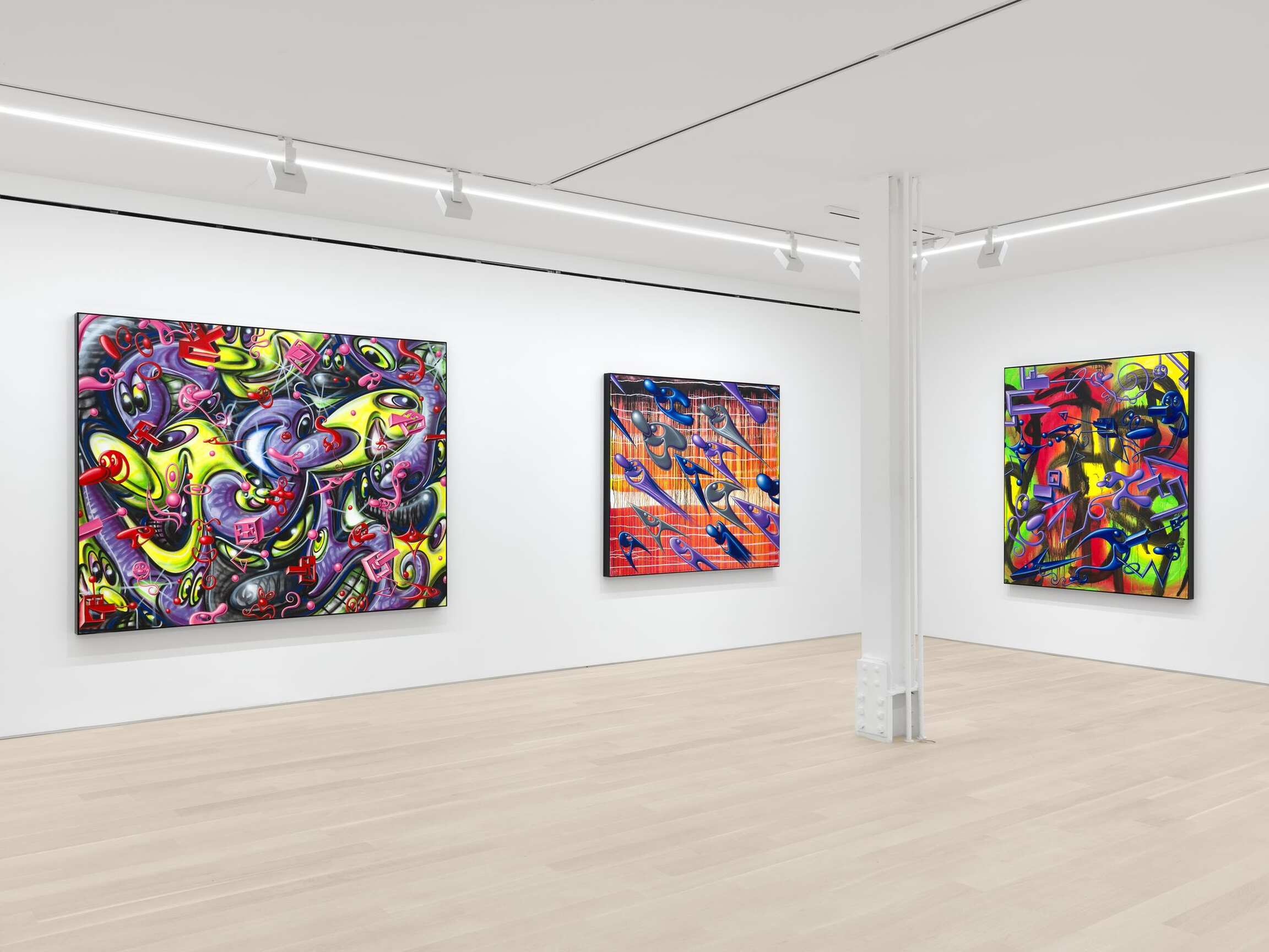 Scharf’s touchstones in those days were the Flintstones and the Jetsons, the cutesy animated sitcoms of past and future that he grew up watching on television and then emulating in paintings and live performances that put the two poles on a collision course that culminated in his artistic Big Bang, or Time Splat!, as he calls it, though he named it Pop Surrealism at the time, riffing on the precedent set by the unruly Chicago Imagists. The idea was not just to have a good time but to make time good. Then, as now, spontaneity remains the soul of his art. Where other artists of his generation cast a critical eye on the media, Scharf internalized it, and came up with a masked ball of humanity, a carnival of cackling, lascivious biomorphs rollicking around the fantasia of his these sprayed, brushed, dripped and spackled paintings with infectious abandon, leaving them only long enough to open our eyes.