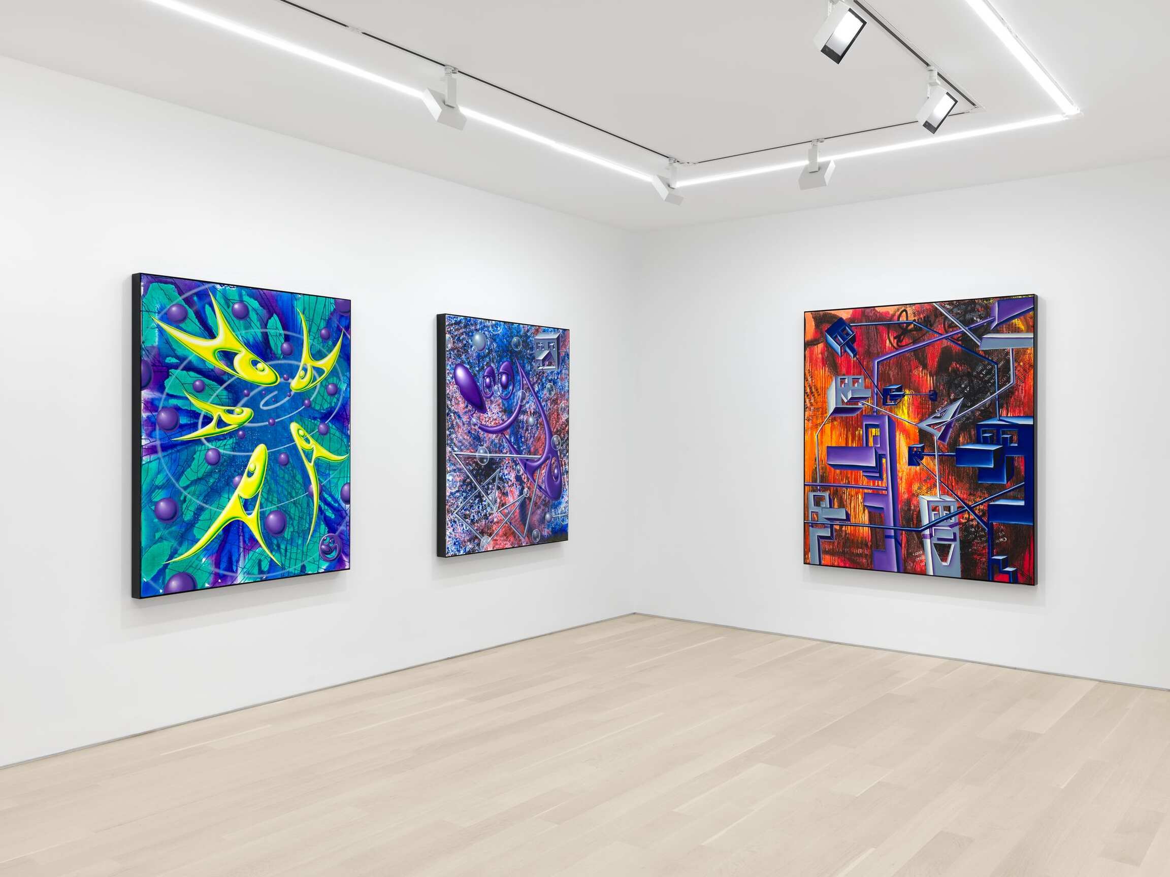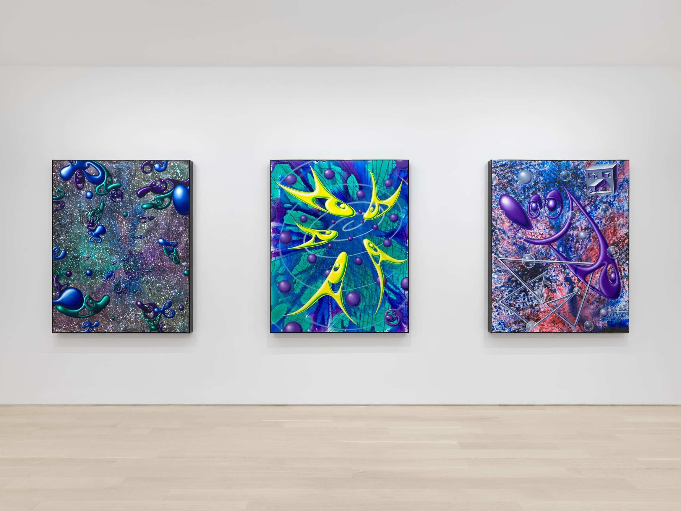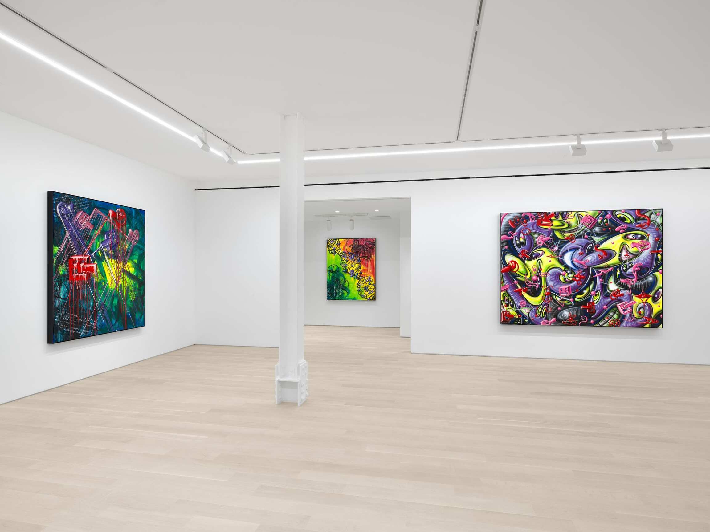 Scharf’s touchstones in those days were the Flintstones and the Jetsons, the cutesy animated sitcoms of past and future that he grew up watching on television and then emulating in paintings and live performances that put the two poles on a collision course that culminated in his artistic Big Bang, or Time Splat!, as he calls it, though he named it Pop Surrealism at the time, riffing on the precedent set by the unruly Chicago Imagists. The idea was not just to have a good time but to make time good. Then, as now, spontaneity remains the soul of his art. Where other artists of his generation cast a critical eye on the media, Scharf internalized it, and came up with a masked ball of humanity, a carnival of cackling, lascivious biomorphs rollicking around the fantasia of his these sprayed, brushed, dripped and spackled paintings with infectious abandon, leaving them only long enough to open our eyes.