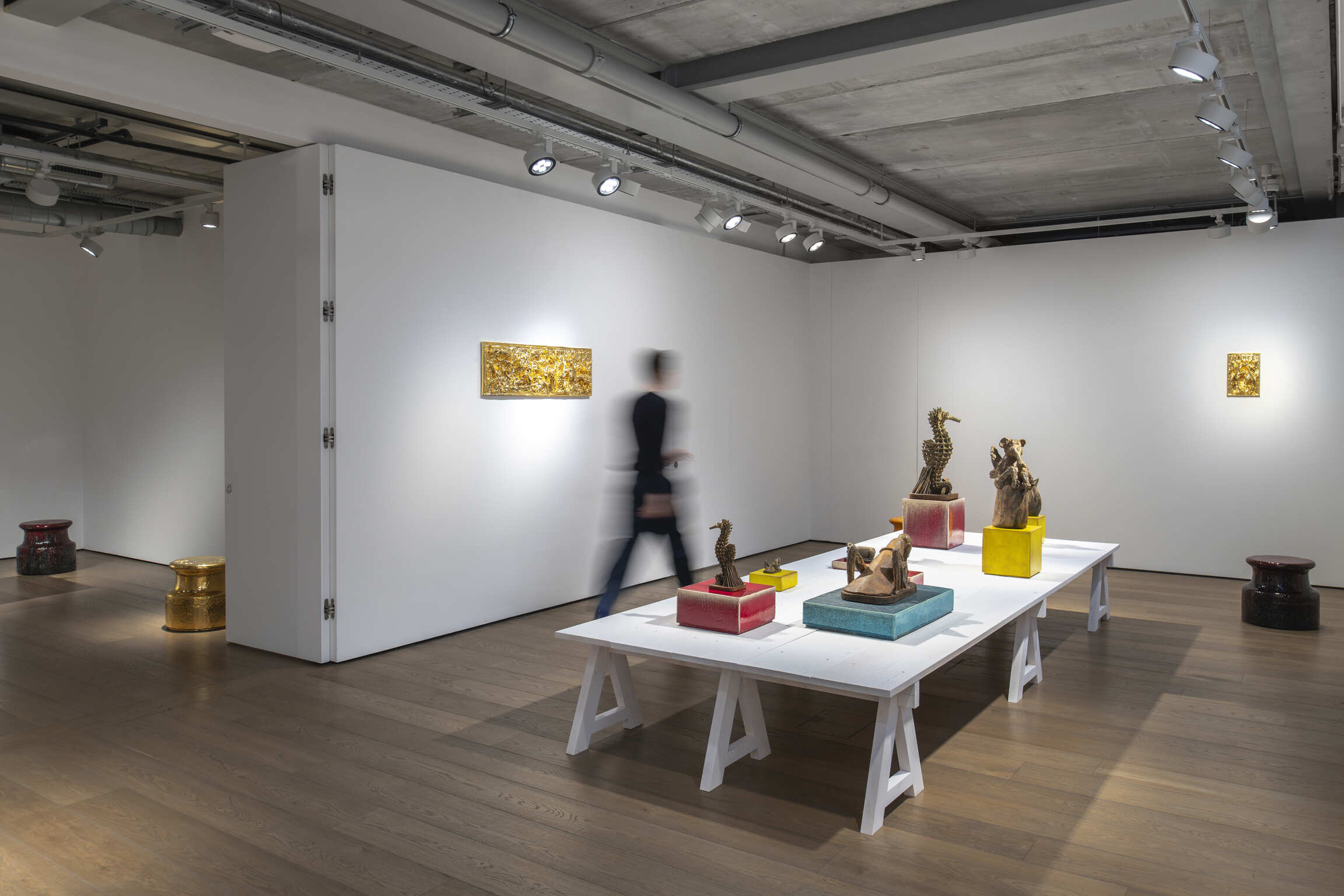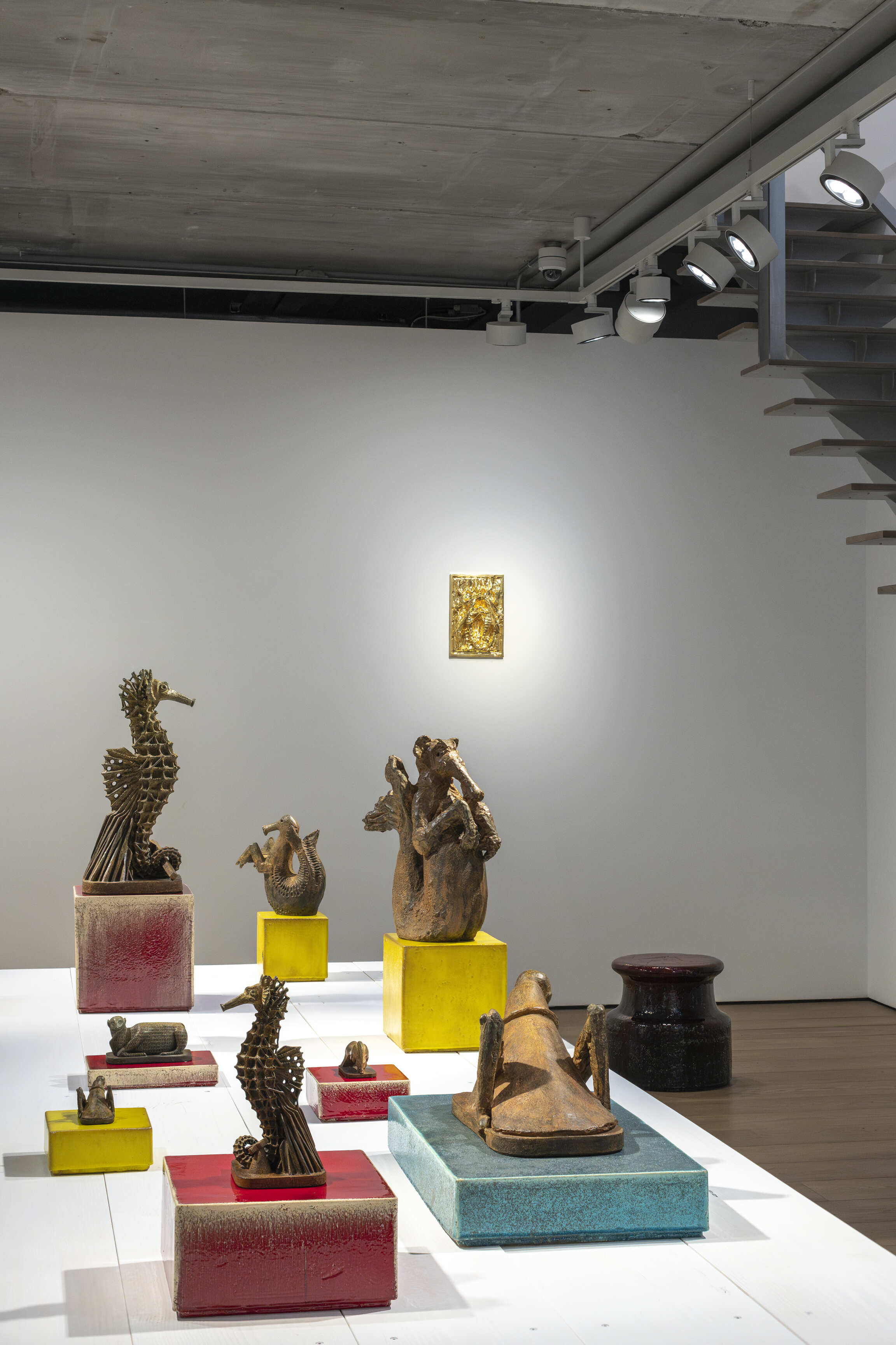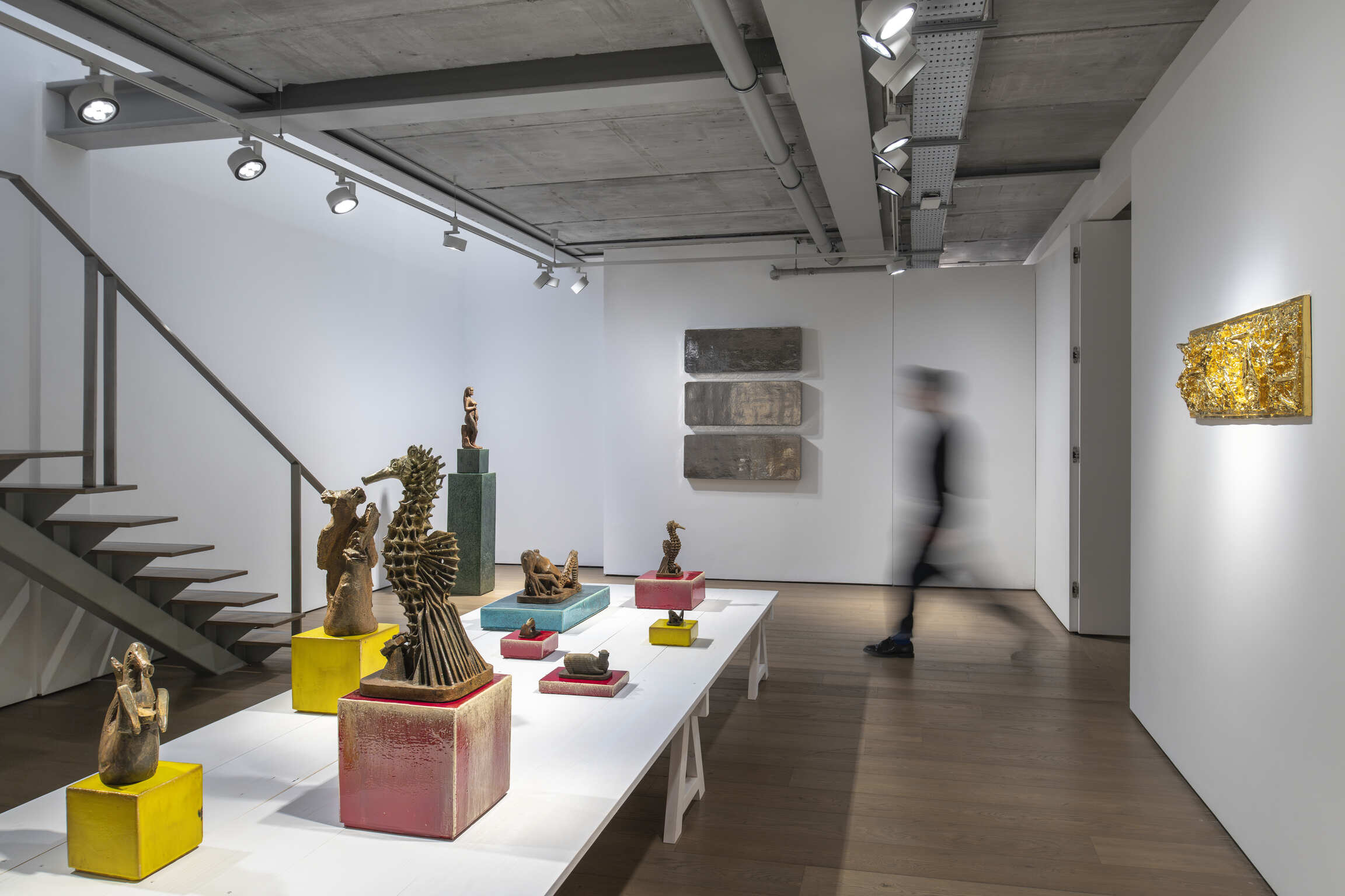 This London event follows on from the exhibition “How to explain sculptures to an Influencer?”, when the artworks were first shown. While adding a difference in patina, Johan Creten uses the stage principle of the Parisian installation: on a wooden platform, small bronzes shaped with lost-wax, based on the artist's “bestiary”, including Sauterelle, l’Hippocampe, Mouche morte, l’Hypocrite, and Mouton, as well as mythical figures such as Femme au hareng, are grouped together. A “mural décor” made up of the bas-reliefs La Rencontre and C’est dans ma nature, as well as Miroirs d’argent amplify the composition's narrative character. The panoramic view of the whole can be appreciated from the glazed stoneware plinth-sculptures, which he aptly entitled Points d’observation.