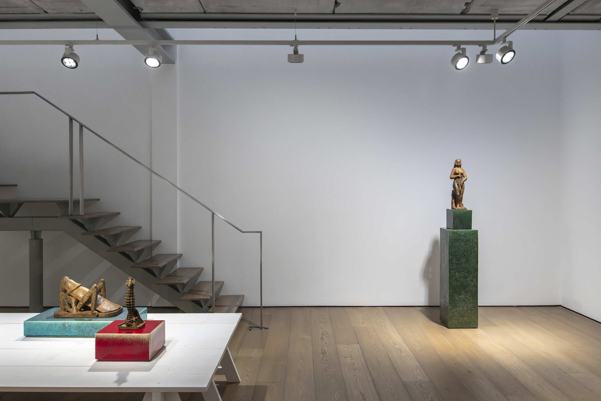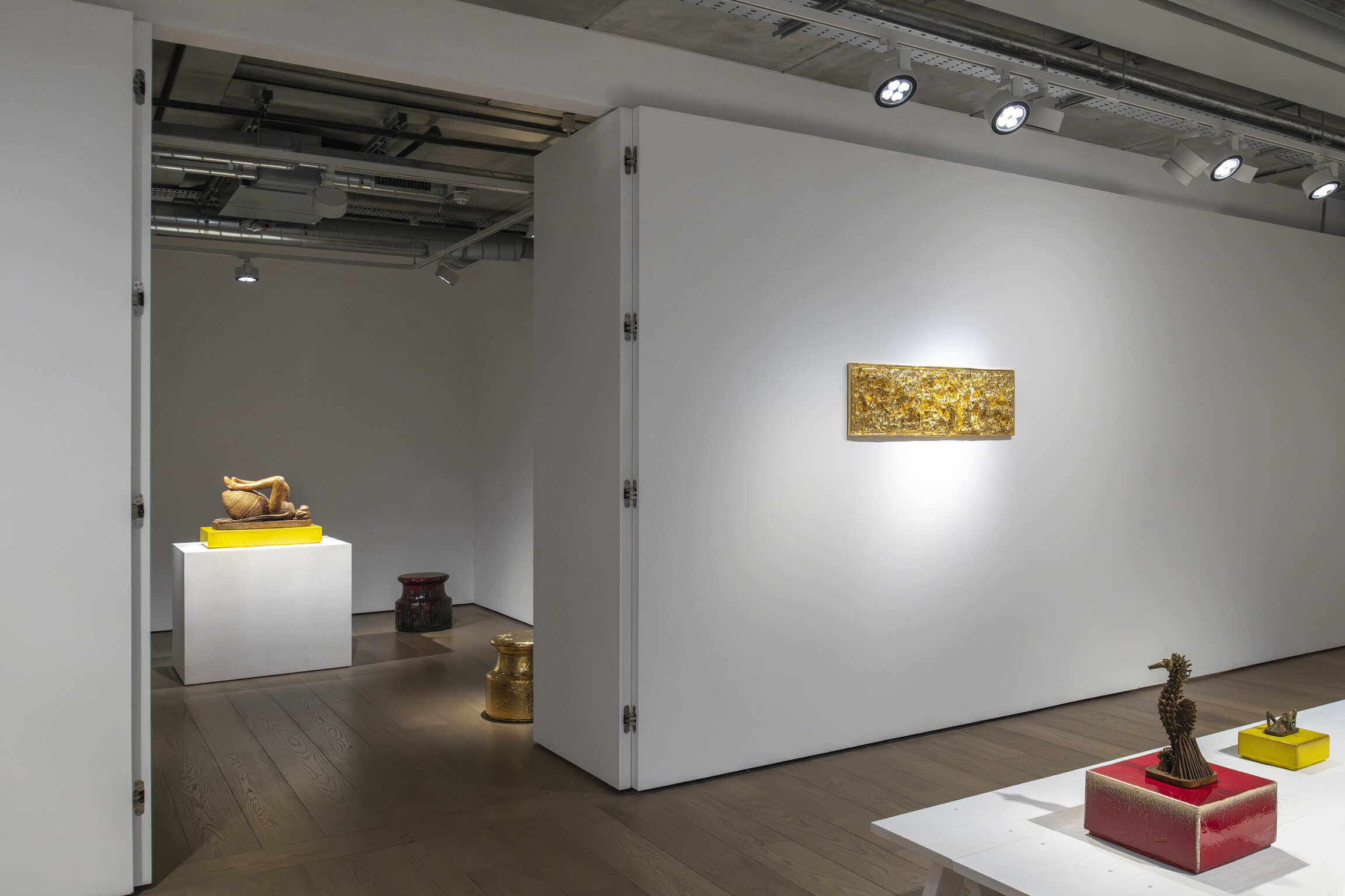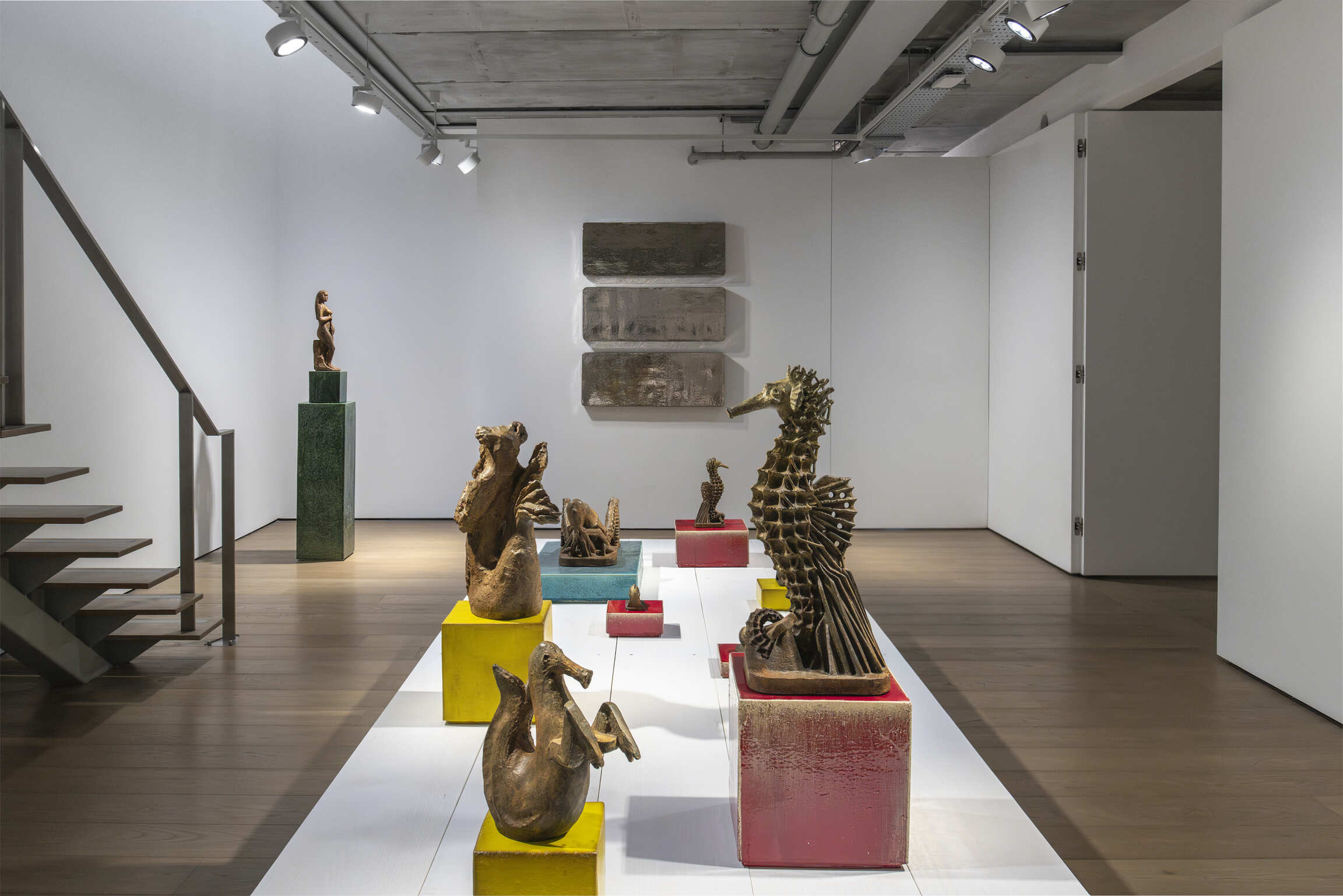 This London event follows on from the exhibition “How to explain sculptures to an Influencer?”, when the artworks were first shown. While adding a difference in patina, Johan Creten uses the stage principle of the Parisian installation: on a wooden platform, small bronzes shaped with lost-wax, based on the artist's “bestiary”, including Sauterelle, l’Hippocampe, Mouche morte, l’Hypocrite, and Mouton, as well as mythical figures such as Femme au hareng, are grouped together. A “mural décor” made up of the bas-reliefs La Rencontre and C’est dans ma nature, as well as Miroirs d’argent amplify the composition's narrative character. The panoramic view of the whole can be appreciated from the glazed stoneware plinth-sculptures, which he aptly entitled Points d’observation.