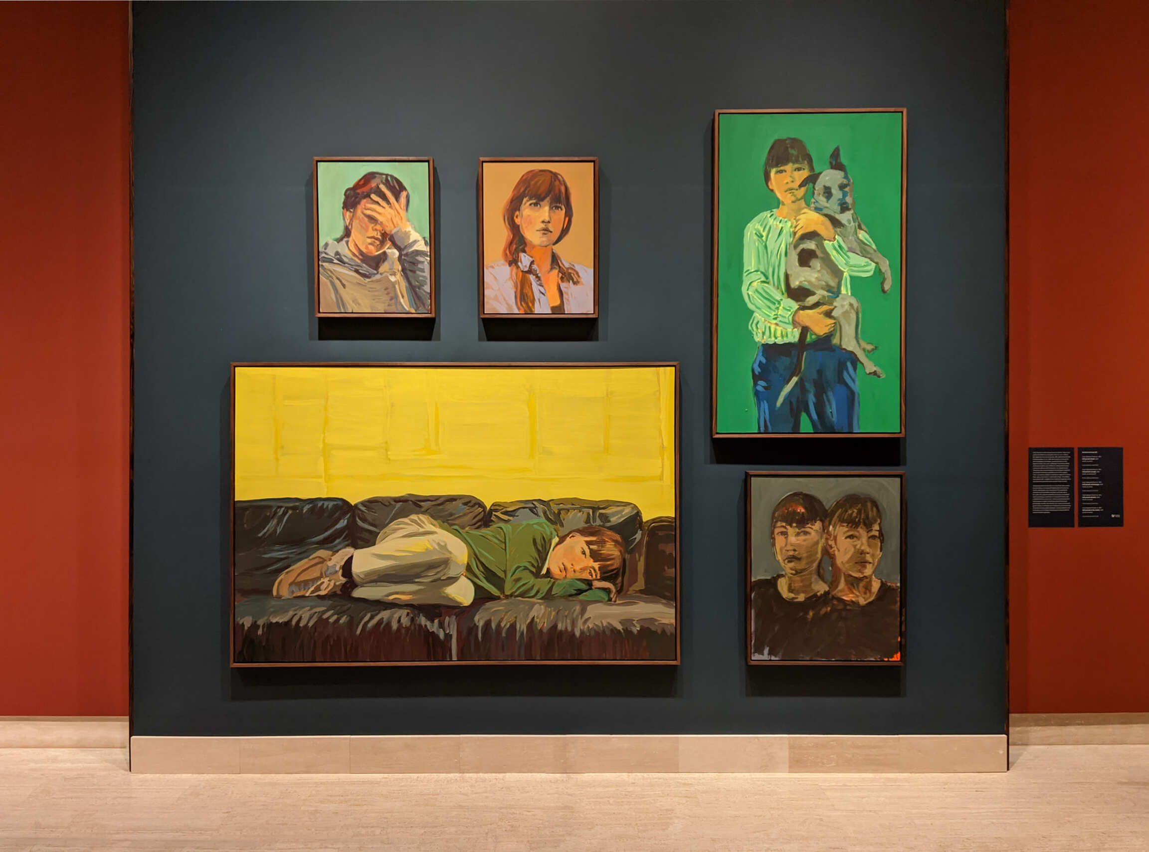 Self-portrait with George (green) reveals the tender relationship between the artist and her dog. With the subject holding the dog in her arms, the work conveys a sense of mutual caring and protection between the two.