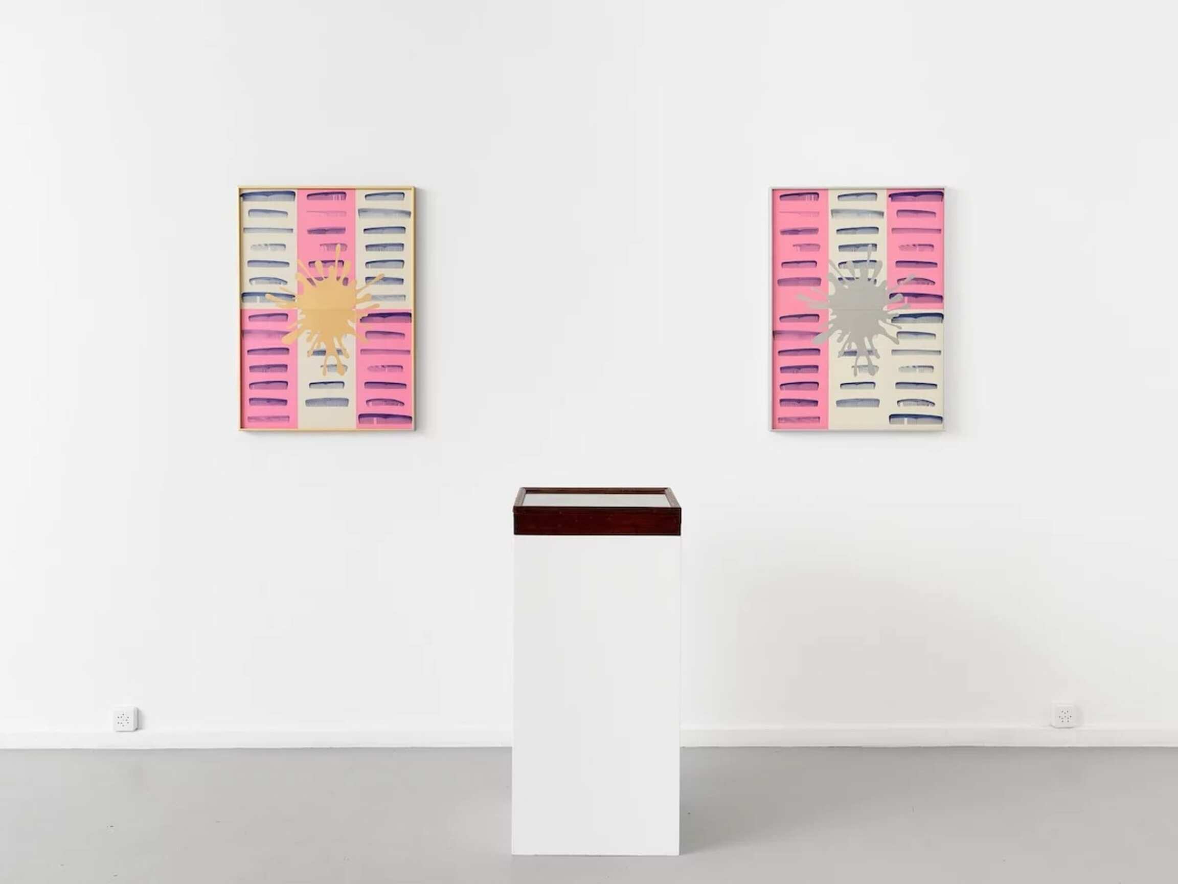 Indeed, everything changes and nothing changes. The monotypes exhibited today at the CEC recall the ones produced and exhibited in 1992 : monotypes, unique pieces, available in series, where everything is kept as is. In the series currently exhibited, Shady place for sunny people (2024), three large sheets display drips, and four others, almost fully white, are in reality protective sheets, marked with colored residual imprints from the pressure of a weighed system, which allowed the transfer of masses of ink on the first ones, and left the traces of their overflows on the second ones. These simple stains also echo the « splashes », recurring stylized motifs in Armleder’s work, here screenprinted, gold or silver, on two sets of paper sheets, pink or yellow, mounted on cardboard, recovered from an edition produced in 1979, a leporello, Lézards Sauvages IIa/ « égouttés ». Each leaflet used to display a printed reproduction of a comb, whole or broken, found on the streets of Geneva. This harvest offered Armleder the casualness of a stroll and the recovery of a pre-existing object : a performance which lasted the time of his journeys, and a ready-made form, an abstract, random and unselective grid, which made the series possible.