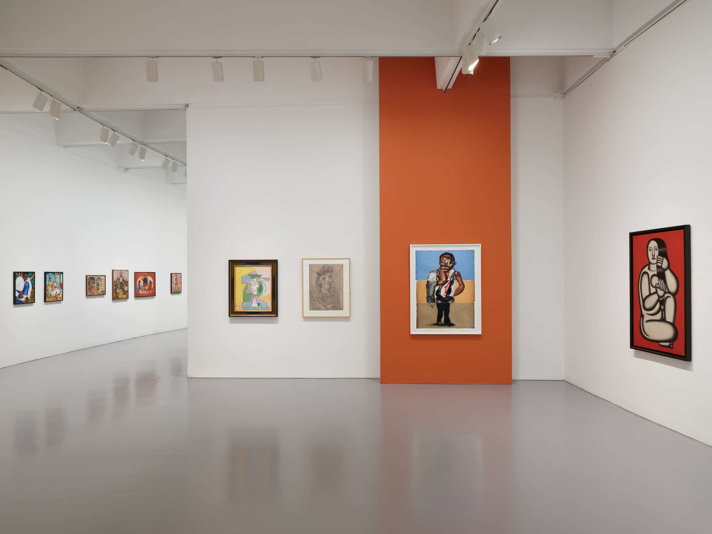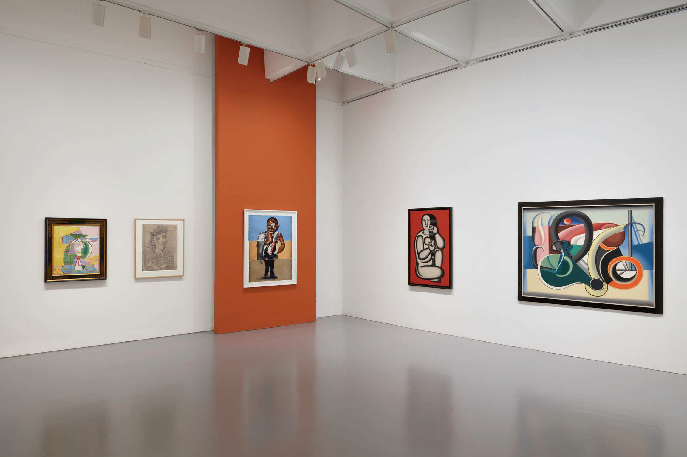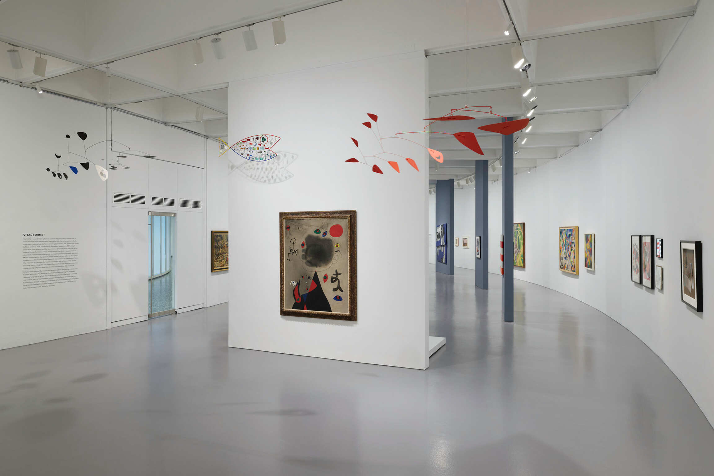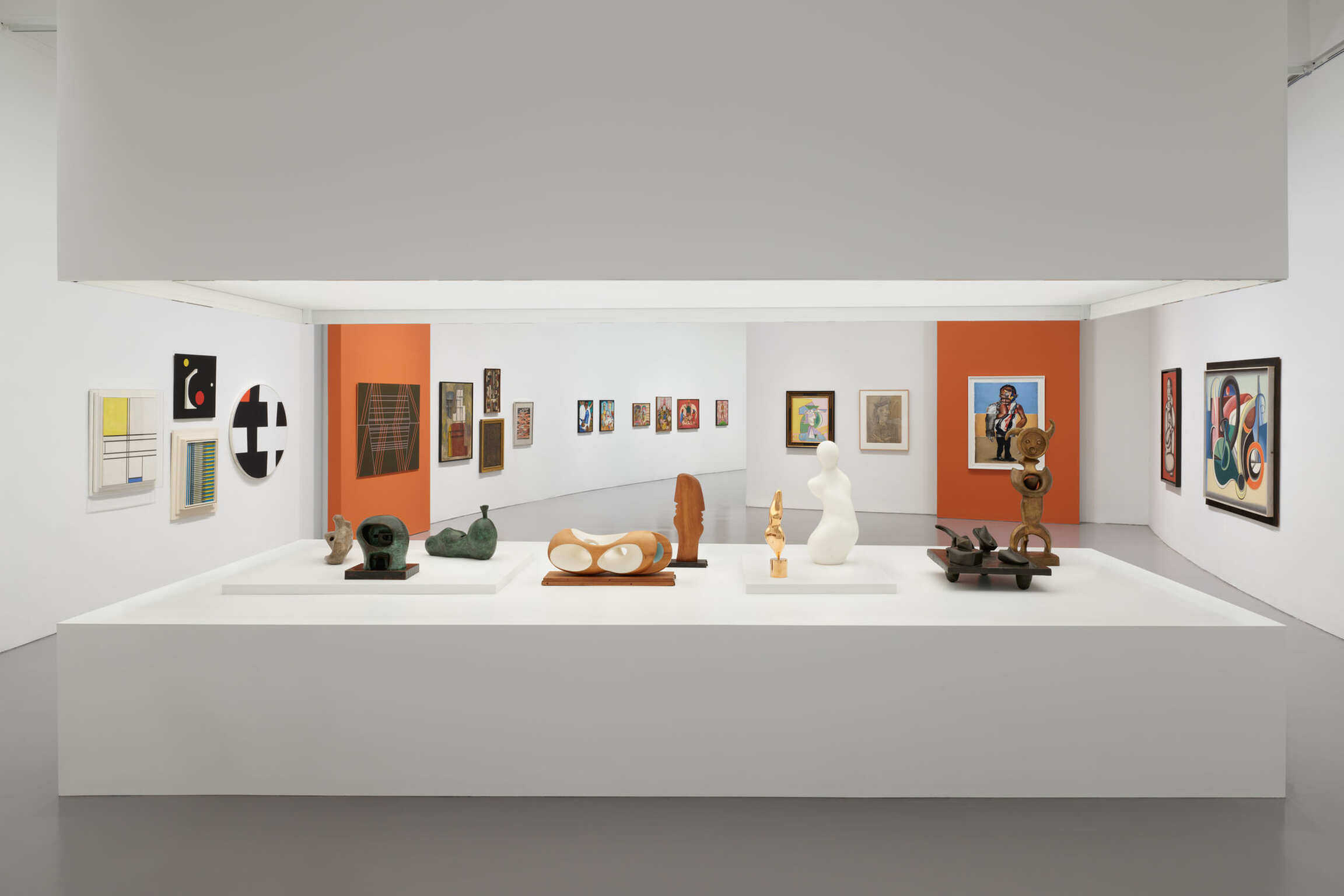 In subsequent galleries, sections such as “Abstraction and Construction” and “Vital Forms” are devoted to work by Futurists, including four sculptures by Giacomo Balla, as well as to Cubist works by artists including Pablo Picasso, Fernand Léger and Yun Gee. Artistic responses to the ferocity of World War I’s nationalism and modern warfare are highlighted by Marsden Hartley’s “Painting No. 47, Berlin” (1914–1915) and Childe Hassam’s “The Union Jack, New York, April Morning” (1918). The installation also acknowledges how World War II tore communities apart, exiling significant artists such as Marcel Duchamp, Hans Hofmann, Lam and Piet Mondrian while accelerating the exchange of ideas between the likes of Barbara Hepworth and Henry Moore.