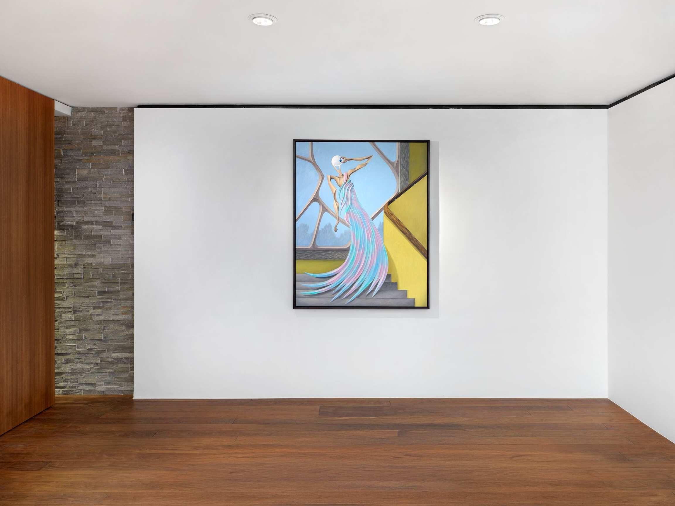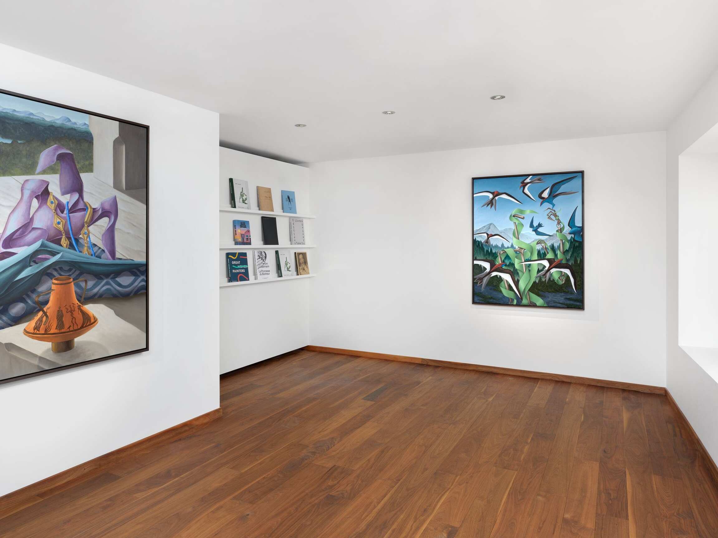 The artist’s paintings often play with perspective to highlight that we are engaging with a three-dimensional image on a flat plane. In some cases, in his work he plays with the diagonal view, axonometric perspective used in architectural renderings. At these moments that edge away from traditional perspective the works feel more abstract and unreal.