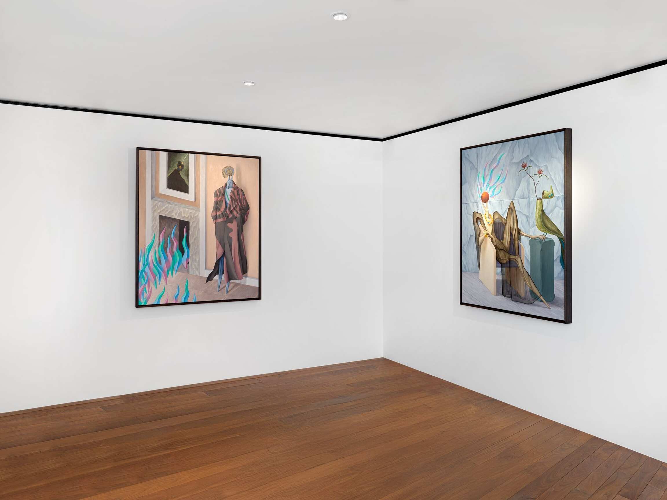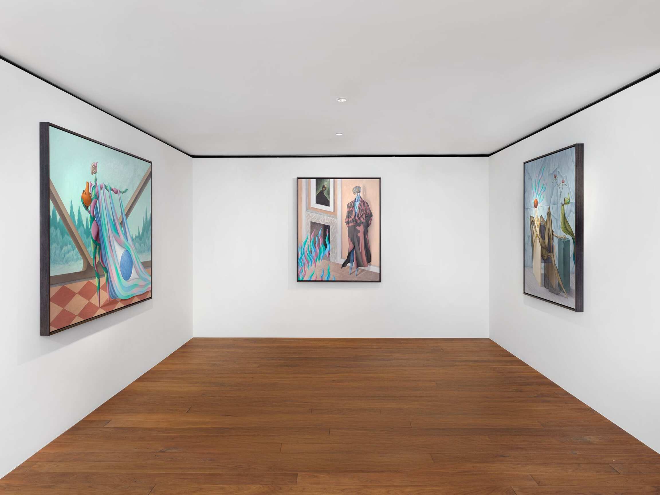 His exhibition 'OLYMPIA' brings together a suite of artworks that questions the role of painting in the context of accelerated image culture. The artist draws from the mutable nature of mythology, though in a very loose way, instead, we see an unfolding set of narrative works where unreal characters engage and play with fire in their pictorial landscape.
