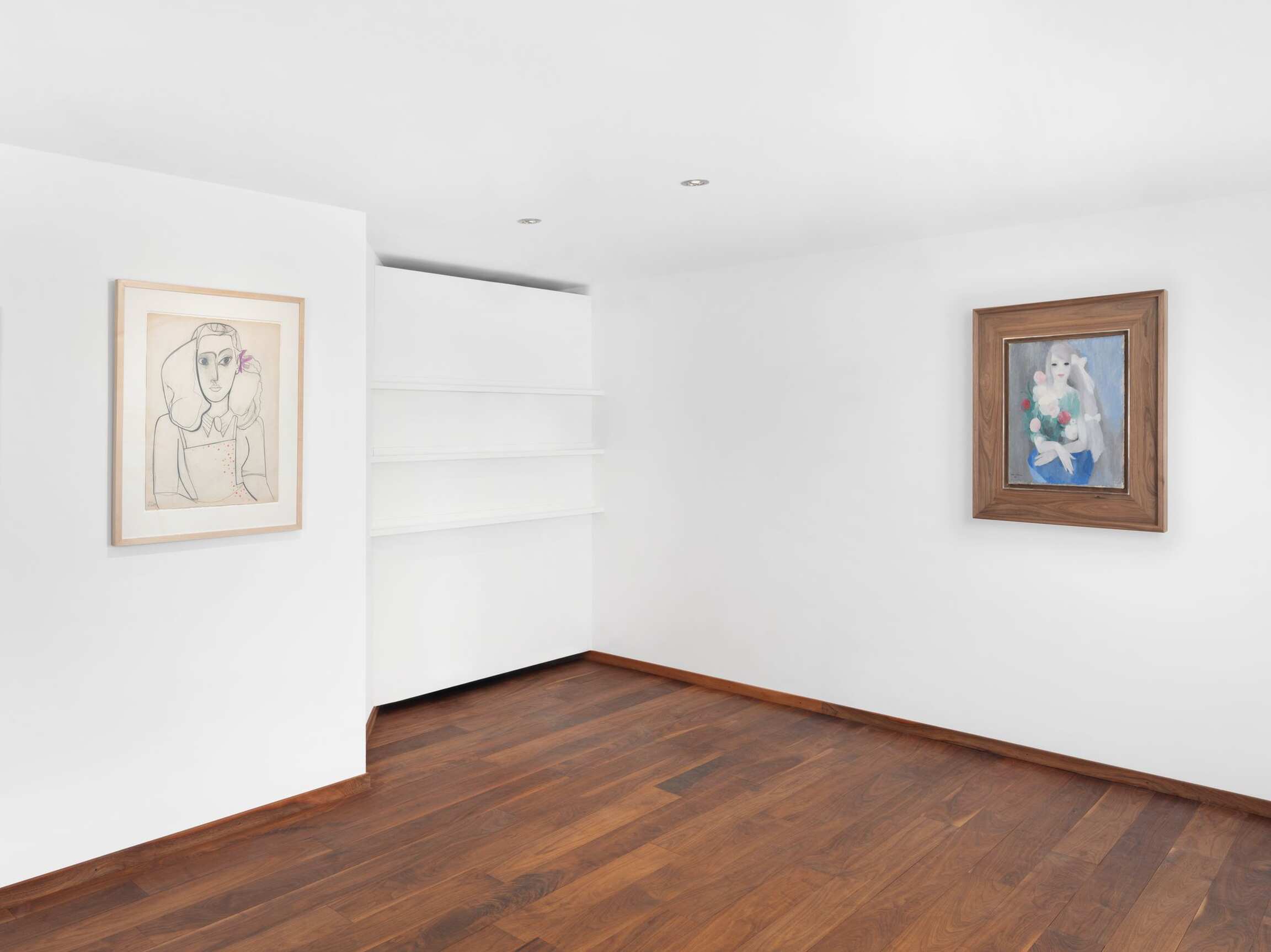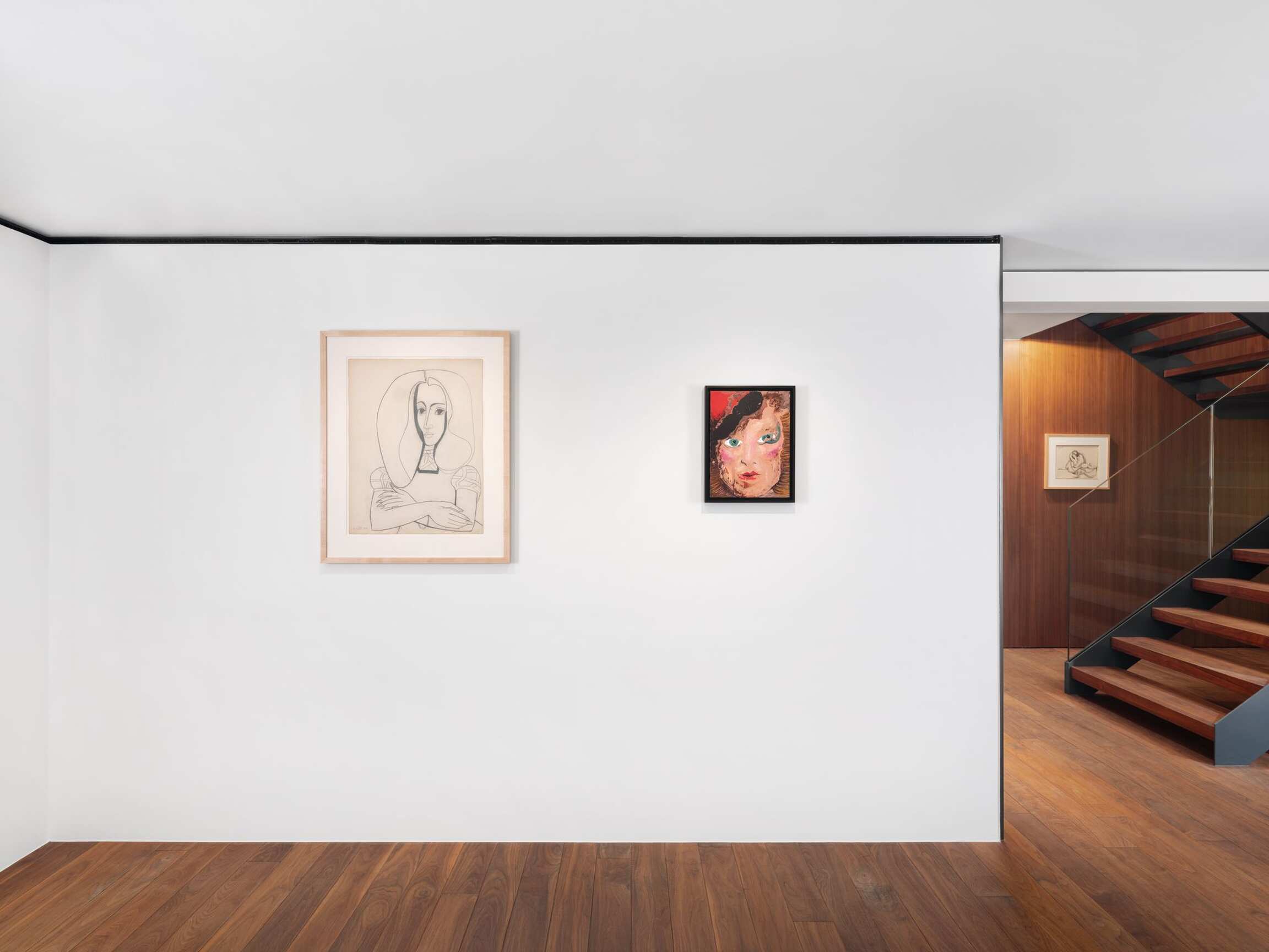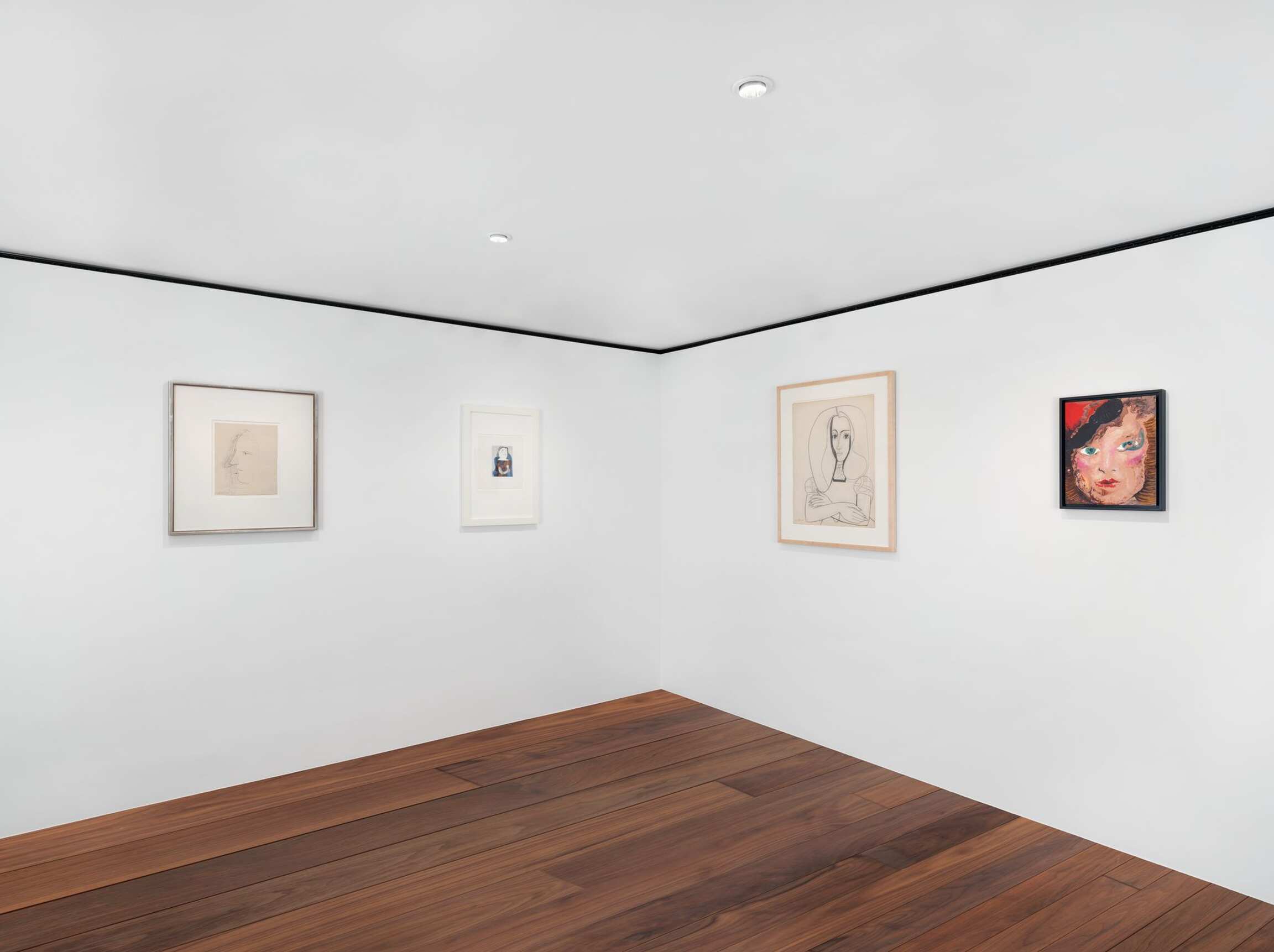 This show is the second chapter of ‘Visages’, following a show held at Almine Rech New York, Upper East Side in November 2024. This particular assembly of varied portraits is anchored by works by two canonical titans of twentieth-century art, Picasso and Warhol, who, each in their own way, broke faces down to a flat distillation of component parts in order to depart from a narrow view of the real and play with distortion, disfiguration, becoming-image, perspective, and transfiguration, as in Warhol’s two black-and-white photographs Self-portrait in drag (1981) or Picasso’s Portrait de Jacqueline (1956). Direct relations lead from Picasso to Françoise Gilot’s portraits of Iris I, II, and III (1949). Richard Prince’s two collages from 2011 genuflect rather directly to the Spaniard. Familiar, if sidelined historical figures like Marie Laurencin are crucial intergenerational bridges contributing continuity to the story ‘Visages’ tells. Laurencin’s Sonia (1923) is a dream angel of youthful feminine beauty with bows in her long hair, a bouquet of heavy blooms close to her chest, long, elegant fingers, and that distinctive pale visage marked sparely by huge dark almond eyes and closed dusty-rose lips that tether her timeless vibe to a past century, an ethereal waifish timelessness dreamt a hundred years ago.