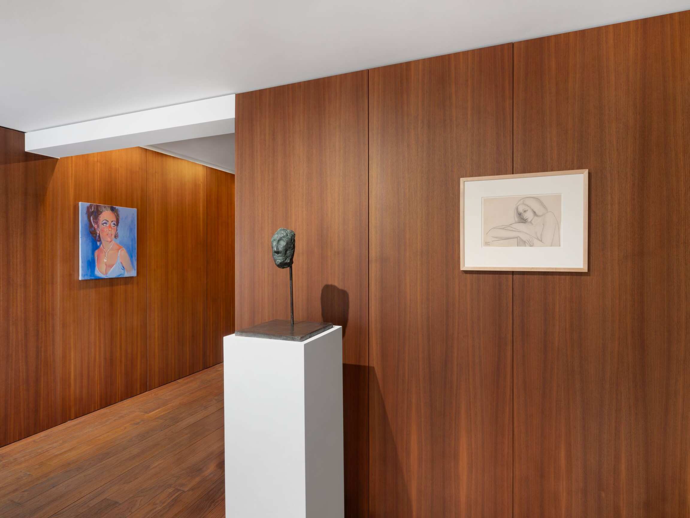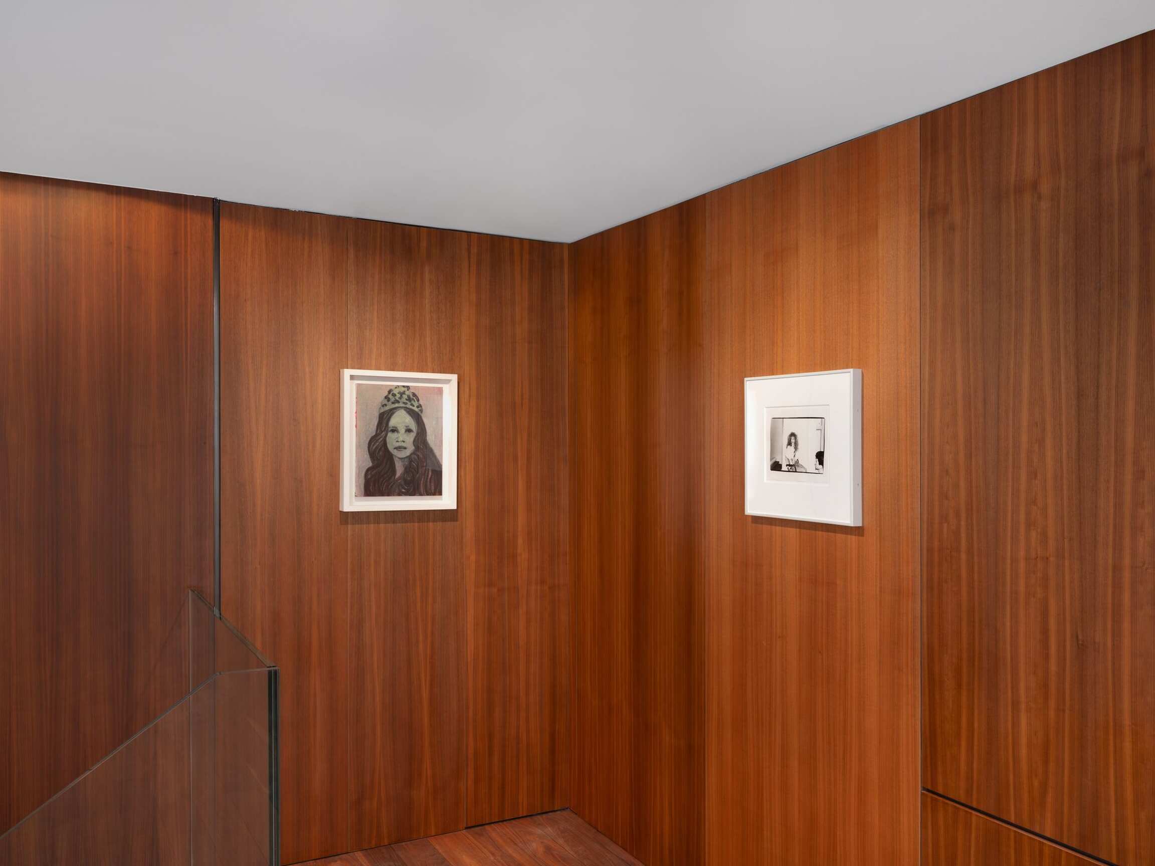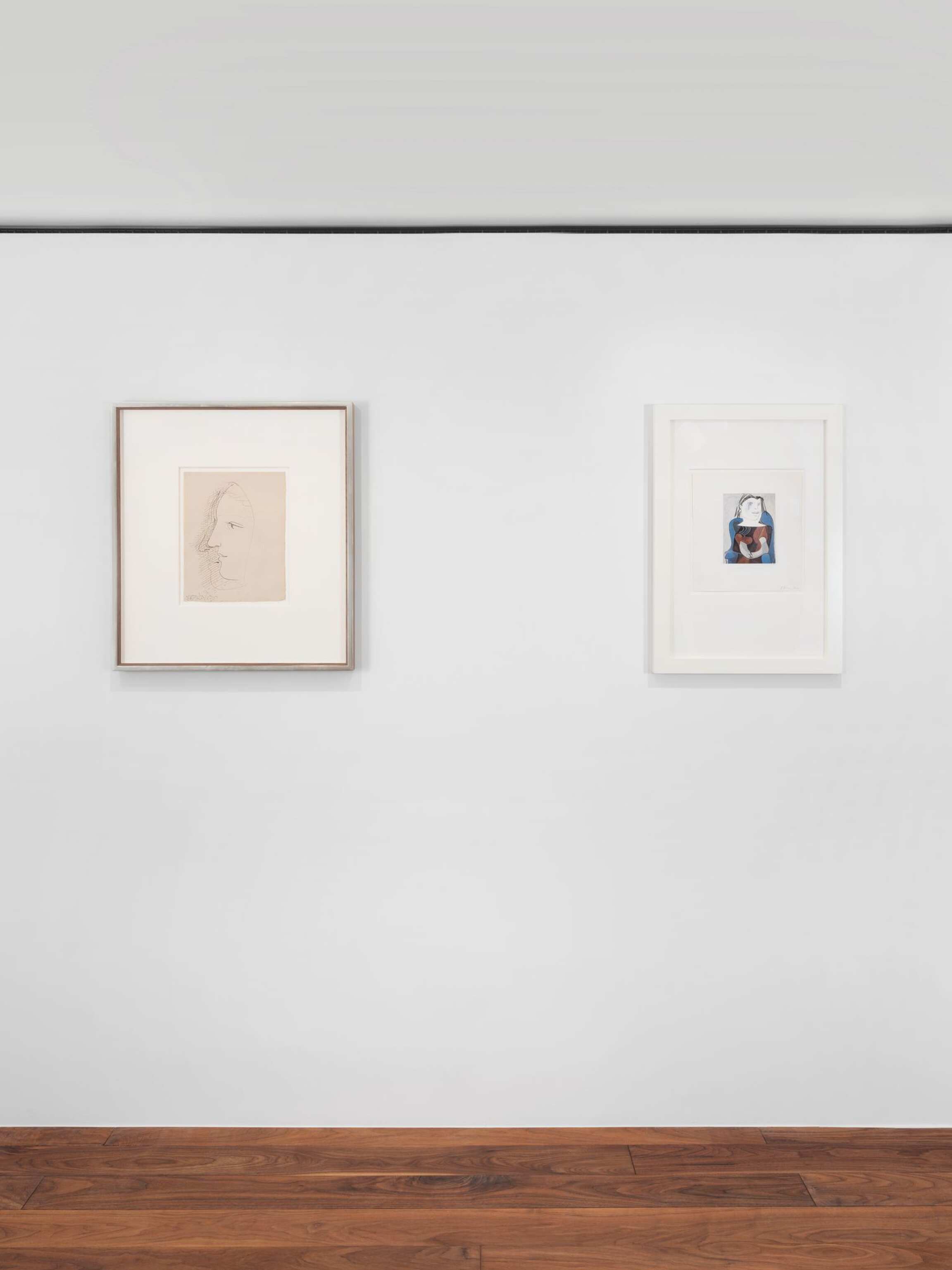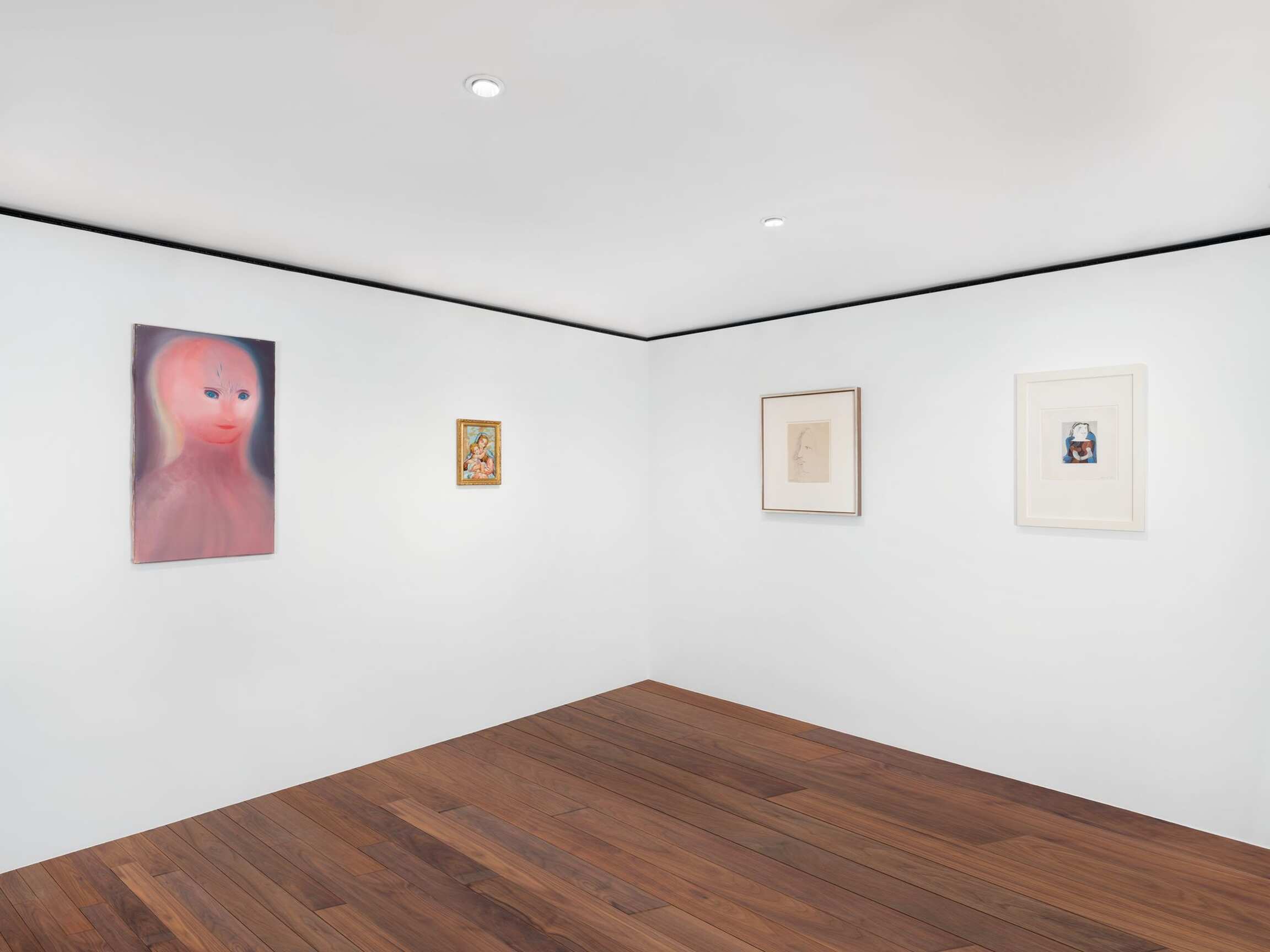 This show is the second chapter of ‘Visages’, following a show held at Almine Rech New York, Upper East Side in November 2024. This particular assembly of varied portraits is anchored by works by two canonical titans of twentieth-century art, Picasso and Warhol, who, each in their own way, broke faces down to a flat distillation of component parts in order to depart from a narrow view of the real and play with distortion, disfiguration, becoming-image, perspective, and transfiguration, as in Warhol’s two black-and-white photographs Self-portrait in drag (1981) or Picasso’s Portrait de Jacqueline (1956). Direct relations lead from Picasso to Françoise Gilot’s portraits of Iris I, II, and III (1949). Richard Prince’s two collages from 2011 genuflect rather directly to the Spaniard. Familiar, if sidelined historical figures like Marie Laurencin are crucial intergenerational bridges contributing continuity to the story ‘Visages’ tells. Laurencin’s Sonia (1923) is a dream angel of youthful feminine beauty with bows in her long hair, a bouquet of heavy blooms close to her chest, long, elegant fingers, and that distinctive pale visage marked sparely by huge dark almond eyes and closed dusty-rose lips that tether her timeless vibe to a past century, an ethereal waifish timelessness dreamt a hundred years ago.