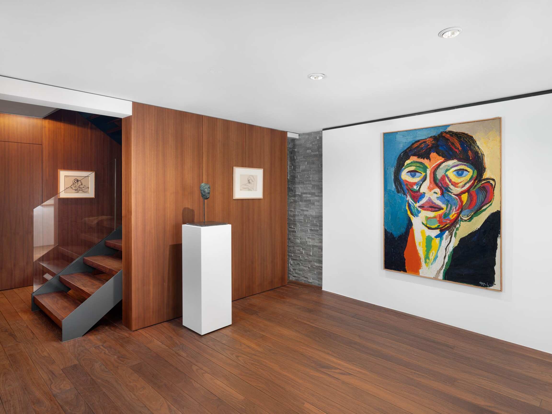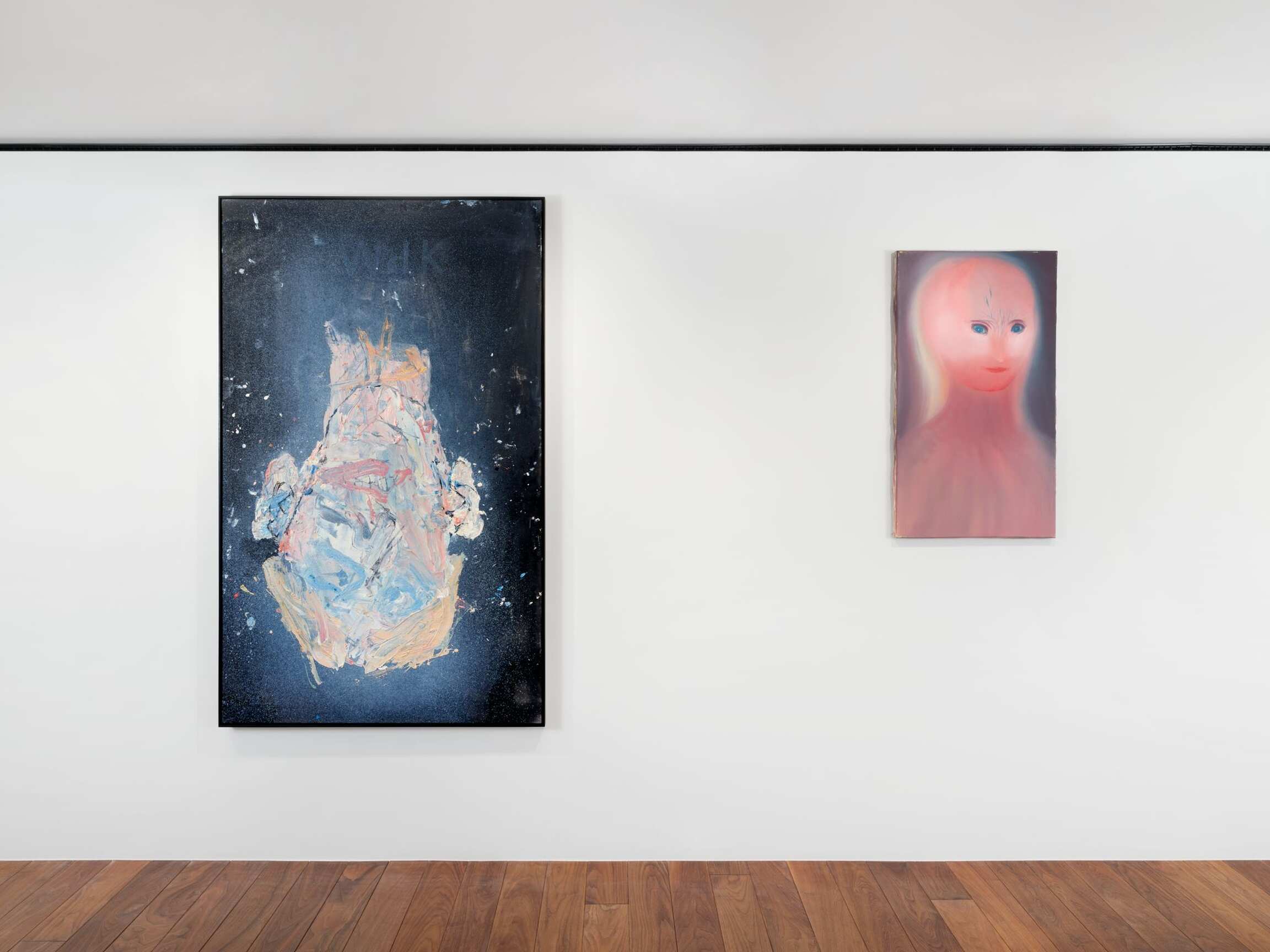 The cast of characters in the show’s story expands with recent and contemporary legends like Georg Baselitz, Günther Förg, Karel Appel, Miriam Cahn and Kenny Scharf. And then again further with new veteran virtuosos like Genieve Figgis and Francesco Vezzoli. For Willem de K. (2018), Baselitz applies all the visceral energy and abstract materiality for which his upside-down figuration is known to a decapitated portrait of the modern Dutch master. Cahn conjures unsettling, ghostly characters with novelistic richness and psychic baggage. Figgis paints figures born at the crossroads of Grey Gardens and Versailles, with lush facial expressions melting eerily into chromatic swirling puddles. Förg’s Untitled (Mask) (1990) bronze heads have been through the fire, permanently forged out of an elemental weight slumped all around their sunken eye sockets. Vezzoli’s ABSTRACT LEONARDESQUE MADONNA WITH CHILD (2024) is representative of his ongoing series that affixes tear-shaped pendants and ornaments to reproductions of Old Master works, layering lachrymose expressions of pain, suffering, and joy atop the otherwise distant face of history. Claire Tabouret and Nina Childress paint retro-ish, youthful characters in their own loose, chic manners, perennially handsome and full of cinematic allure, as if stylized along the lines of illustrations in a vintage manual.