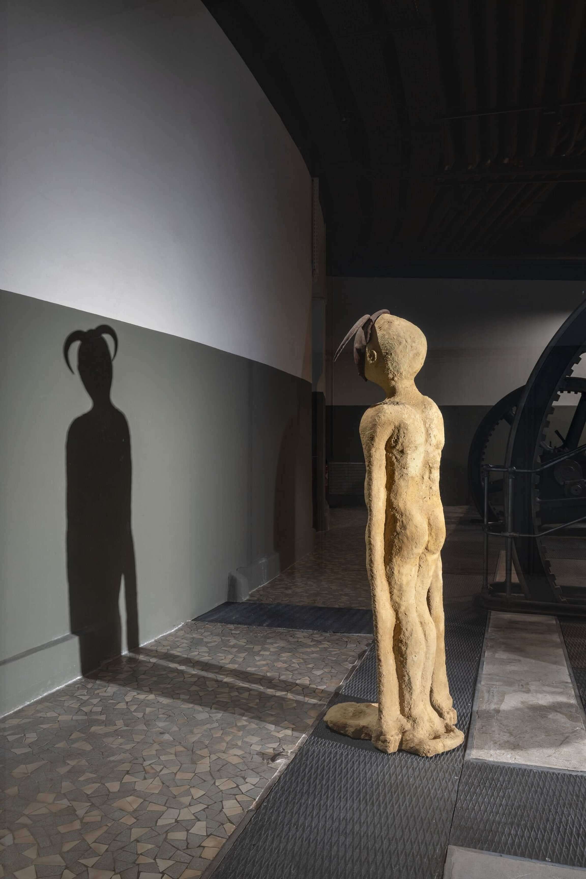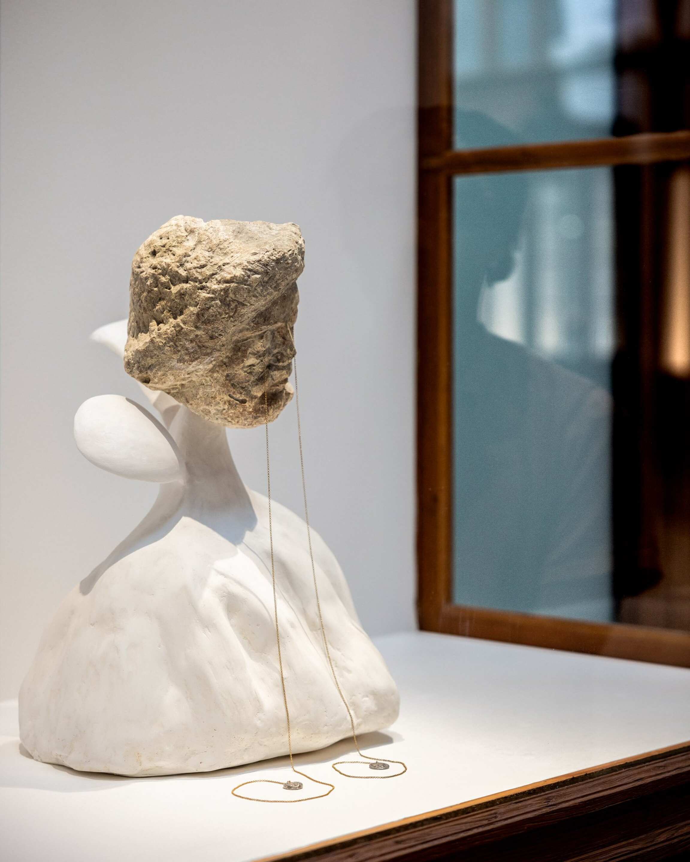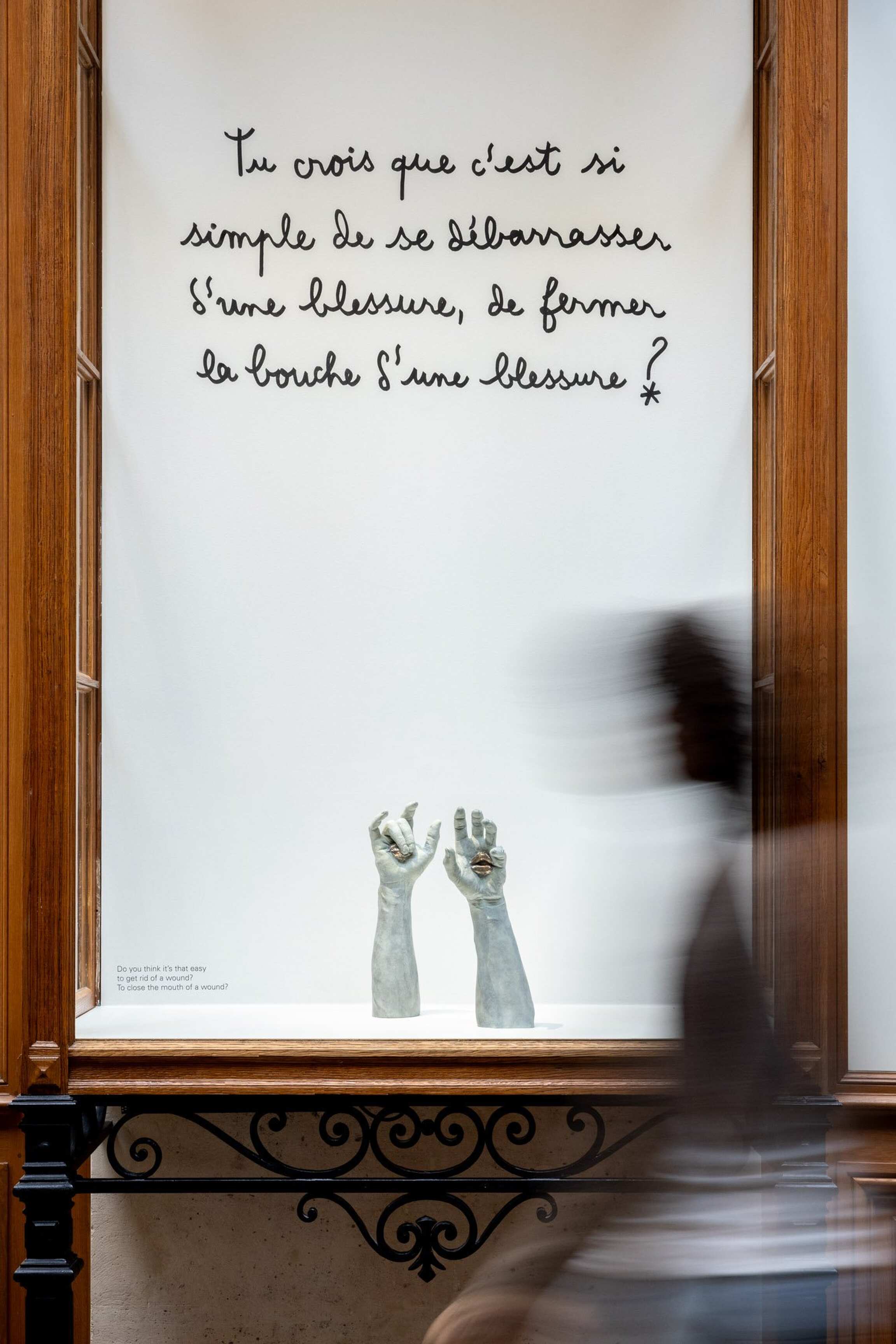 « Le Passage de la Bourse de Commerce accueille les œuvres d’Ali Cherri, artiste libanais installé en France. Dans sa jeunesse, ce dernier est marqué par la guerre civile au Liban, et notamment par les spoliations, vols et trafics d’œuvres d’art que les guerres engendrent. Investissant les vingt-quatre vitrines, dispositif muséal par excellence pour présenter des objets, son œuvre s’inspire également du cinéma et de ses vingt-quatre images par seconde: ses sculptures sont pensées comme des flashes fantomatiques qui s’inscrivent dans un espace liminal entre la vie et la mort, entre le passé et le présent, et qui invitent à réfléchir aux manipulations séculaires d’artefacts culturels. » Emma Lavigne.