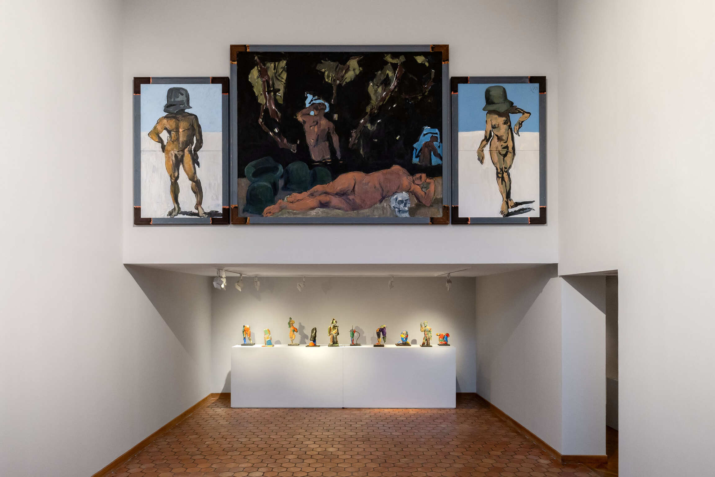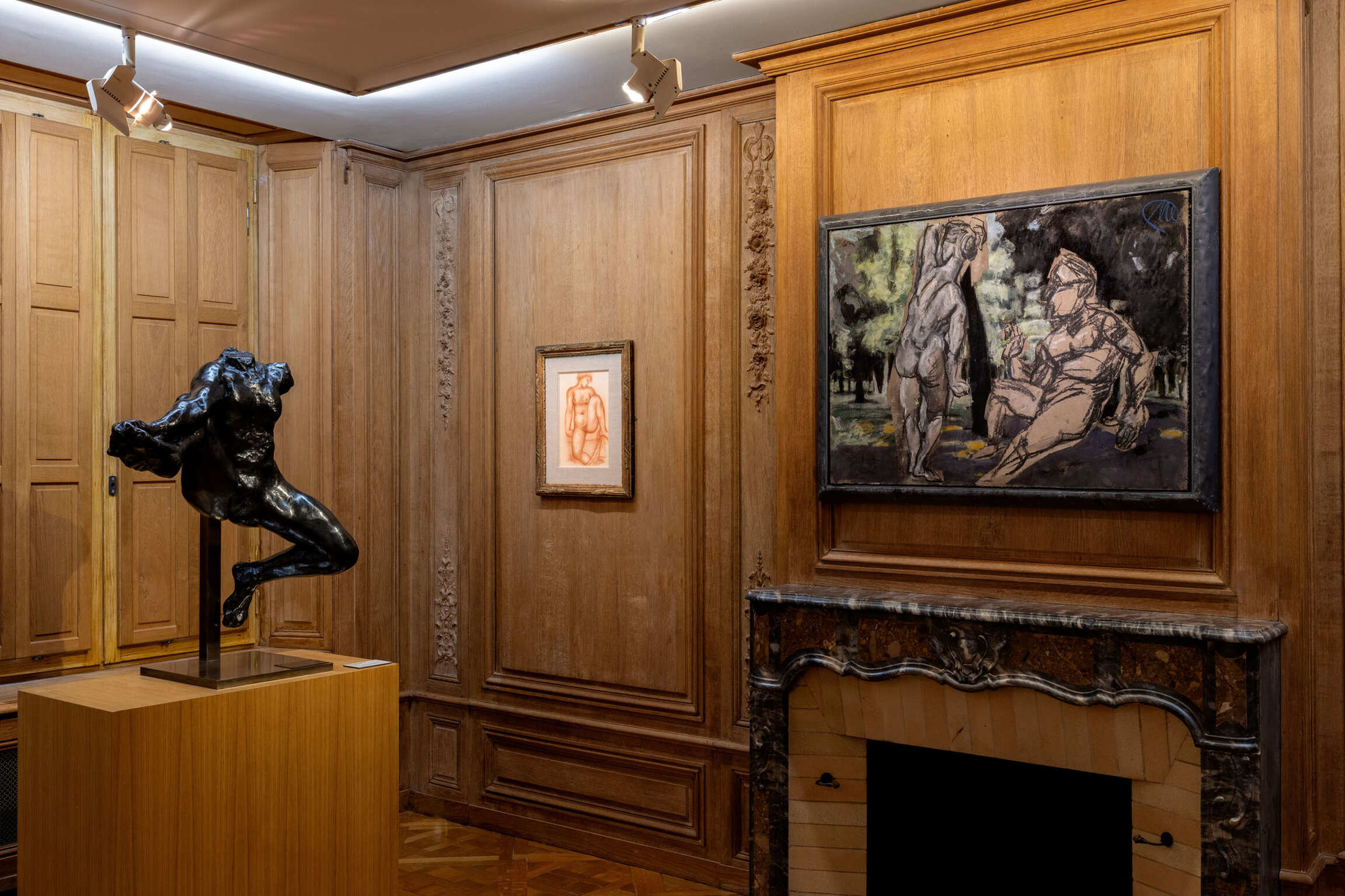 What then of the invention of this hybrid being, the fruit of a pause in time perhaps, or of a resurrection, that would be Markus Maillol? The current practice is often one of comparatism, in the perspective of a ‘global’ art narrated by the exhibition; it is coupled with frequent recourse to a system of association, of pairing two artists, whether they have actually confronted each other in their contemporaneity, or whether the exhibition constructs this confrontation. The Markus Maillol exhibition is about something other than ‘Maillol AND Lüpertz’. Markus Maillol is an invention of identity, borne by the artist himself, as evidenced by a signature on a painting by Lüpertz. It signals a link, without there being any substitution by taking over the old, or any return to notions of imitation, influence or inspiration. The MM of their respective signatures point in the same direction, beyond the Maillol Lüpertz that Lüpertz used. So there is something at play here for Lüpertz, which should not be confused with ‘after Maillol’, a modality that Lüpertz practised for a number of ‘old masters’: let's mention a few names, Poussin, Goya, Hans von Marées, Corot, Puvis de Chavanne, but also de Kooning, Picasso, Matisse and others.