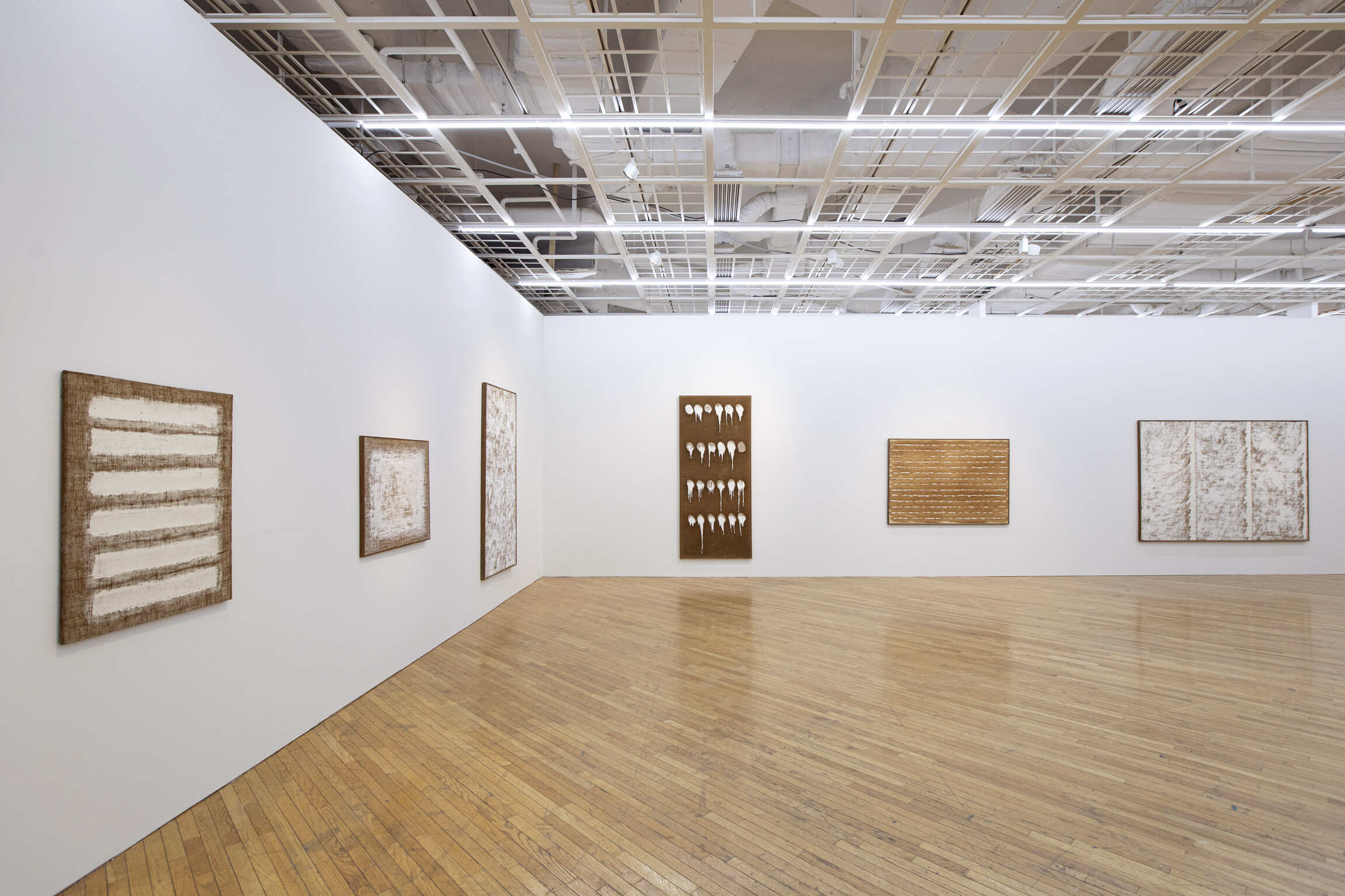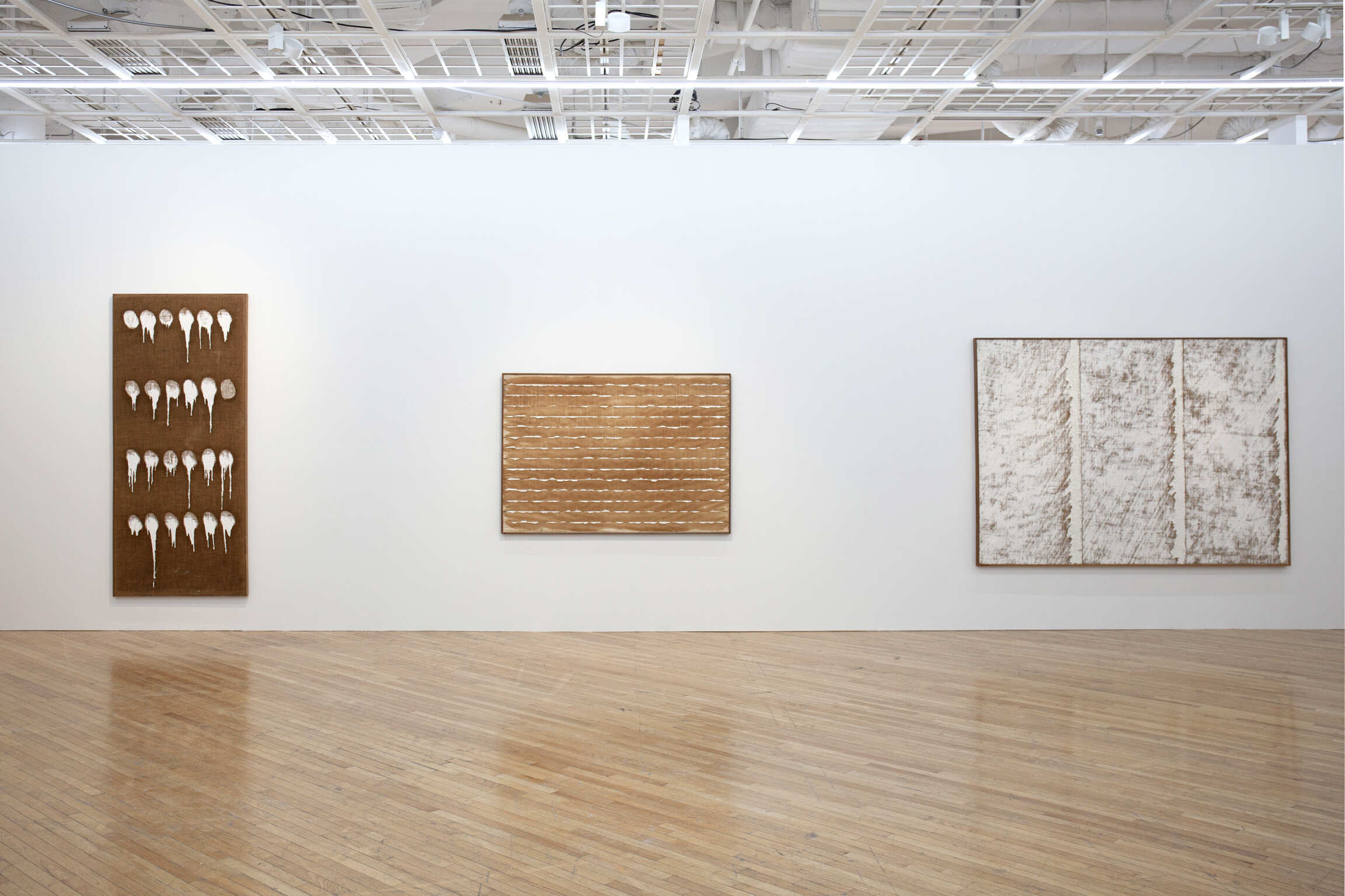 In 1974, Ha Chong-Hyun embarked on the series Conjunction, which began with the question of how it might be possible to transport the effects of his three-dimensional experiments onto two-dimensional surfaces. He devised the approach known as baeapbeop (the back-pressure method), which involved using loosely woven burlap sacks as canvases. Paint was generously applied to the reverse side and then pushed through the fabric using a large wooden scoop. The uniqueness of this technique lies in how a process initiated on the back of the canvas emerges as a result on its front. This approach of creating three-dimensional textures and depths as paint seeps through the burlap weave, transcends mere visual effect to embody a combination of materiality and the artist’s physical engagement with the medium. The Conjunction series arose from Ha’s ongoing efforts to experiment with two- and three-dimensional compositions and explore the boundaries of the painting medium. It remains an important series representative of Ha Chong-Hyun’s body of work, which has been continuing since 2010 under the title Post-Conjunction.