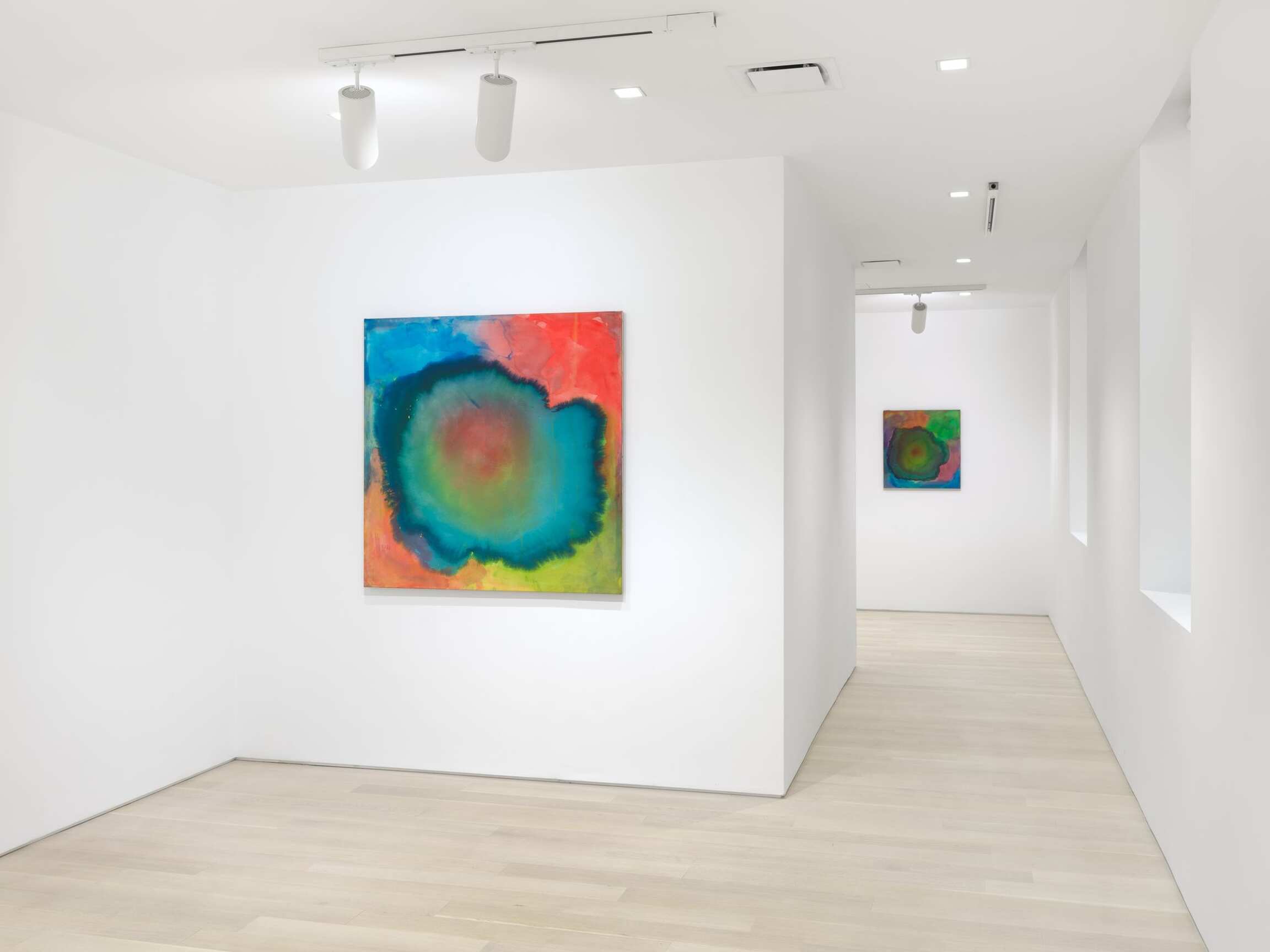 Much remains to be learned about Springford’s artistic practice and life. Though she left behind a significant body of work, she had an inexplicably limited exhibition history. After her early recognition through the two commercial solo shows in the early 1960s, she never again had the ongoing support of a commercial gallery. To fill the gap, she became an early member of the various womens’ organizations and informal feminist movements, and was included in a few group exhibitions including the Women in the Arts show at the Brooklyn Museum in 1975. The “Washington Color School,” led by Louis and Kenneth Noland, is credited with promulgating the painting techniques that Springford employed, and she is also unavoidably connected to the canvas-penetrating technique of Helen Frankenthaler. This mode relied on thinly applied oil or, more often, acrylic-based washes on linen or canvas, allowing the pigments to soak into the substrate, and bleed out from loci of applied paint. But Springford’s methodology was far more complex and difficult than it looks, and her mastery of it will be the subject of analysis for years to come.
