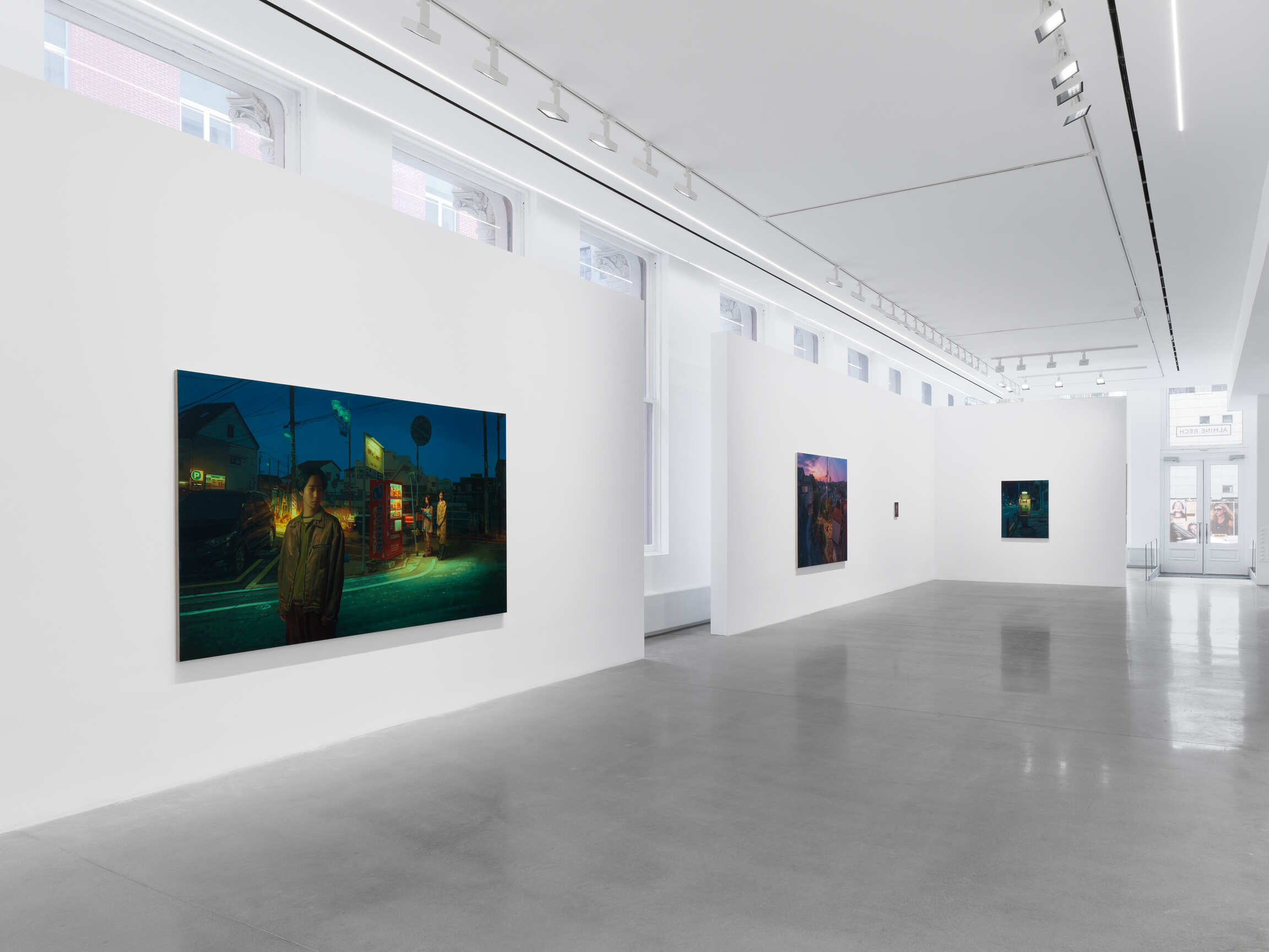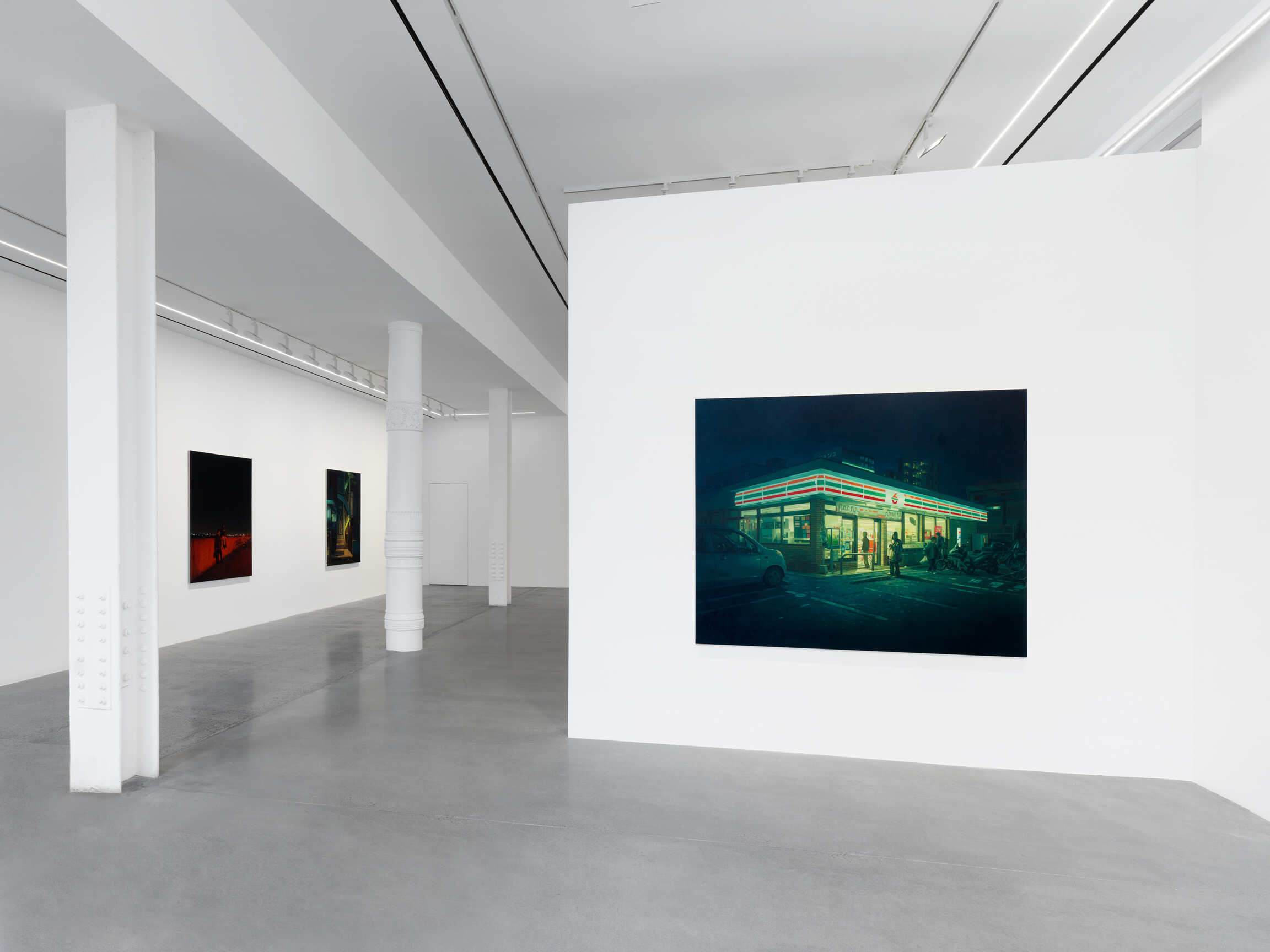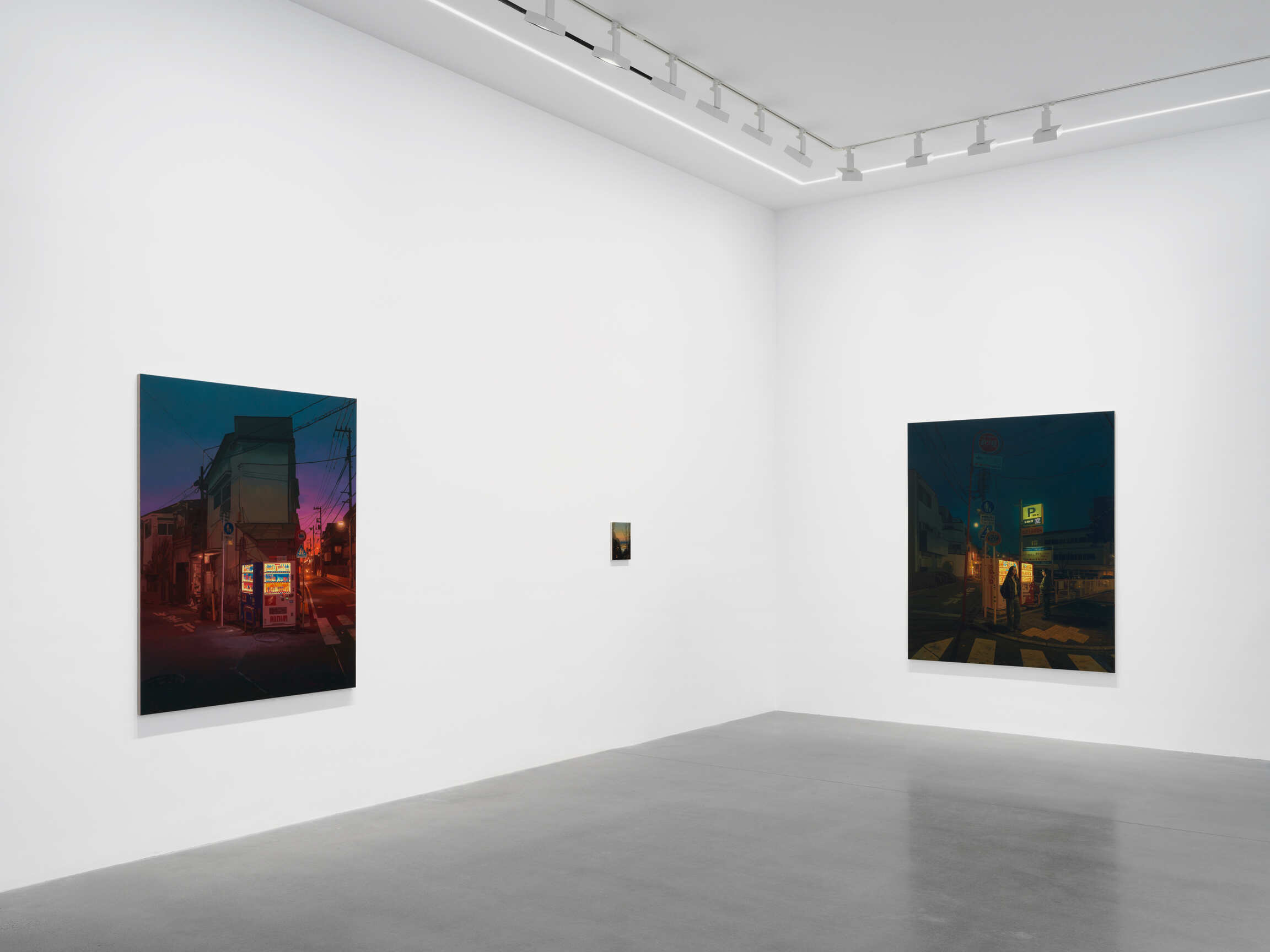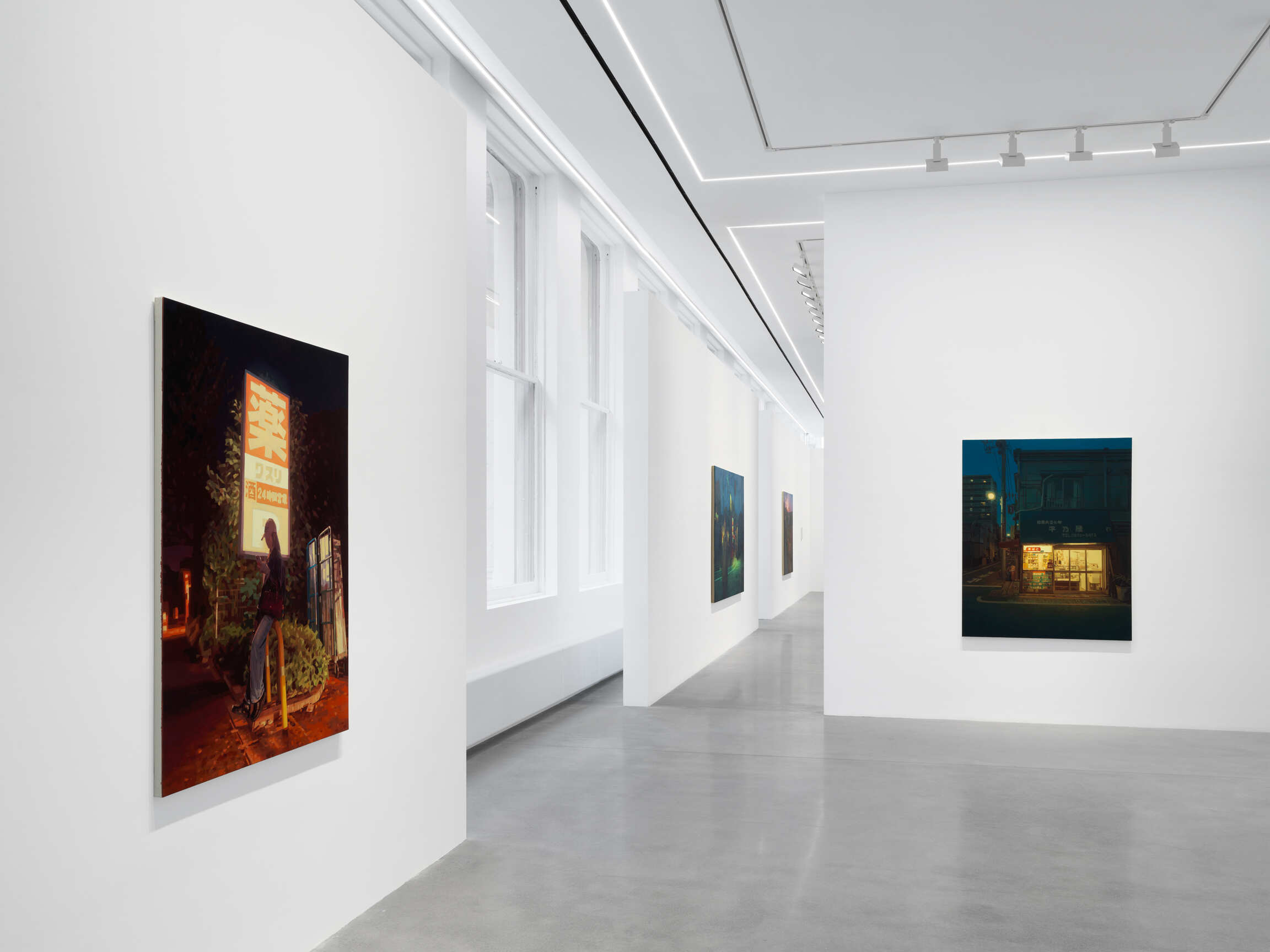 In 'To Nowhere and Back,' Morimoto captures the ephemeral allure of urban life while exploring more profound questions of identity, memory, and transcendence. These works are not merely windows into Morimoto’s world but mirrors reflecting our shared experiences of solitude, connection, and the fleeting beauty of modern life. Each exhibition Morimoto creates unfolds as a journey through the hidden corners of cityscapes—those overlooked spaces that become supernatural realms through Morimoto’s gaze. Whether it’s a convenience store glowing under fluorescent lights or a quiet street illuminated by a solitary lamp, although the city of Tokyo serves as the source material for the landscape that informs this body of work, Morimoto renders these locations into a familiar urban backdrop and a poetic narrative of light and shadow. The fluorescent glow becomes both a beacon and barrier, where illumination reveals and conceals. Morimoto’s use of light does more than create atmosphere; it underscores a sense of duality, highlighting contrasts between isolation and connection, between the ordinary and the extraordinary. Each painting serves as a physical and cerebral universe where viewers are invited to reflect on their experiences within these spaces of transit, both emotional and corporeal.