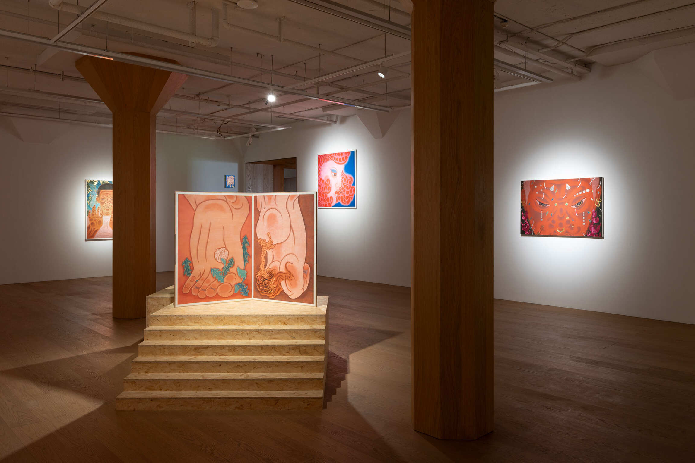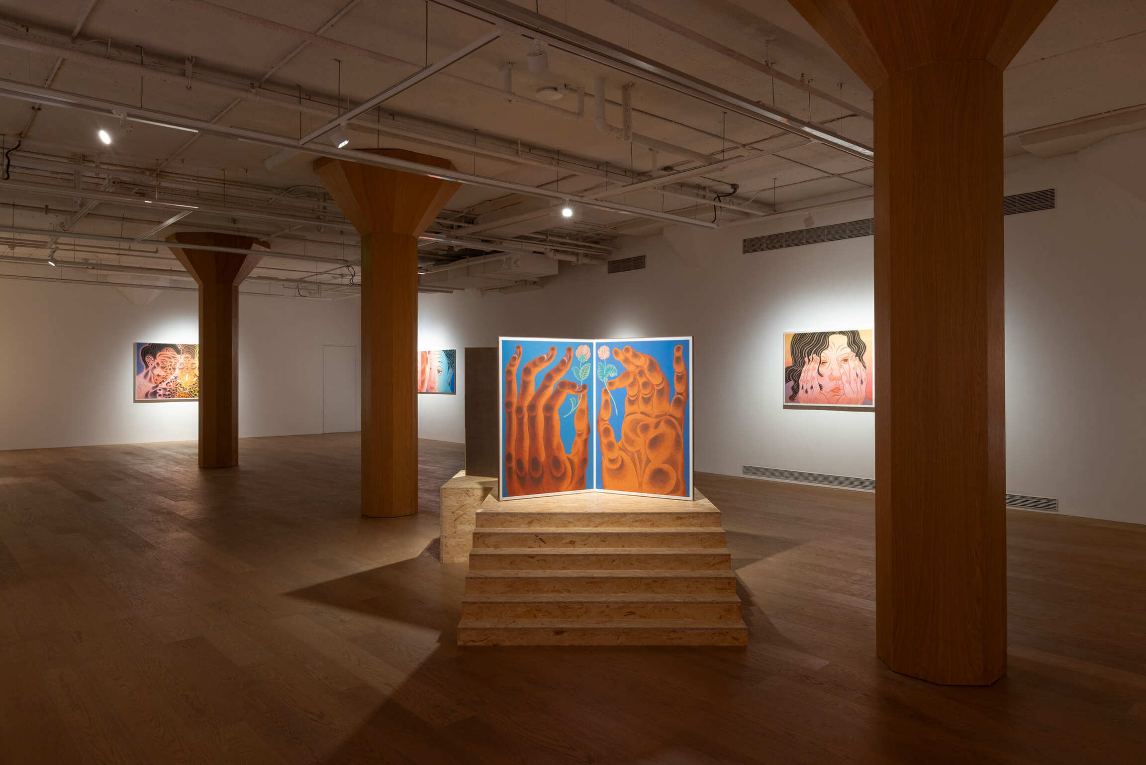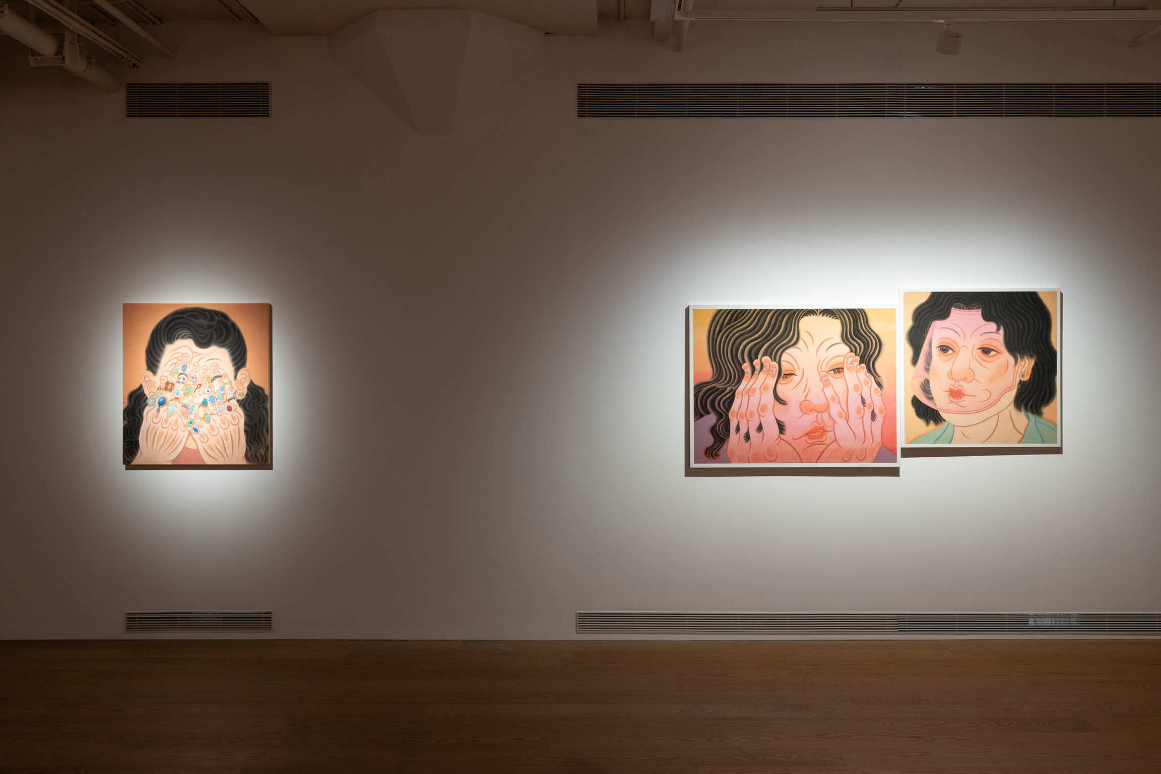 Since 2010, Tseng has been developing the Thousand Hands Project. Here, the will of the hand is extended more broadly. The phrase picking flowers and touching grass originally referred to fingertips lightly brushing against petals and leaves. However, in an urban context, it has transformed into a metaphor for desire. In two diptych series of Give or Take (2024) and Stampede (2024), Tseng seamlessly integrated the Baimiao linear technique of traditional Chinese Painting with the Concave-convex shading method found in Buddhist Art. This fusion not only subtly dissolves the visual hierarchy of weight and prominence, but also lends the compositions a greater sense of fluidity and openness. Hand is probing, plucking, and grasping while hesitating and releasing. Feet are wandering, treading, and seeking while also missing and losing their way. After prolonged immersion in the neon glow and fleeting romances of the city, hands and feet become tools driven by desire and guide the act of looking through touch and transgression. Drawing inspiration from Japanese Bijin-ga, Blush (2022) and Sunset Soda (2024) directly confront how feminine softness resists the traditional imagery of beauty. The drooping eyelids, evoking exhaustion, and the subtly downturned lips, suggesting aging, transform the ethereal aura of Bijin-ga into a distinctly feminine, negative aesthetic. Although the commodified ideal of beauty still anticipates the “female gaze,” Tseng has already exposed the power dynamics between seeing and being seen. This compels viewers to recognize their own act of looking. In this interplay of “watching” and “being watched,” the viewer waver, which mirrors the psychological tension of the onlooker caught between engagement and detachment, and ultimately points to the multifaceted contradictions of identity.