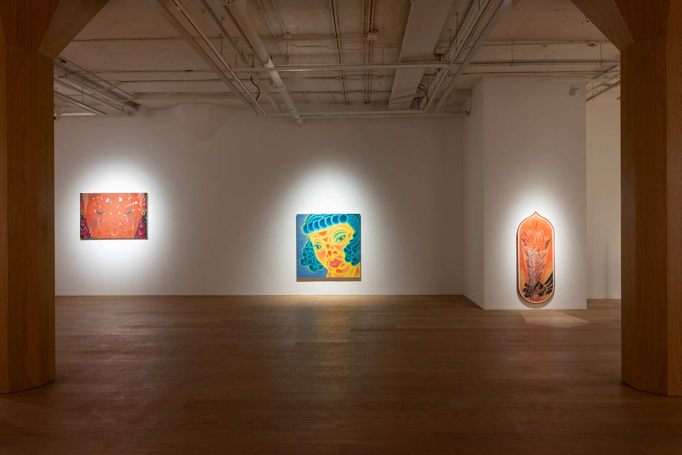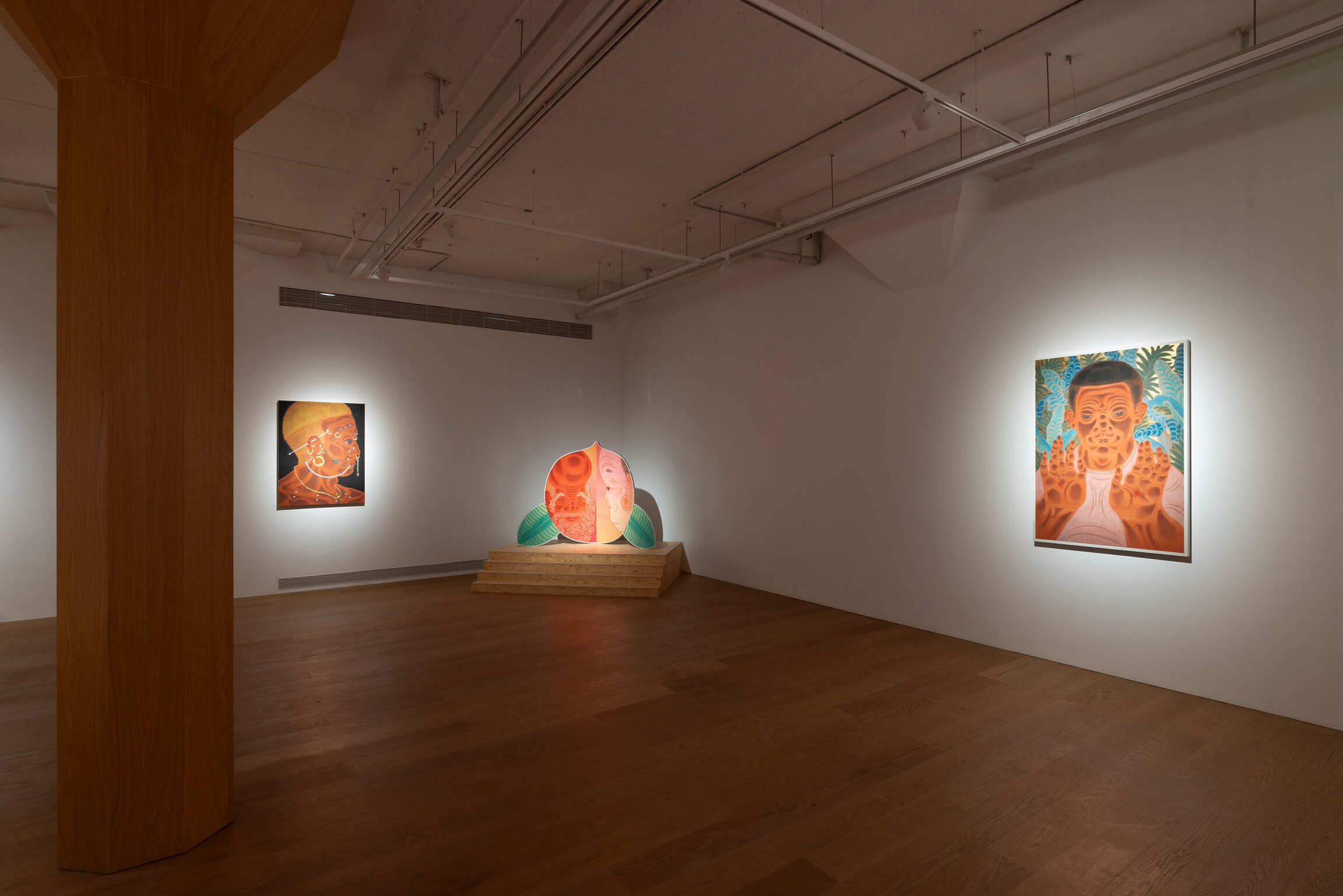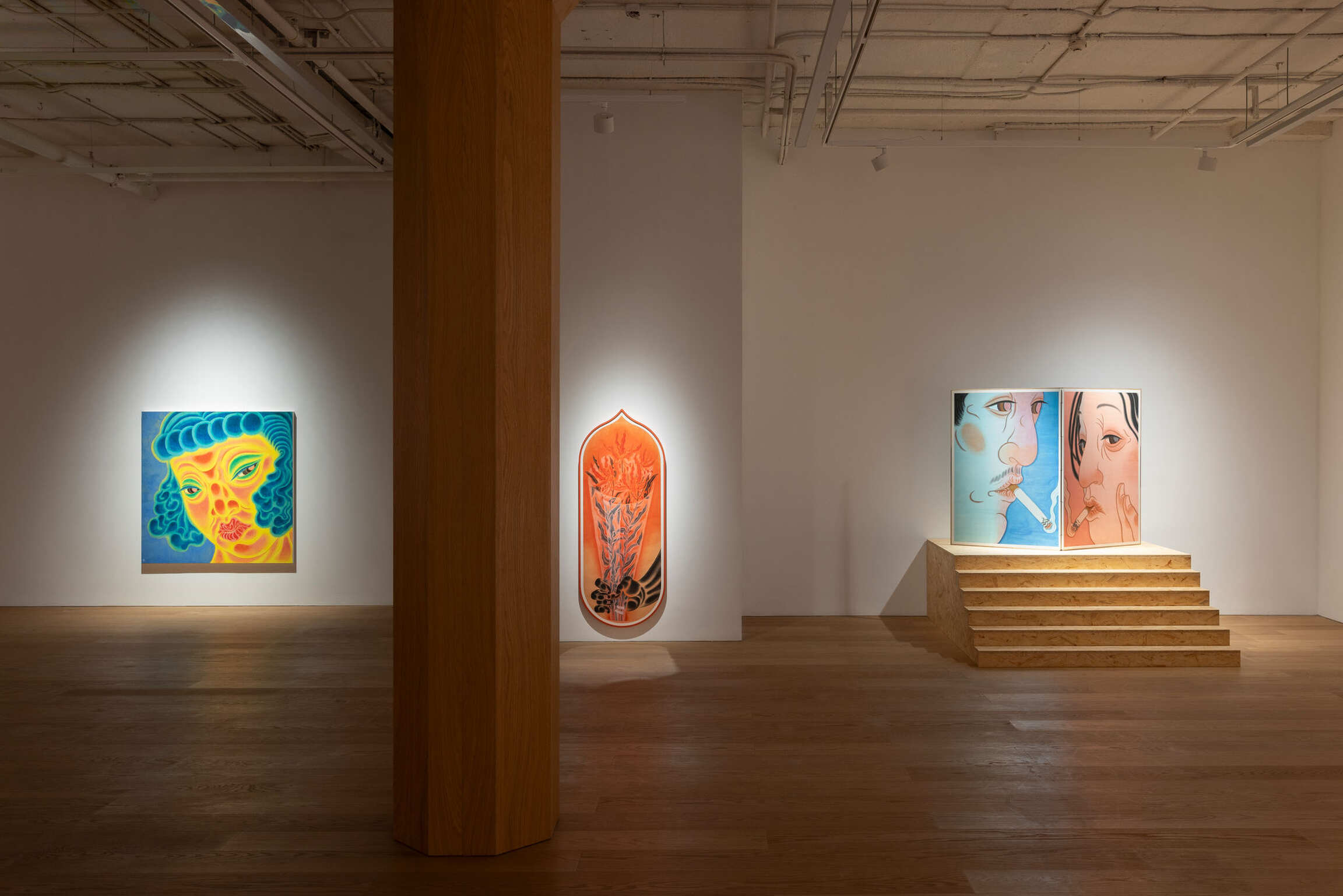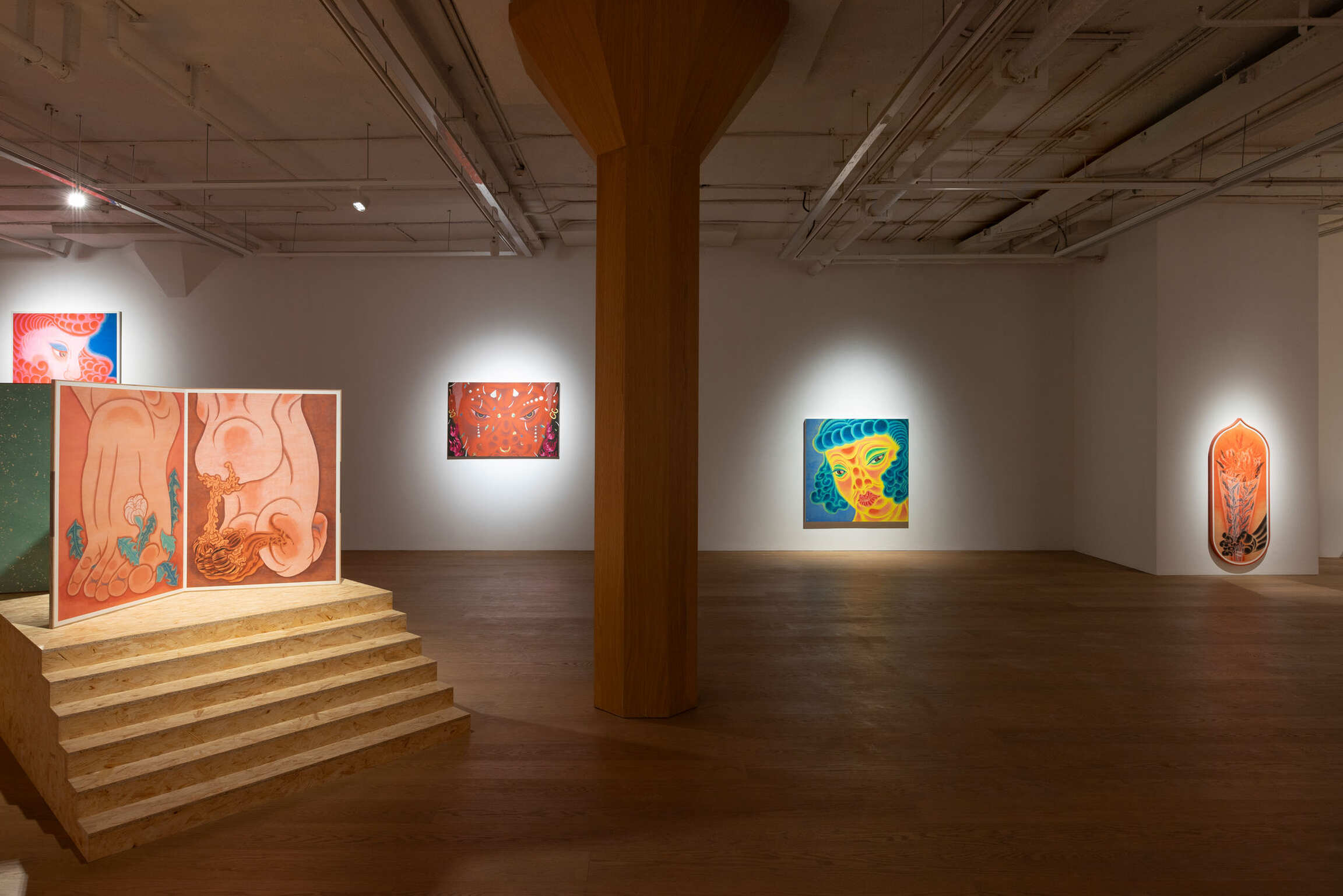 Since 2010, Tseng has been developing the Thousand Hands Project. Here, the will of the hand is extended more broadly. The phrase picking flowers and touching grass originally referred to fingertips lightly brushing against petals and leaves. However, in an urban context, it has transformed into a metaphor for desire. In two diptych series of Give or Take (2024) and Stampede (2024), Tseng seamlessly integrated the Baimiao linear technique of traditional Chinese Painting with the Concave-convex shading method found in Buddhist Art. This fusion not only subtly dissolves the visual hierarchy of weight and prominence, but also lends the compositions a greater sense of fluidity and openness. Hand is probing, plucking, and grasping while hesitating and releasing. Feet are wandering, treading, and seeking while also missing and losing their way. After prolonged immersion in the neon glow and fleeting romances of the city, hands and feet become tools driven by desire and guide the act of looking through touch and transgression. Drawing inspiration from Japanese Bijin-ga, Blush (2022) and Sunset Soda (2024) directly confront how feminine softness resists the traditional imagery of beauty. The drooping eyelids, evoking exhaustion, and the subtly downturned lips, suggesting aging, transform the ethereal aura of Bijin-ga into a distinctly feminine, negative aesthetic. Although the commodified ideal of beauty still anticipates the “female gaze,” Tseng has already exposed the power dynamics between seeing and being seen. This compels viewers to recognize their own act of looking. In this interplay of “watching” and “being watched,” the viewer waver, which mirrors the psychological tension of the onlooker caught between engagement and detachment, and ultimately points to the multifaceted contradictions of identity.