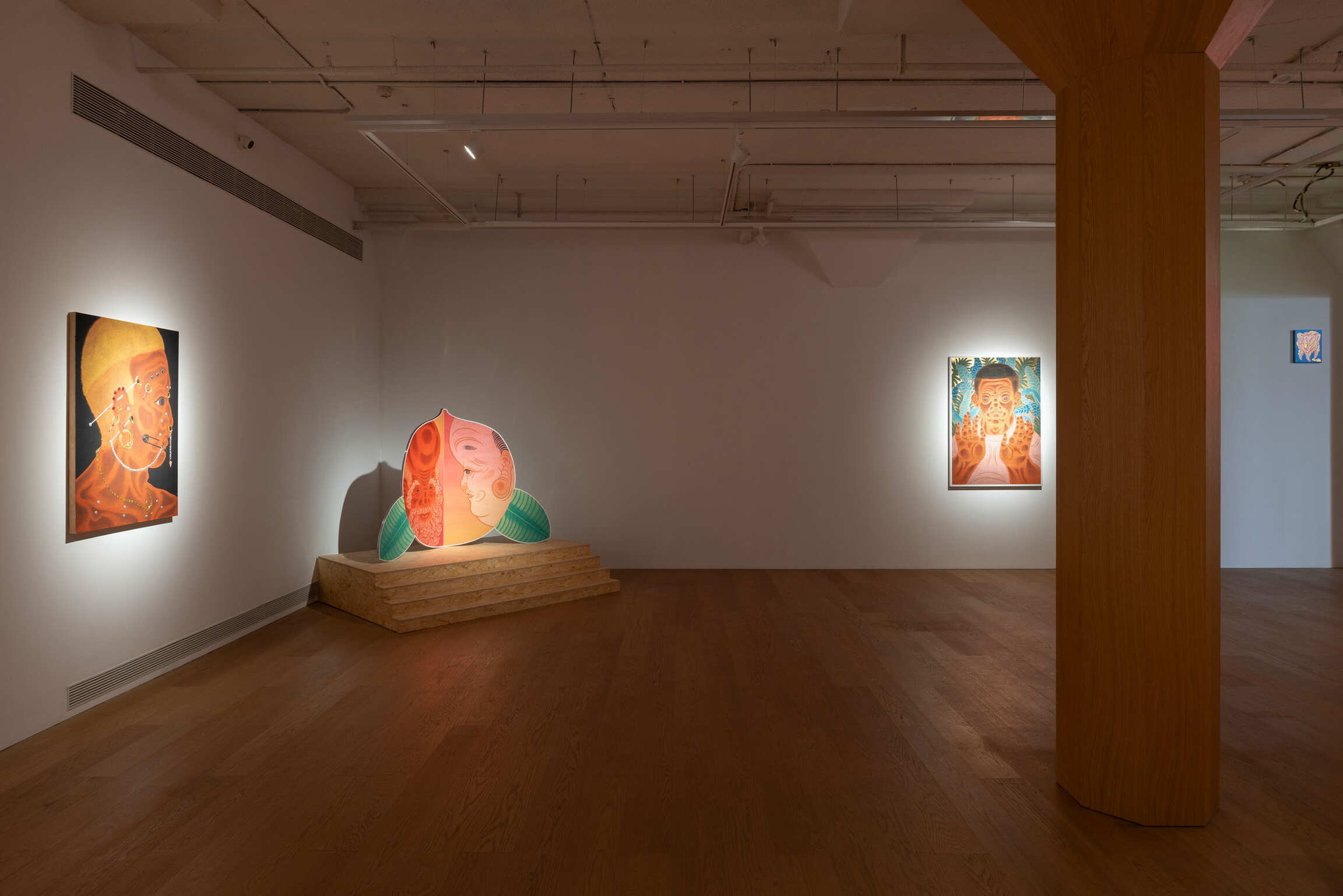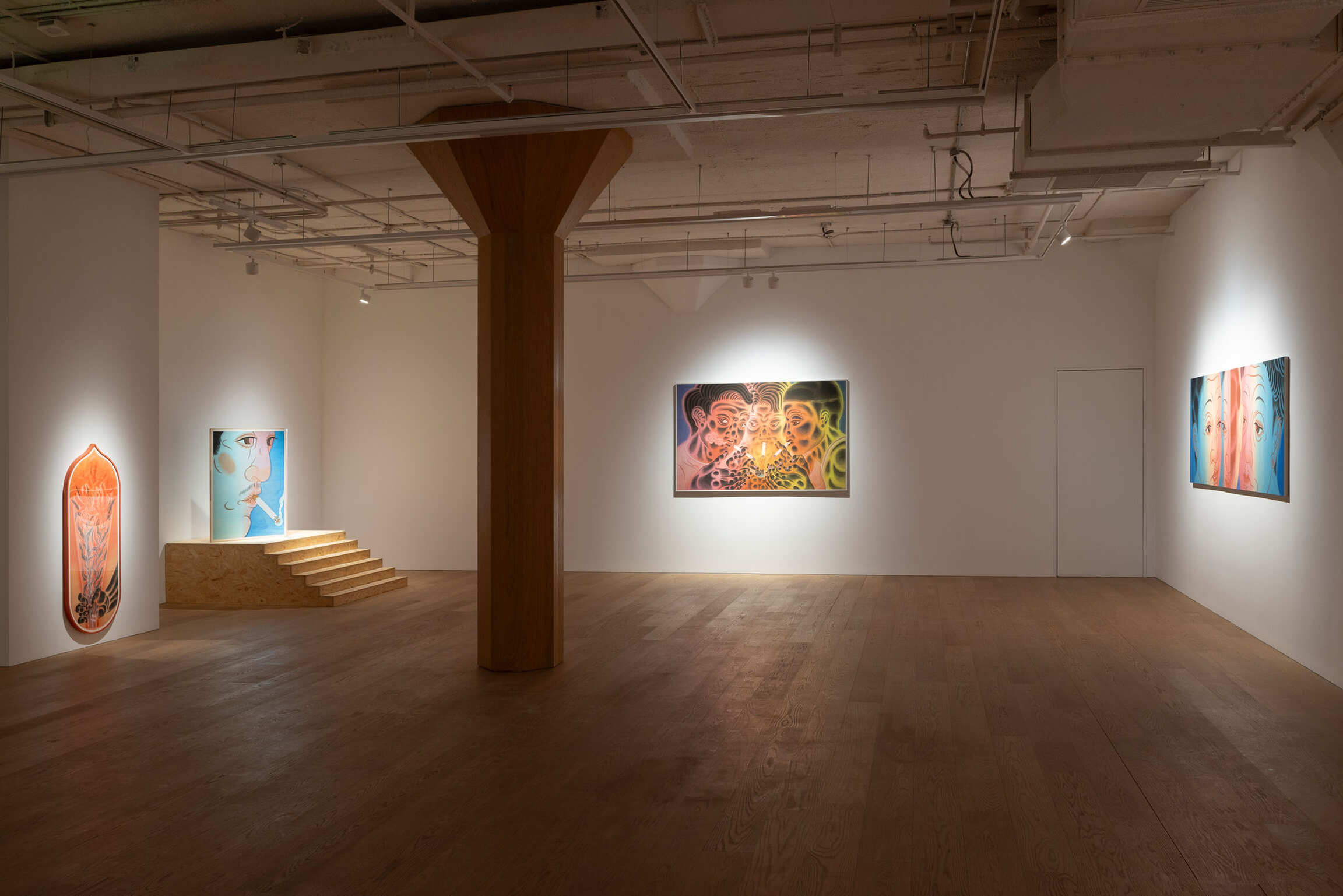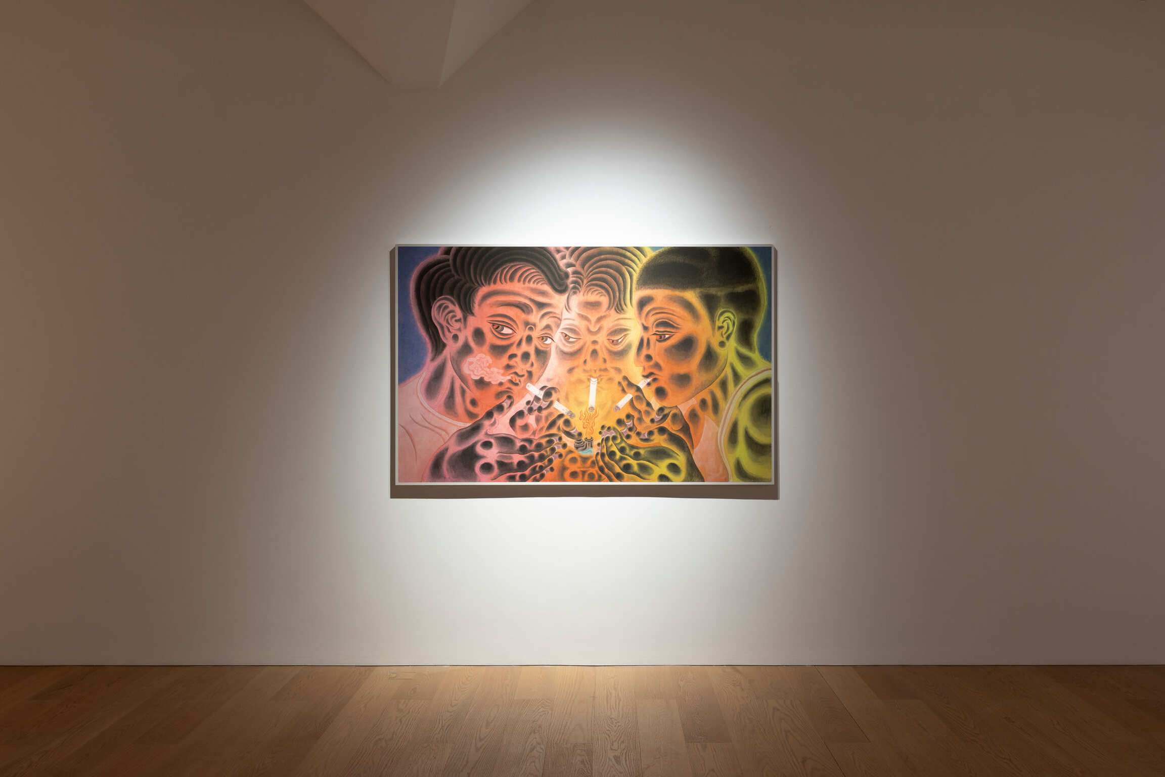 In settings of group entertainment, smoking has become an implicit medium to establish connections and seek a sense of belonging. The moment of lighting a cigarette, the gaze met in the smoke, and the silent communication between inhales and exhales most vividly reflect the psychological needs and social interactions of urban dwellers. In Threesome (2022), Tseng portrays the act of lighting a cigarette as both an individual’s conscious pursuit of social belonging as well as a group’s unconscious response to identity recognition. Smoking as a social act may not necessarily aim to forge deep connections. Rather, it’s like Spectrum (2024), where mirrored, almost performative gestures serve as a mean to observe others’ presence and affirm one’s own position within social space. Similarly, when adornment is no longer merely an accessory on the body’s surface but instead pierces the skin, jewelry and ornaments transcend mere decoration. In the Bystander (2024) series, the Moriage technique is leveraged. Meanwhile, the layered application of paint and metal foil lends a strong sense of dimensionality to the embellishments, giving inlay a renewed visual language. The so-called “glorious pain” has become a symbol of identity for urban subculture youth: the moment of piercing breaks the boundaries of the body, and adornments serve as guiding needles through which they forge communal bonds via the sensation of pain. When the cold rigidity of metal is contrasted with the softness of the body, they strive for individuality yet rely on collective recognition, crave extravagant expression, and meanwhile use it to maintain emotional connections.