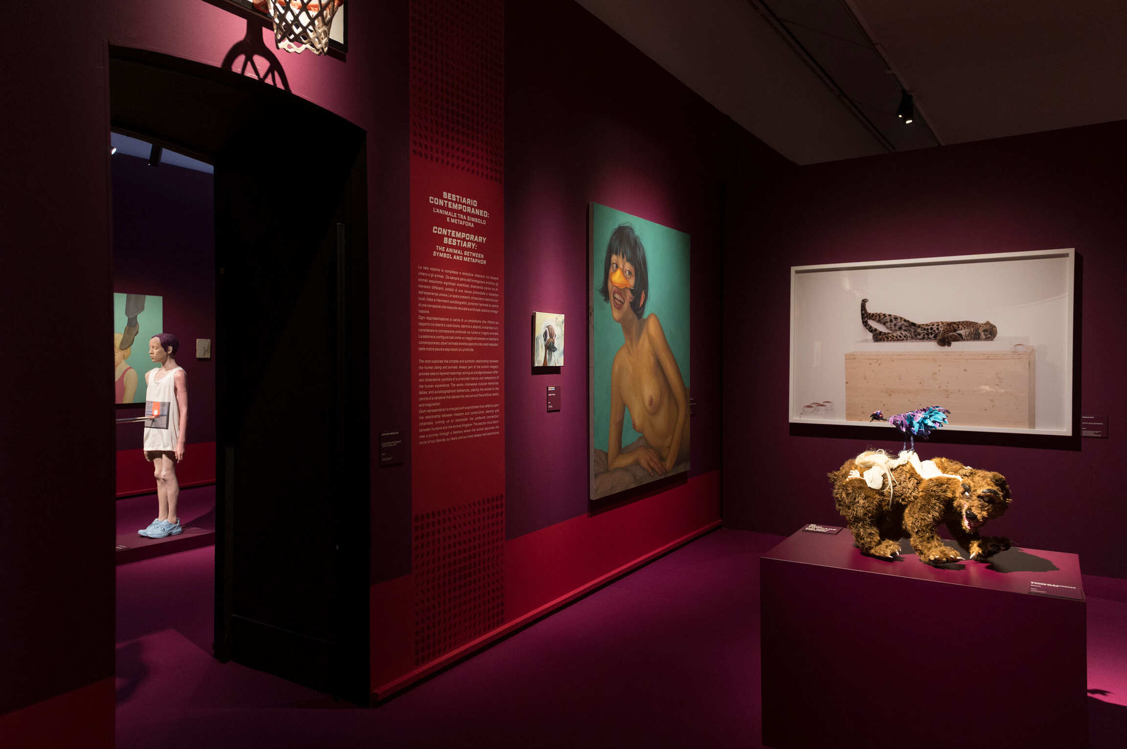 In contrast, the paintings by Lisa Yuskavage and Chloe Wise combine references to animals with human figures in sensual and provocative compositions. In Yuskavage's Small Walking the Dog (2009), an everyday gesture such as walking the dog takes on an erotic and ambiguous connotation, while Wise in Olivia with duck mask (2023) adds an ironic and playful touch. The duck mask worn by the female figure is transformed into a surreal element that reflects on identity and metamorphosis, dialoguing within the room with Pierpaolo Campanini's painting Senza titolo (1993), which uses the same animal but within a more intimate and contemplative painting, capable of evoking a sense of mystery and expectation.