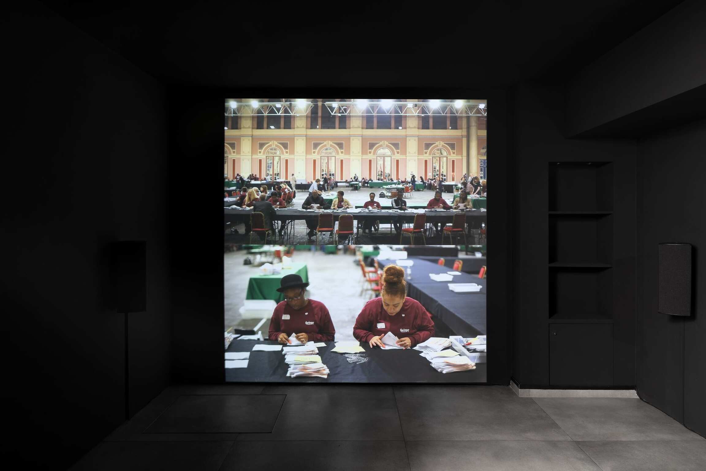 Their expressive restraint and apparent simplicity feigns neutrality but reveals a deeper disquiet: Simon dissects the staging of power without interrupting its spectacle. For what the artist invites us to see are the elements of a vast game—the workings of a democratic system turned performative, where power is measured in scores and consumed as symbols. Conceived as devices as much as images, these works set in motion a discreet dynamic, in which both the subjects and the spectators become participants, silent players, bound in a visual grammar with implicit rules. One of her photographs captures a cluster of red, white, and blue balloons, all gleaming, suspended in anticipation of the ceremonial climax of an electoral event. Just a detail—yet everything is there: the patriotic colors of unity, the aesthetics of victory, the superficiality of a ritual that seeks to ordain.